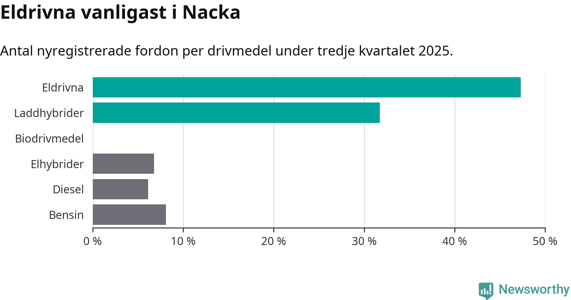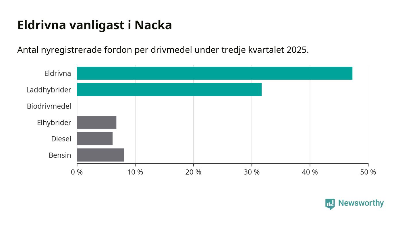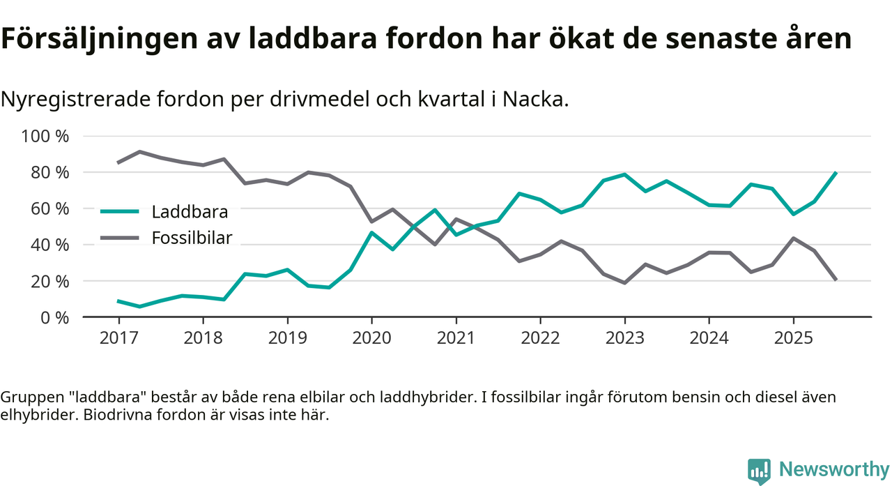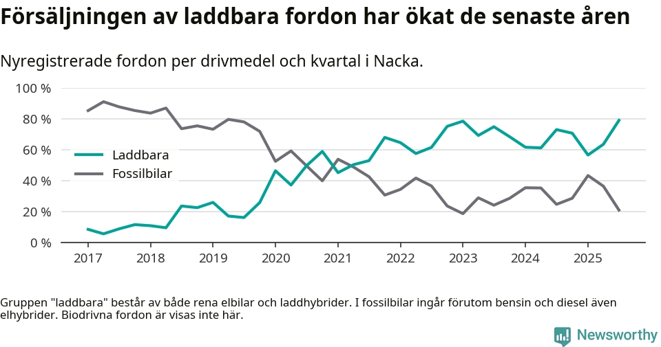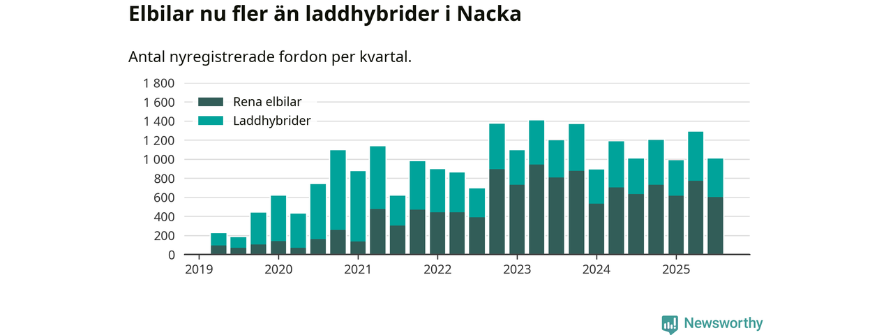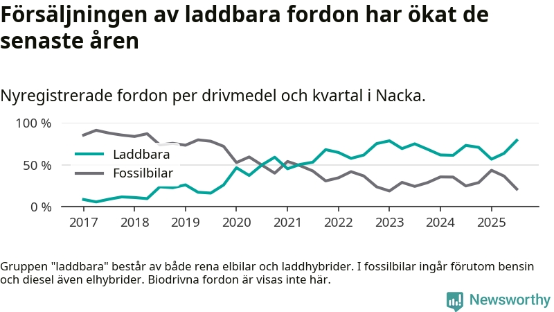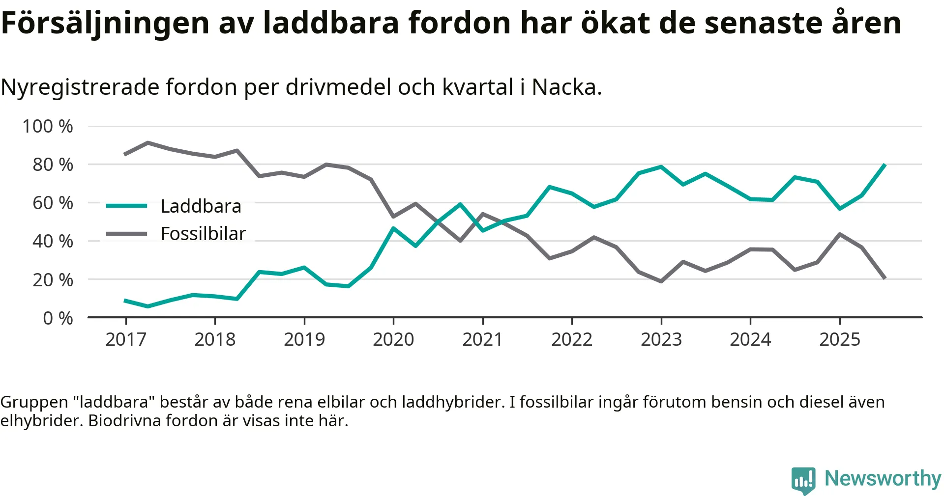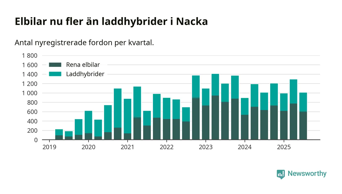 Under tredje kvartalet 2025 var 79 procent av alla nyregistrerade personbilar i Nacka laddbara (sammanlagt registrerades 1 271 nya bilar). Merparten av de laddbara bilarna var rena elbilar (47 procent av alla).