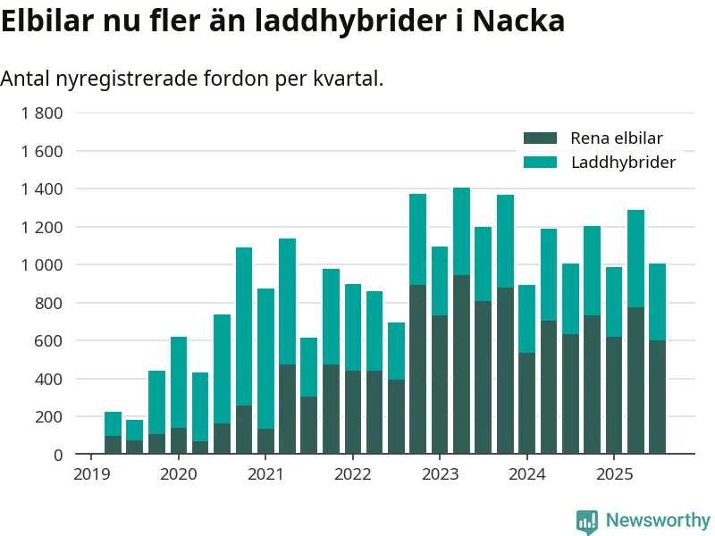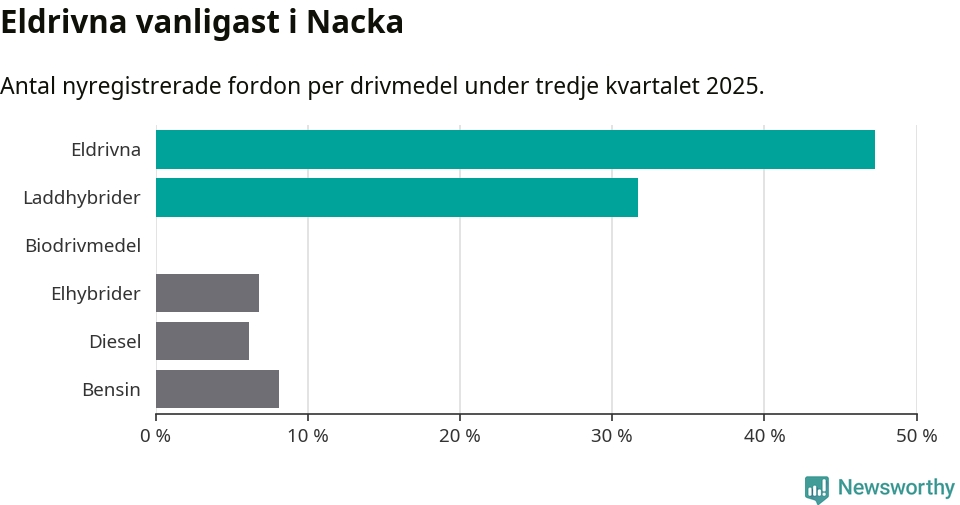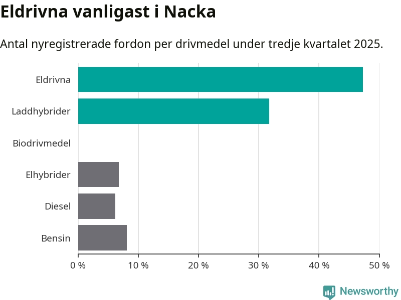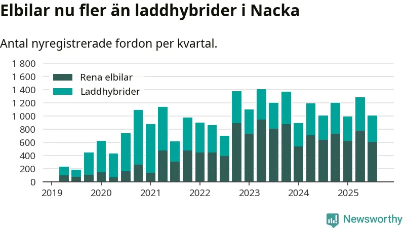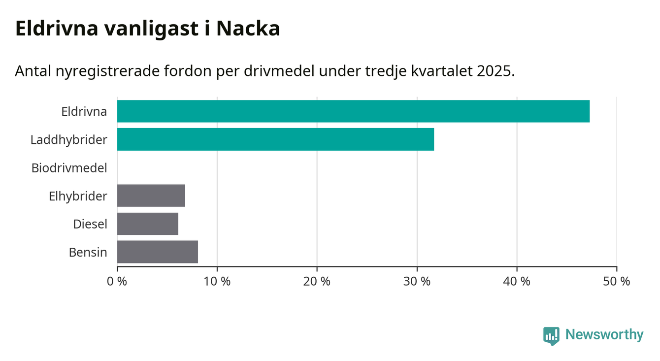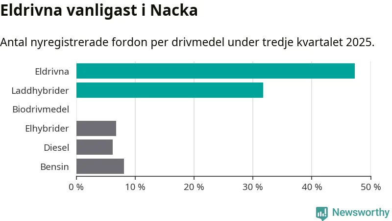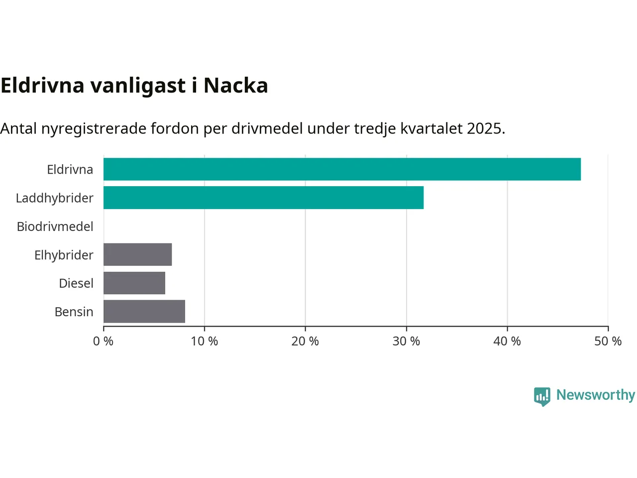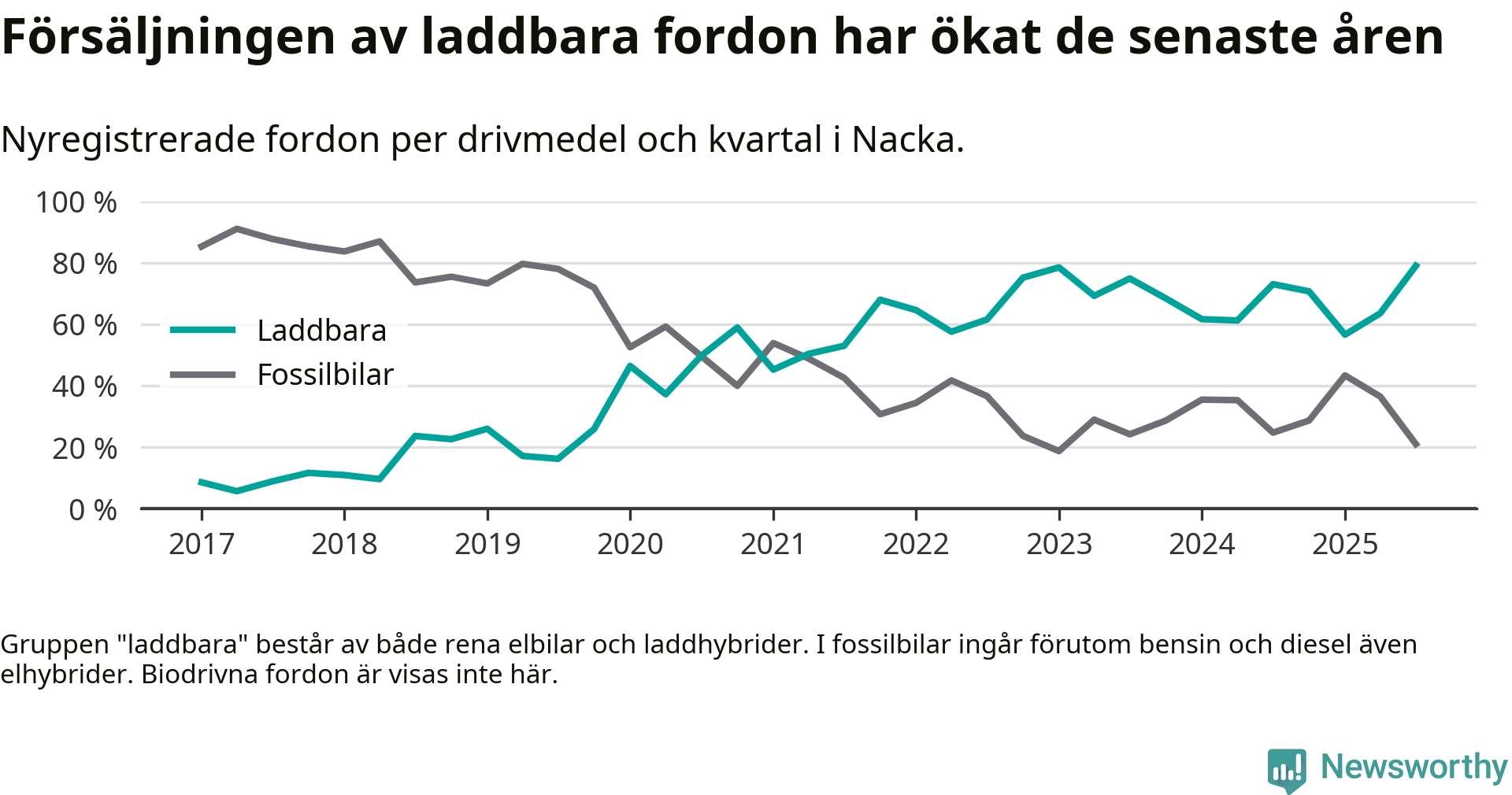Under tredje kvartalet 2025 var 79 procent av alla nyregistrerade personbilar i Nacka laddbara (sammanlagt registrerades 1 271 nya bilar). Merparten av de laddbara bilarna var rena elbilar (47 procent av alla).