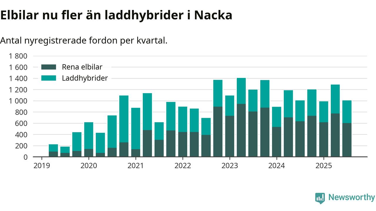 Under tredje kvartalet var åtta av tio nyregistrerade bilar i Nacka kommun rena elbilar eller laddhybrider. Det är fler än något kvartal tidigare. I riket däremot minskade andelen laddbara bilar något. Framför allt elbilsförsäljningen har tappat fart.