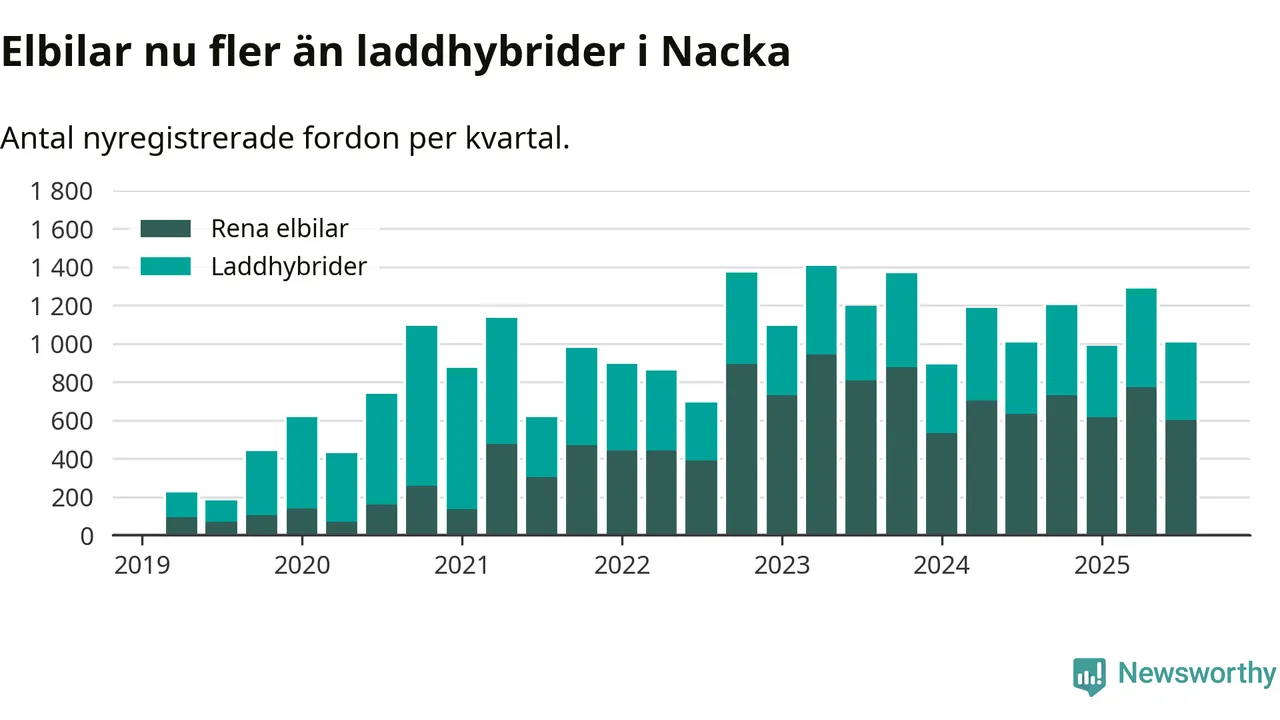 I Nacka noterades ett nytt rekord under tredje kvartalet. Aldrig tidigare har laddbara bilar utgjort en så stor del av alla nya bilar.