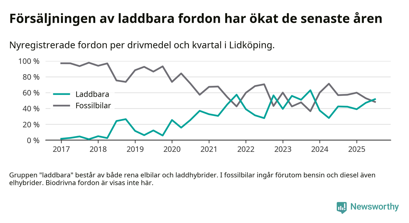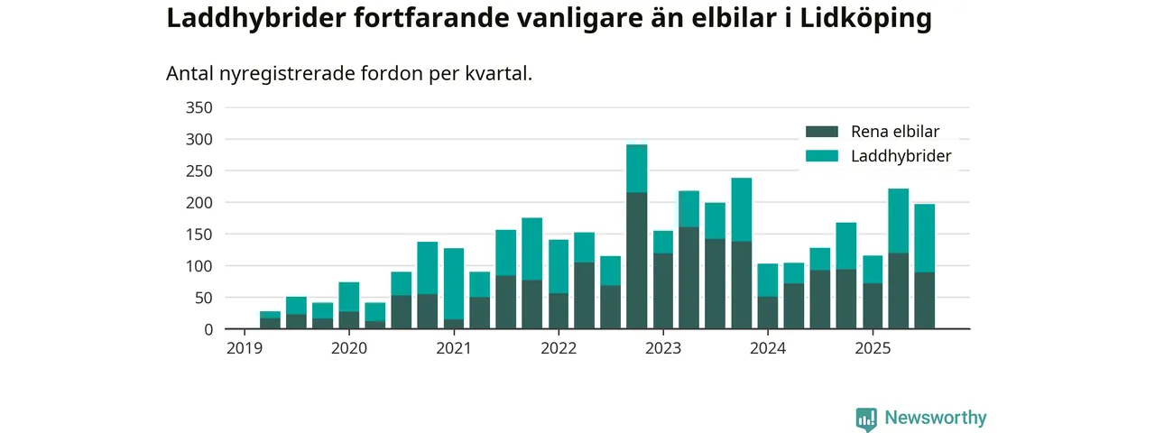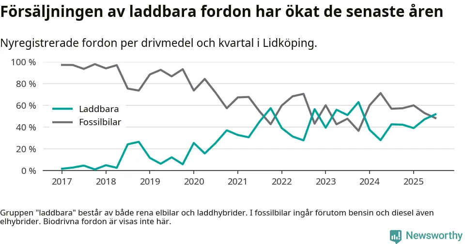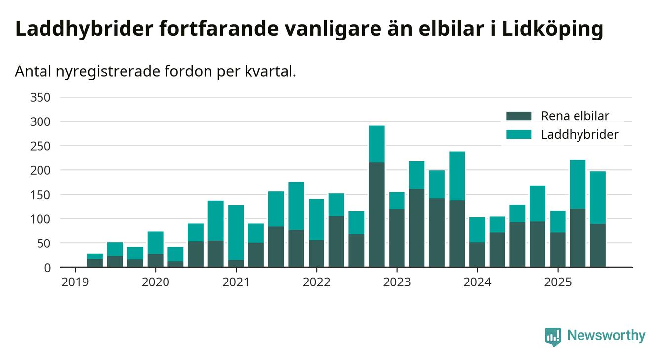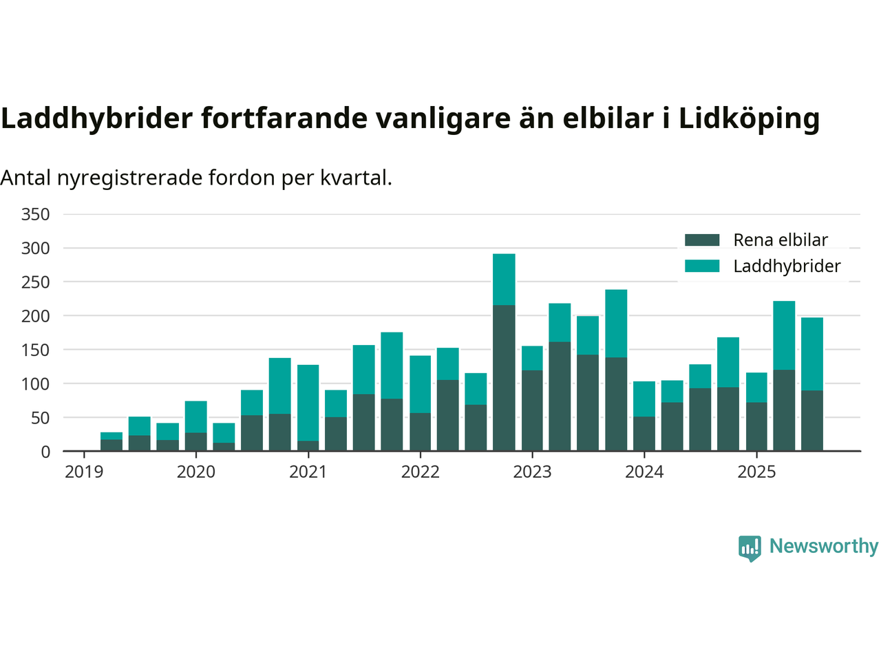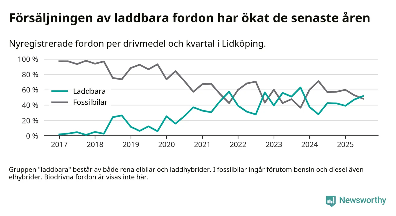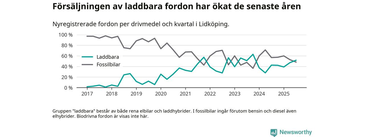 Under tredje kvartalet var hälften av alla nyregistrerade bilar i Lidköpings kommun rena elbilar eller laddhybrider, en ökning jämfört med kvartalet innan. I riket däremot minskade andelen laddbara bilar något. Framför allt elbilsförsäljningen har tappat fart.