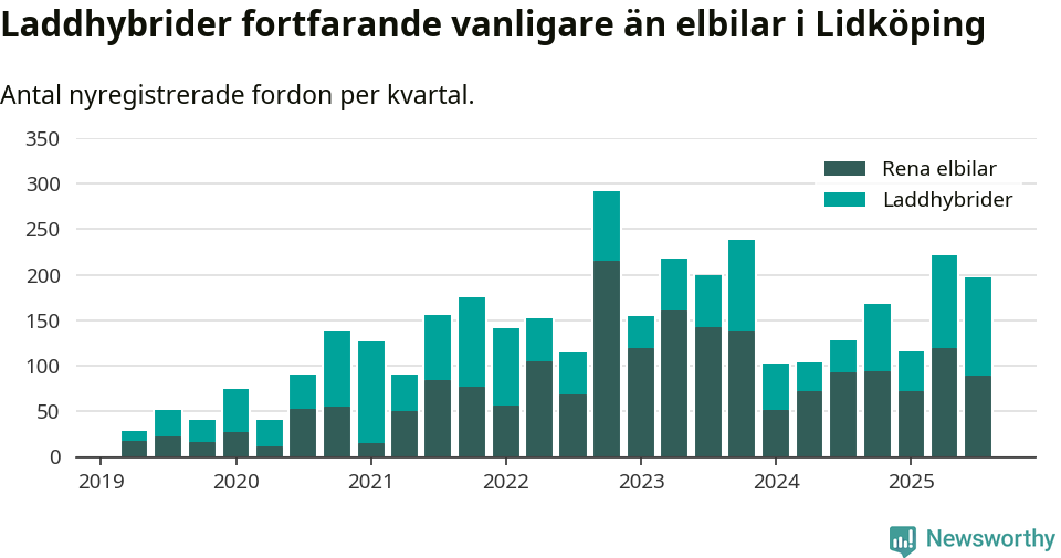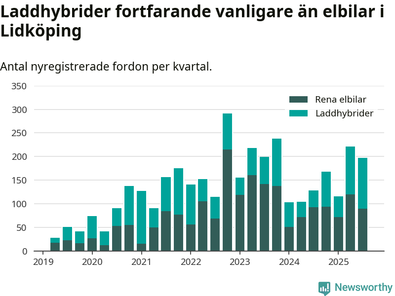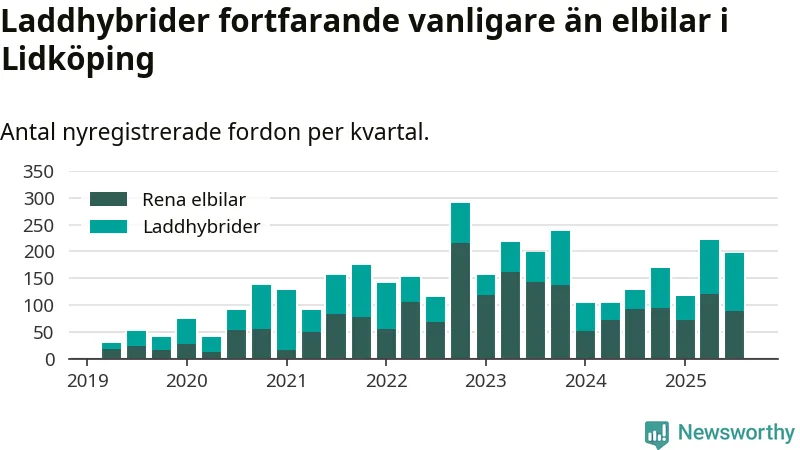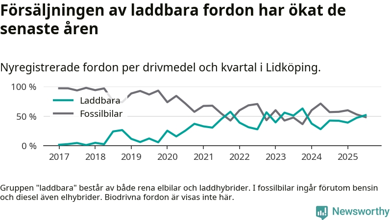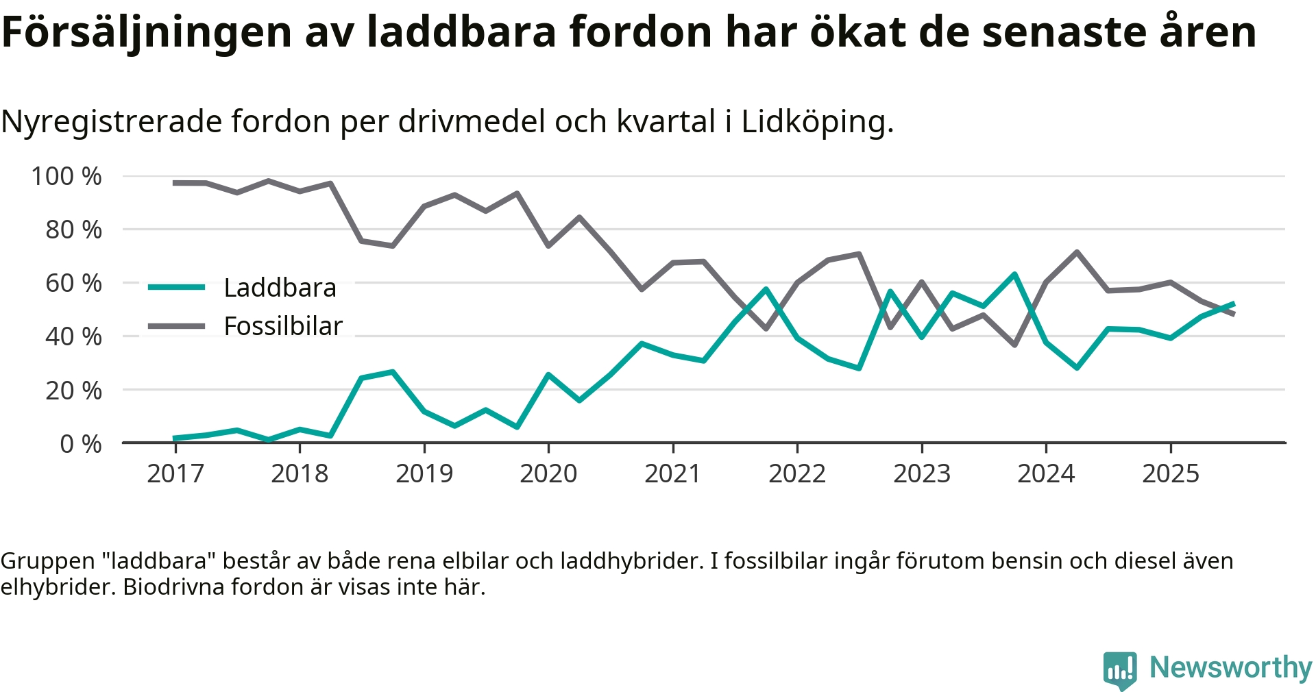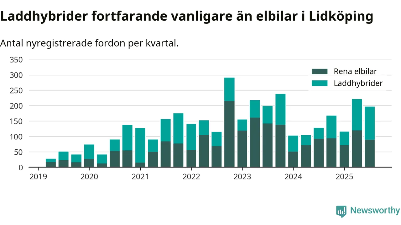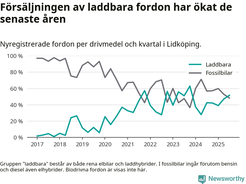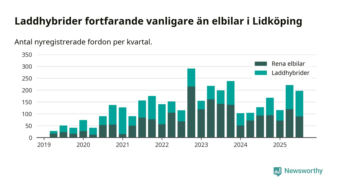 Under tredje kvartalet var hälften av alla nyregistrerade bilar i Lidköpings kommun rena elbilar eller laddhybrider, en ökning jämfört med kvartalet innan. I riket däremot minskade andelen laddbara bilar något. Framför allt elbilsförsäljningen har tappat fart.
