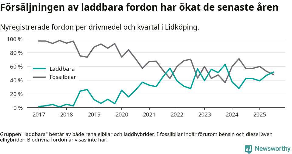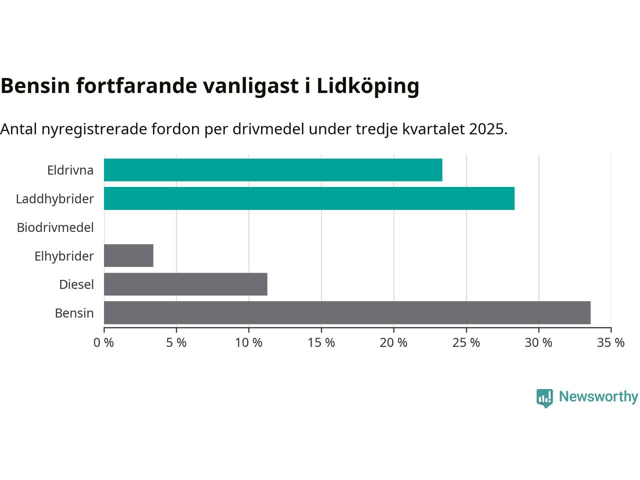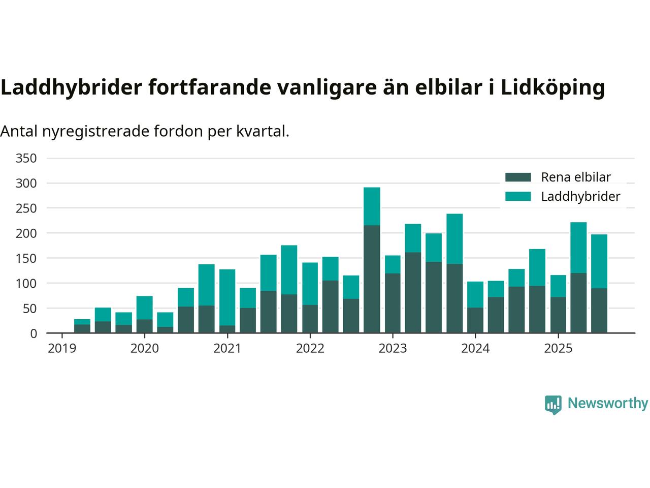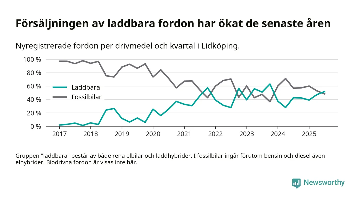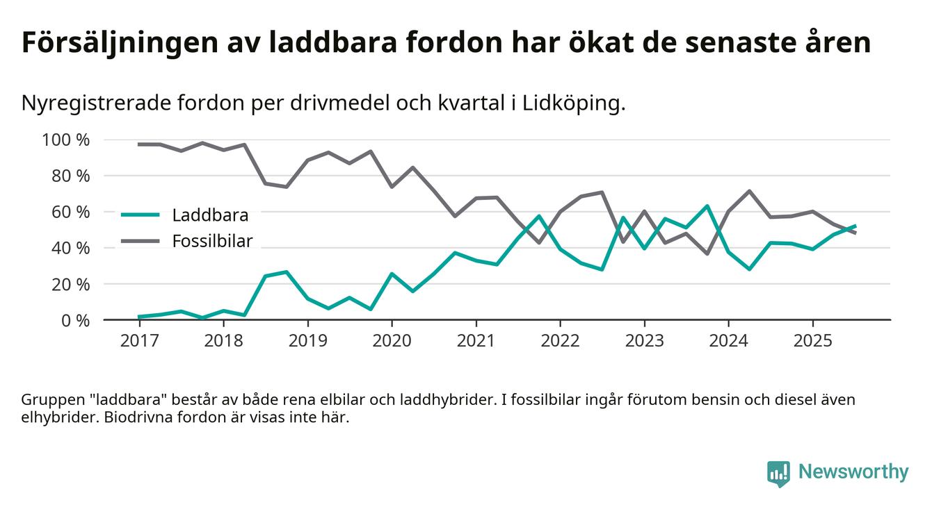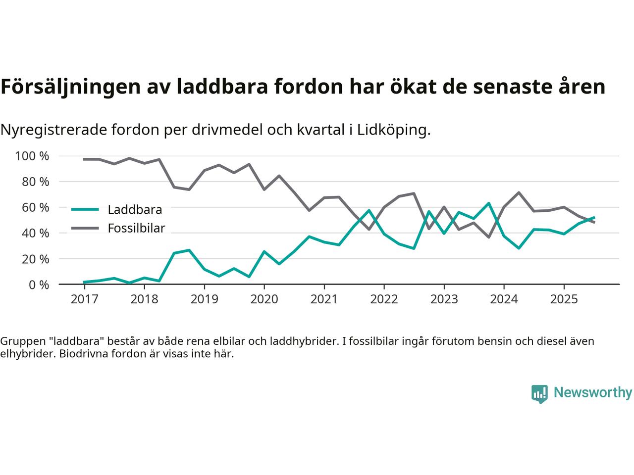 Under tredje kvartalet 2025 var 52 procent av alla nyregistrerade personbilar i Lidköping laddbara (sammanlagt registrerades 381 nya bilar). Merparten av de laddbara bilarna var så kallade laddhybrider, det vill säga fordon som går att ladda och köra på el, men som även har en förbränningsmotor. 23 procent av alla nya bilar var rena elbilar.