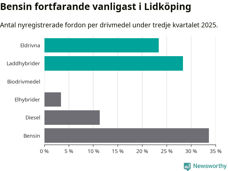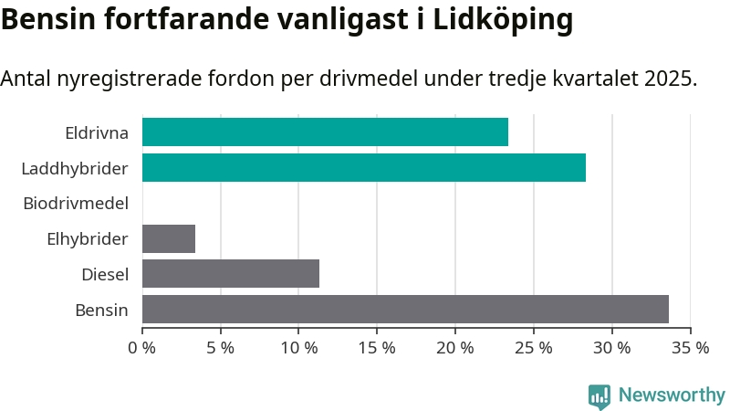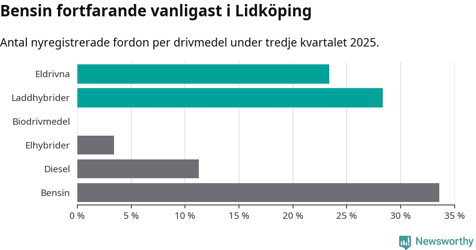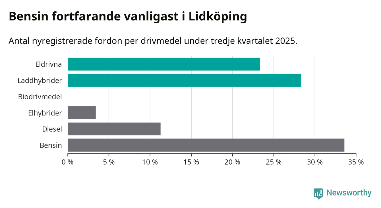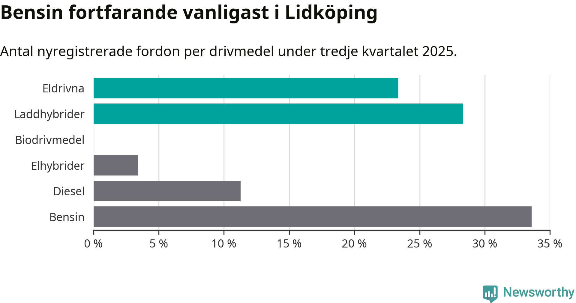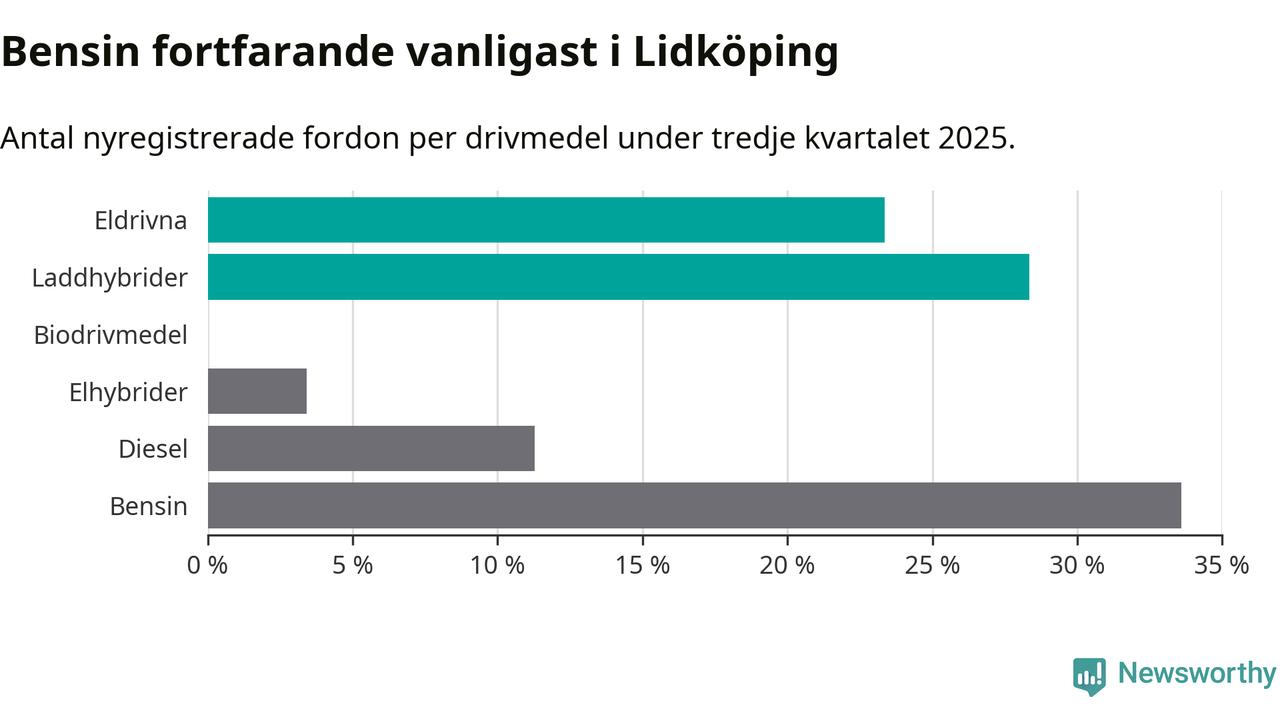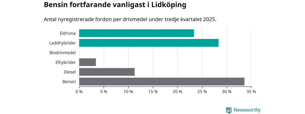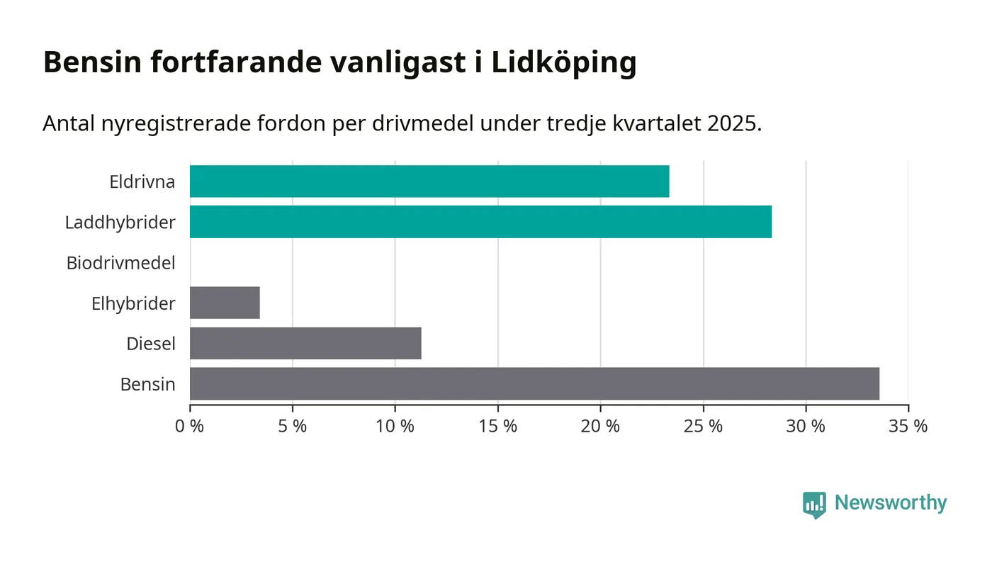Under tredje kvartalet 2025 var 52 procent av alla nyregistrerade personbilar i Lidköping laddbara (sammanlagt registrerades 381 nya bilar). Merparten av de laddbara bilarna var så kallade laddhybrider, det vill säga fordon som går att ladda och köra på el, men som även har en förbränningsmotor. 23 procent av alla nya bilar var rena elbilar.
