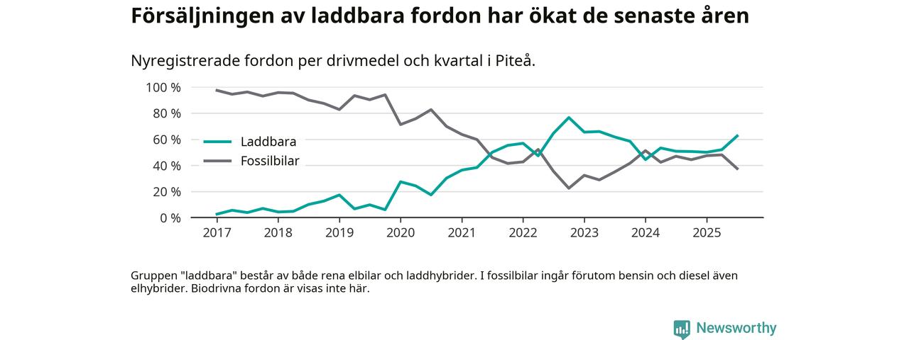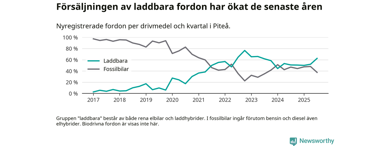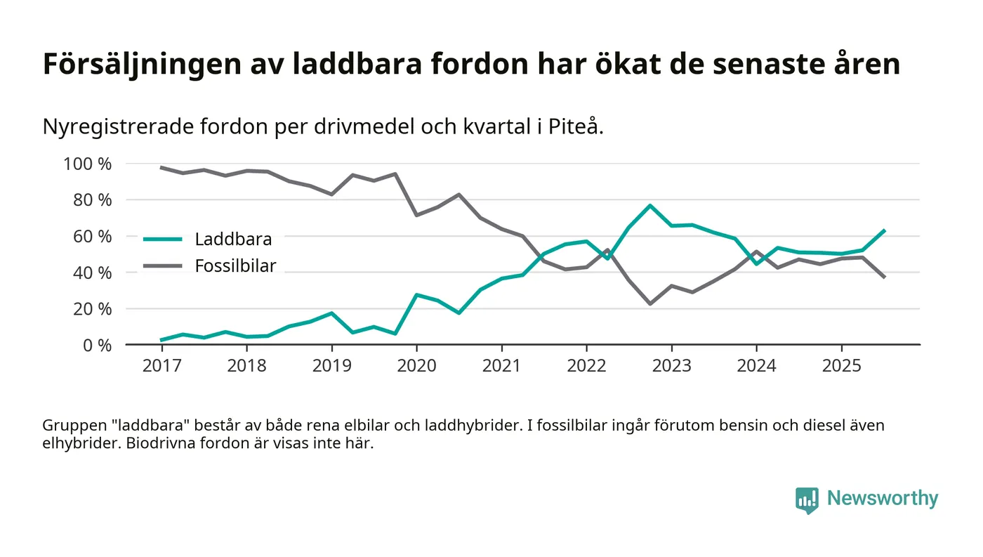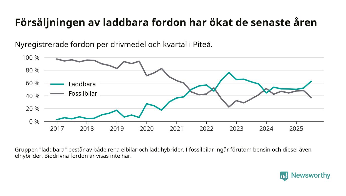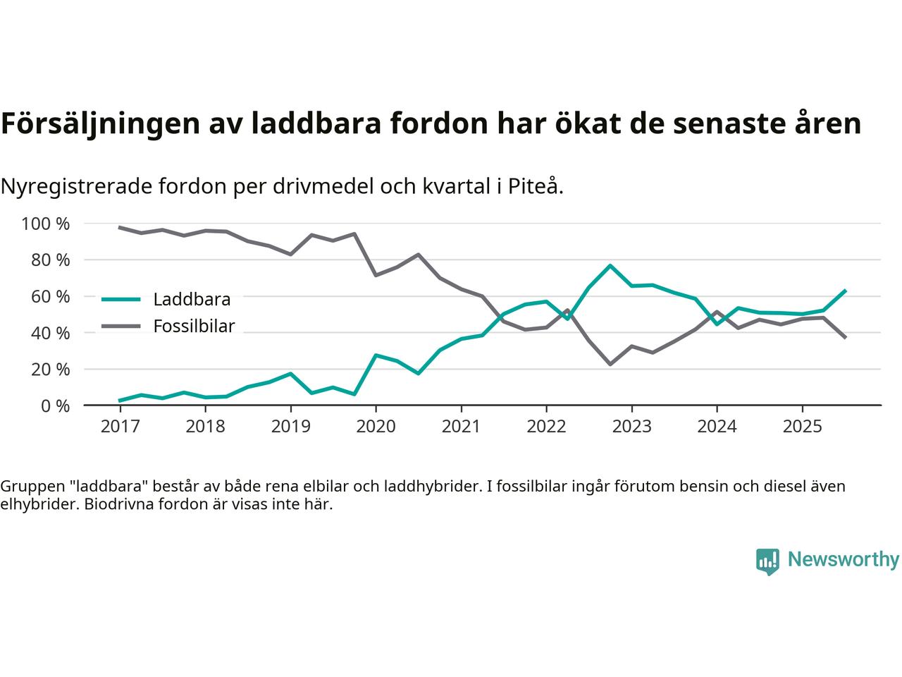 Under tredje kvartalet 2025 var 63 procent av alla nyregistrerade personbilar i Piteå laddbara (sammanlagt registrerades 120 nya bilar). Merparten av de laddbara bilarna var rena elbilar (45 procent av alla).