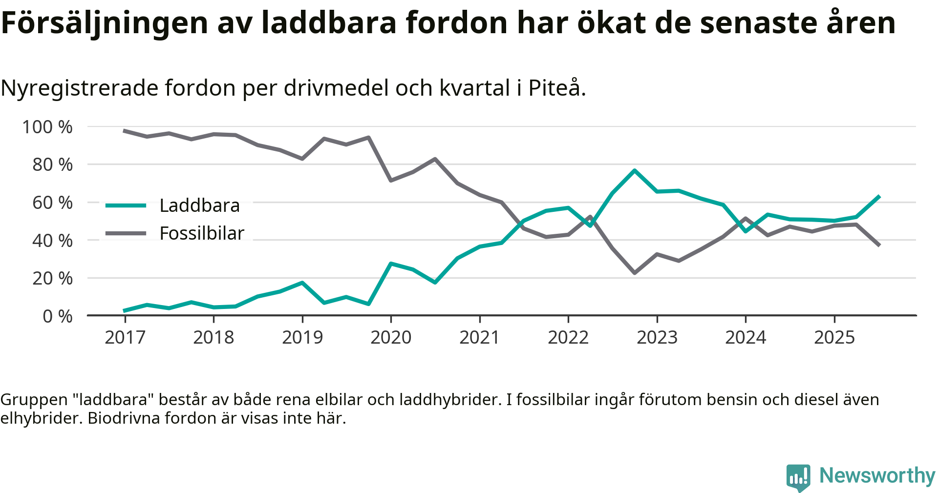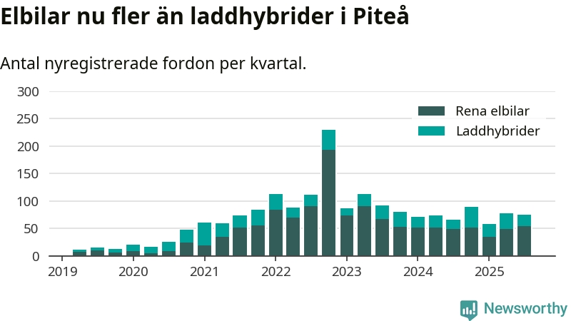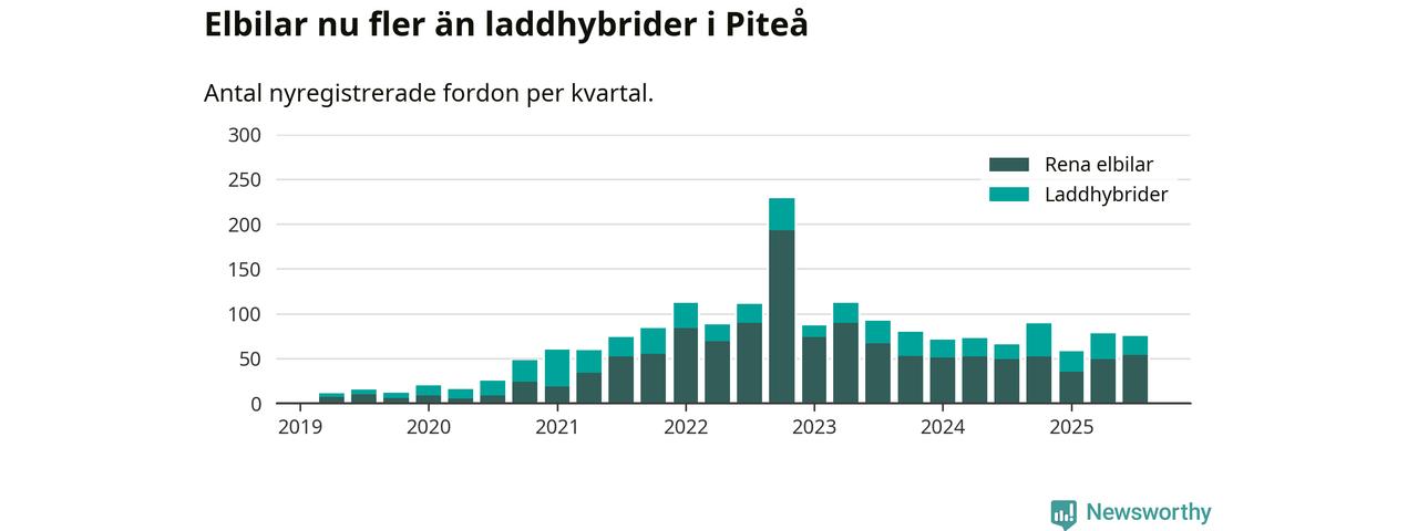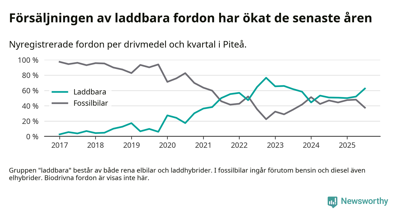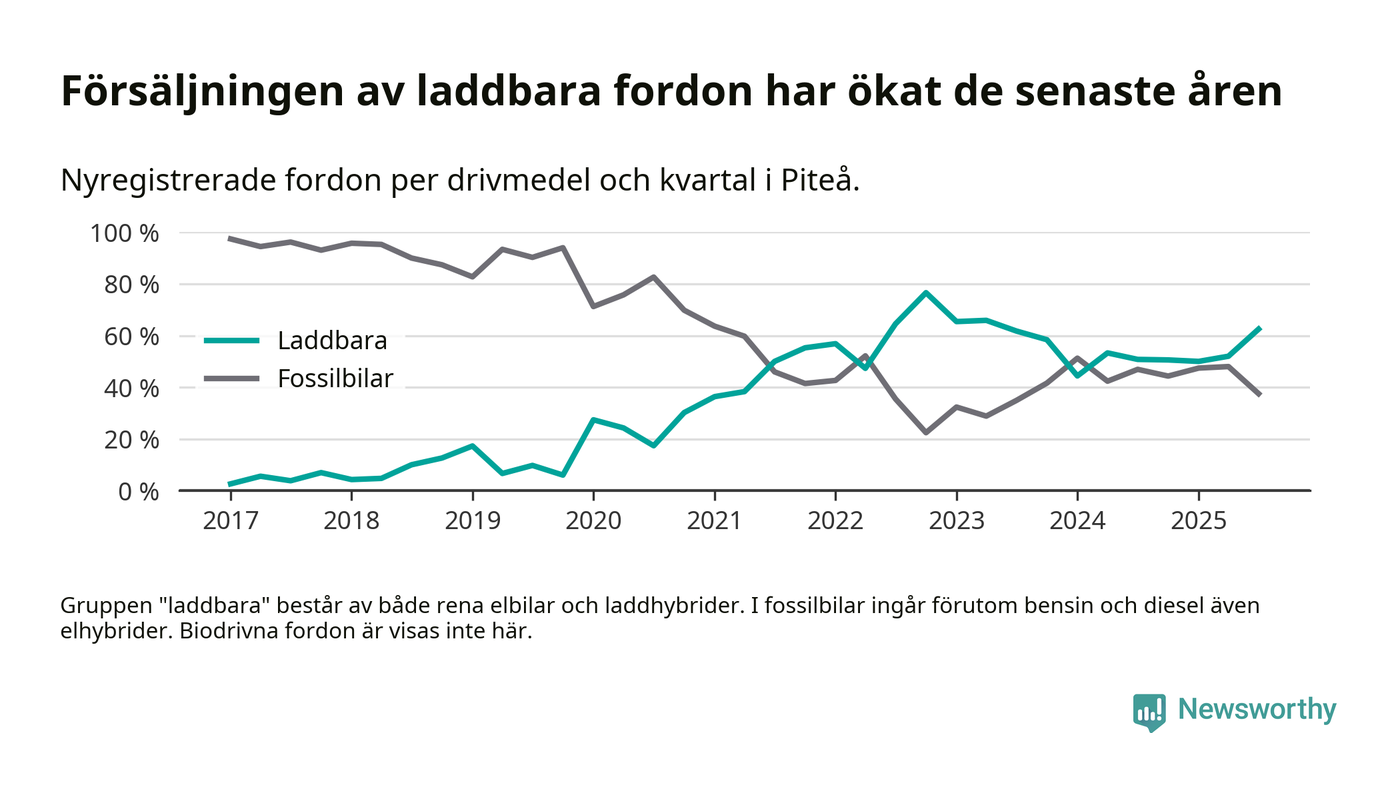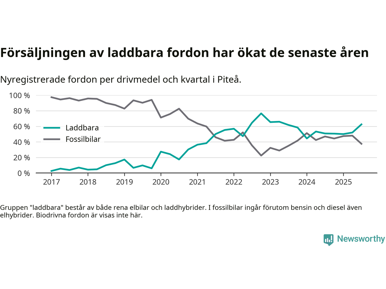 Under tredje kvartalet 2025 var 63 procent av alla nyregistrerade personbilar i Piteå laddbara (sammanlagt registrerades 120 nya bilar). Merparten av de laddbara bilarna var rena elbilar (45 procent av alla).