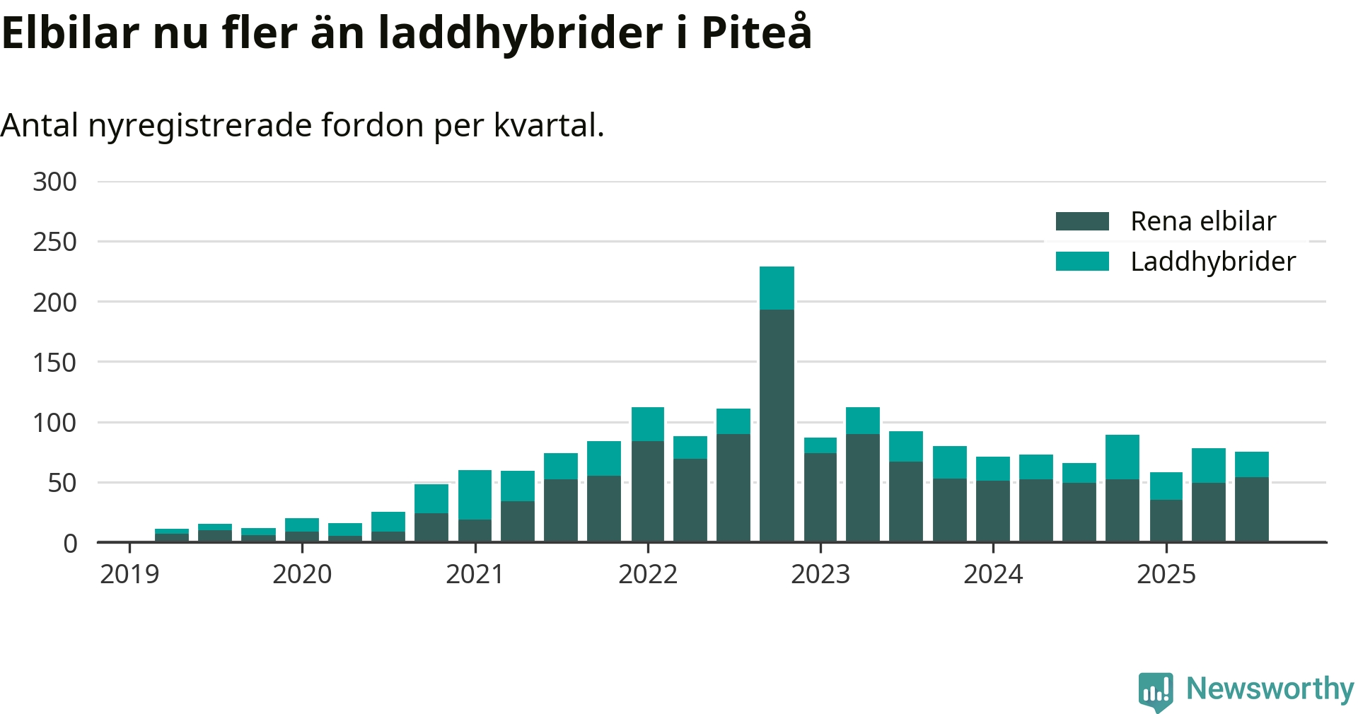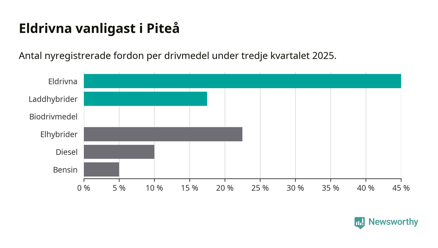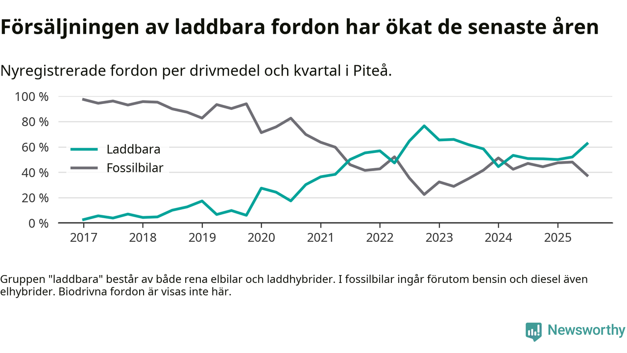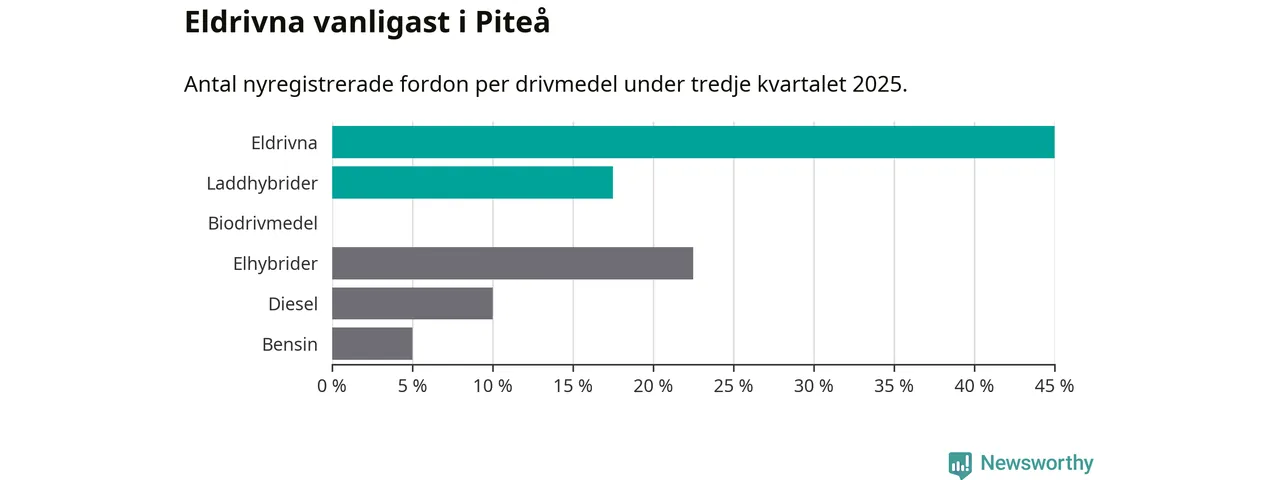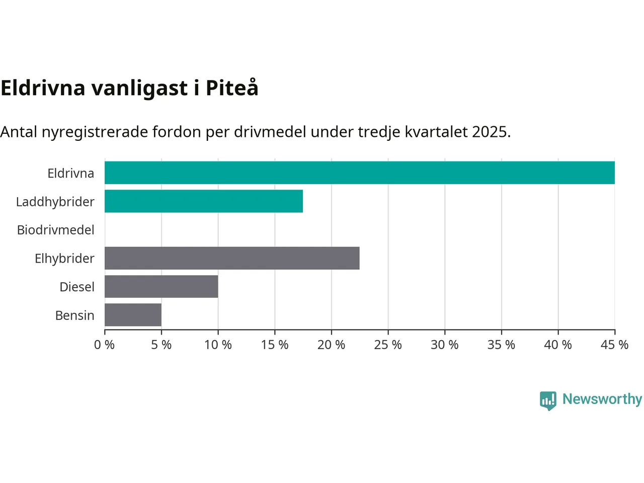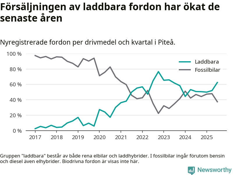 Under tredje kvartalet 2025 var 63 procent av alla nyregistrerade personbilar i Piteå laddbara (sammanlagt registrerades 120 nya bilar). Merparten av de laddbara bilarna var rena elbilar (45 procent av alla).