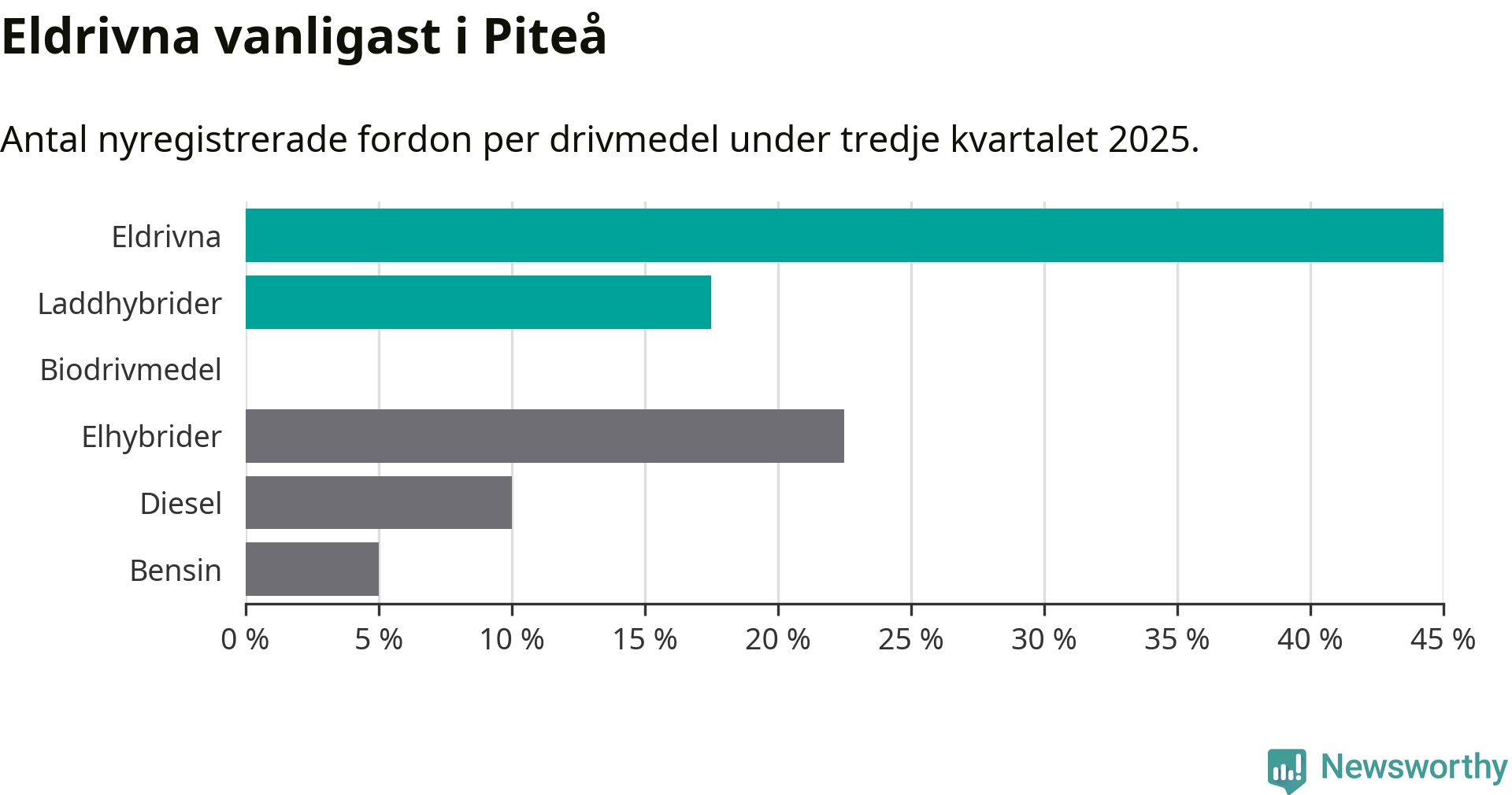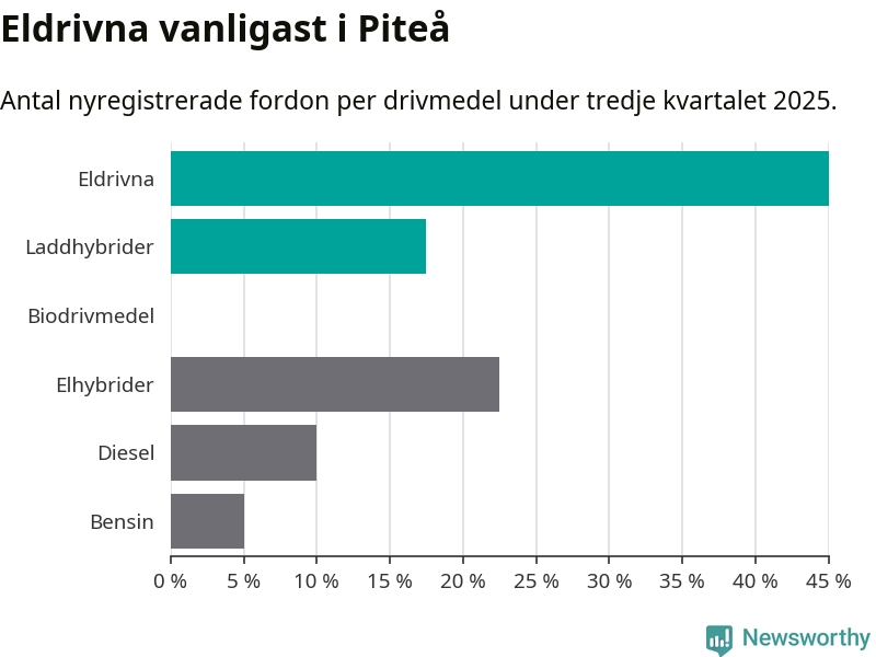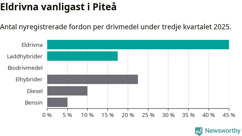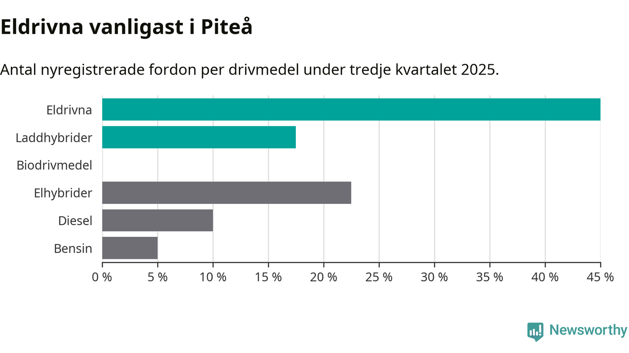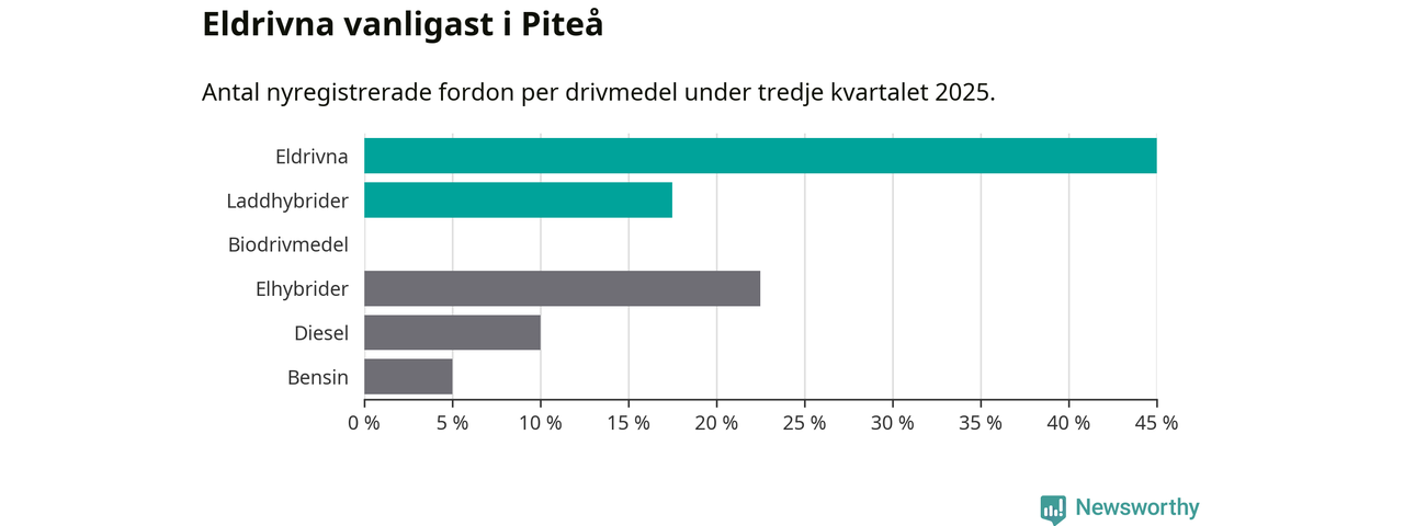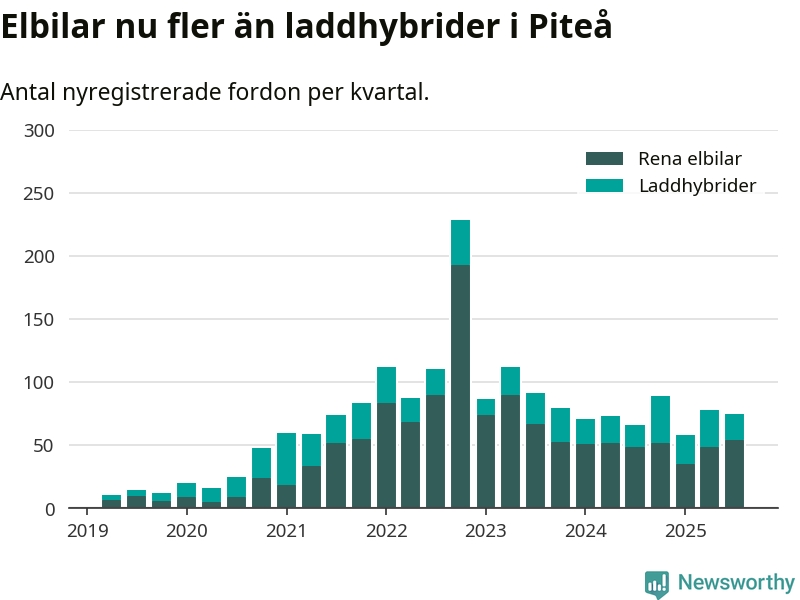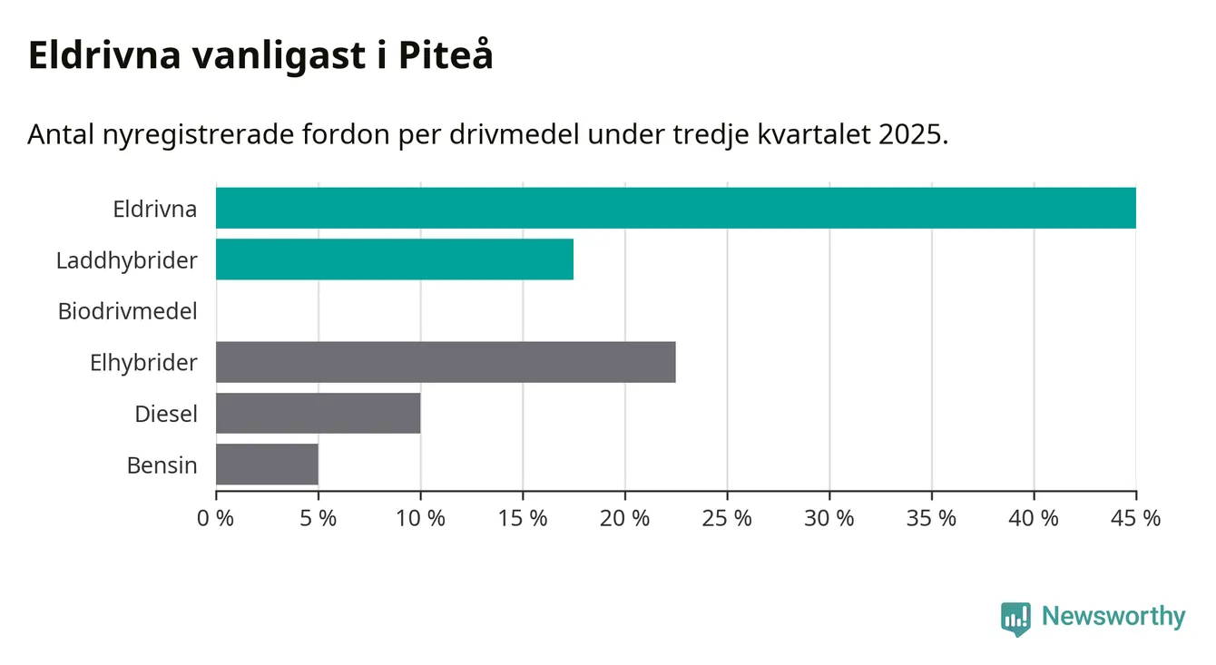 Under tredje kvartalet 2025 var 63 procent av alla nyregistrerade personbilar i Piteå laddbara (sammanlagt registrerades 120 nya bilar). Merparten av de laddbara bilarna var rena elbilar (45 procent av alla).