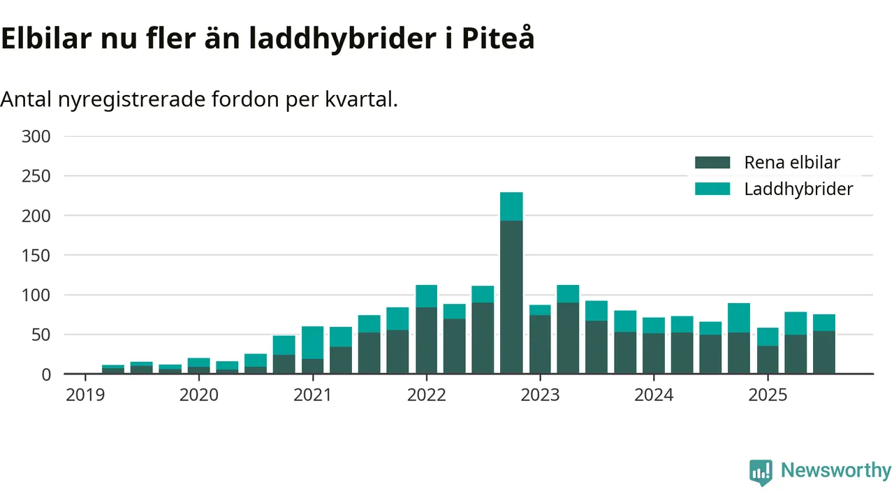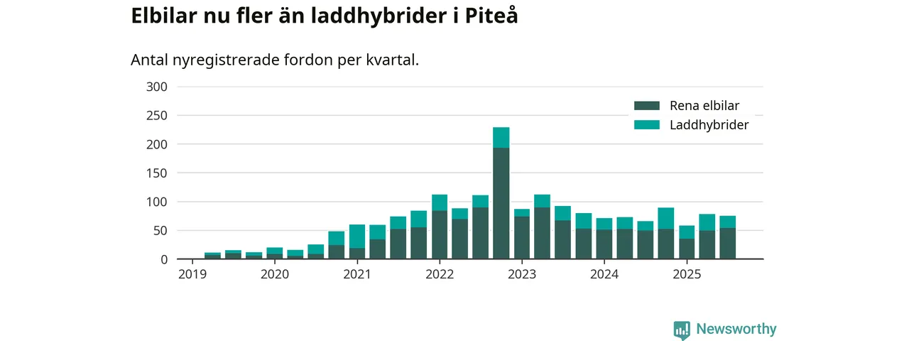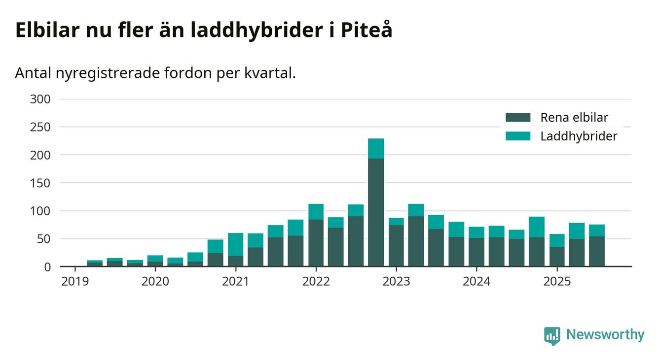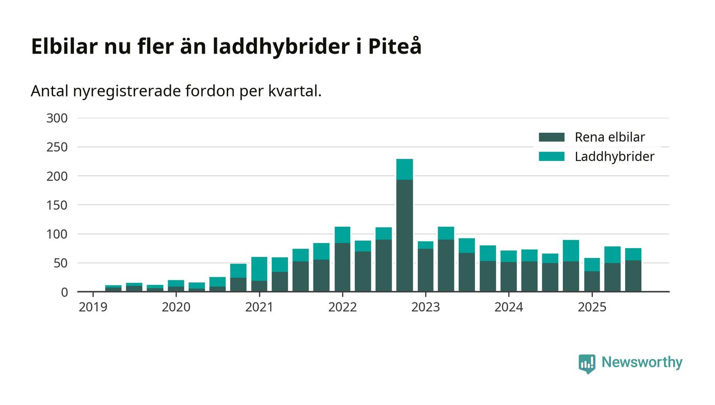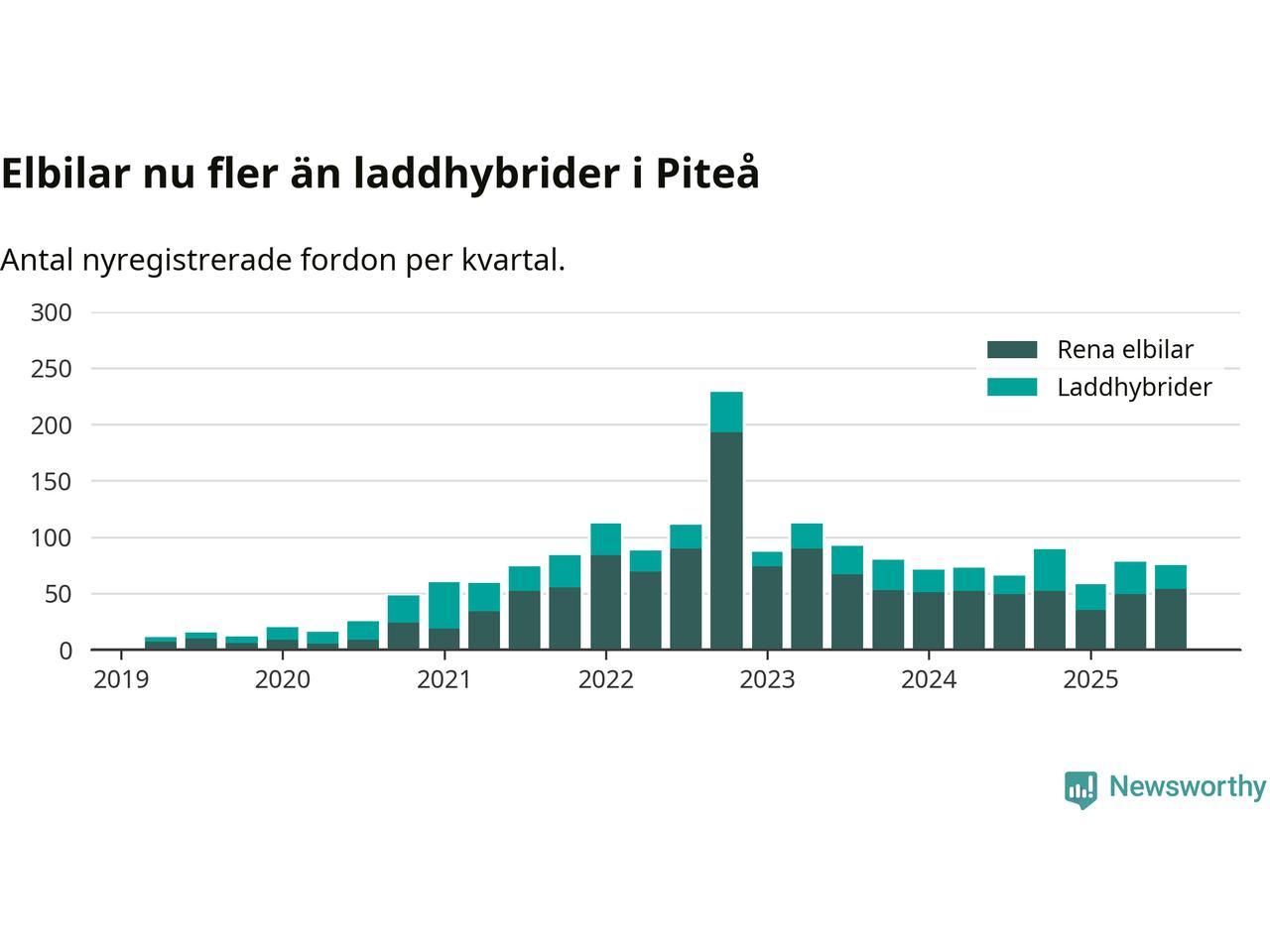 Under tredje kvartalet var sex av tio nyregistrerade bilar i Piteå kommun rena elbilar eller laddhybrider, en ökning jämfört med kvartalet innan. I riket däremot minskade andelen laddbara bilar något. Framför allt elbilsförsäljningen har tappat fart.
