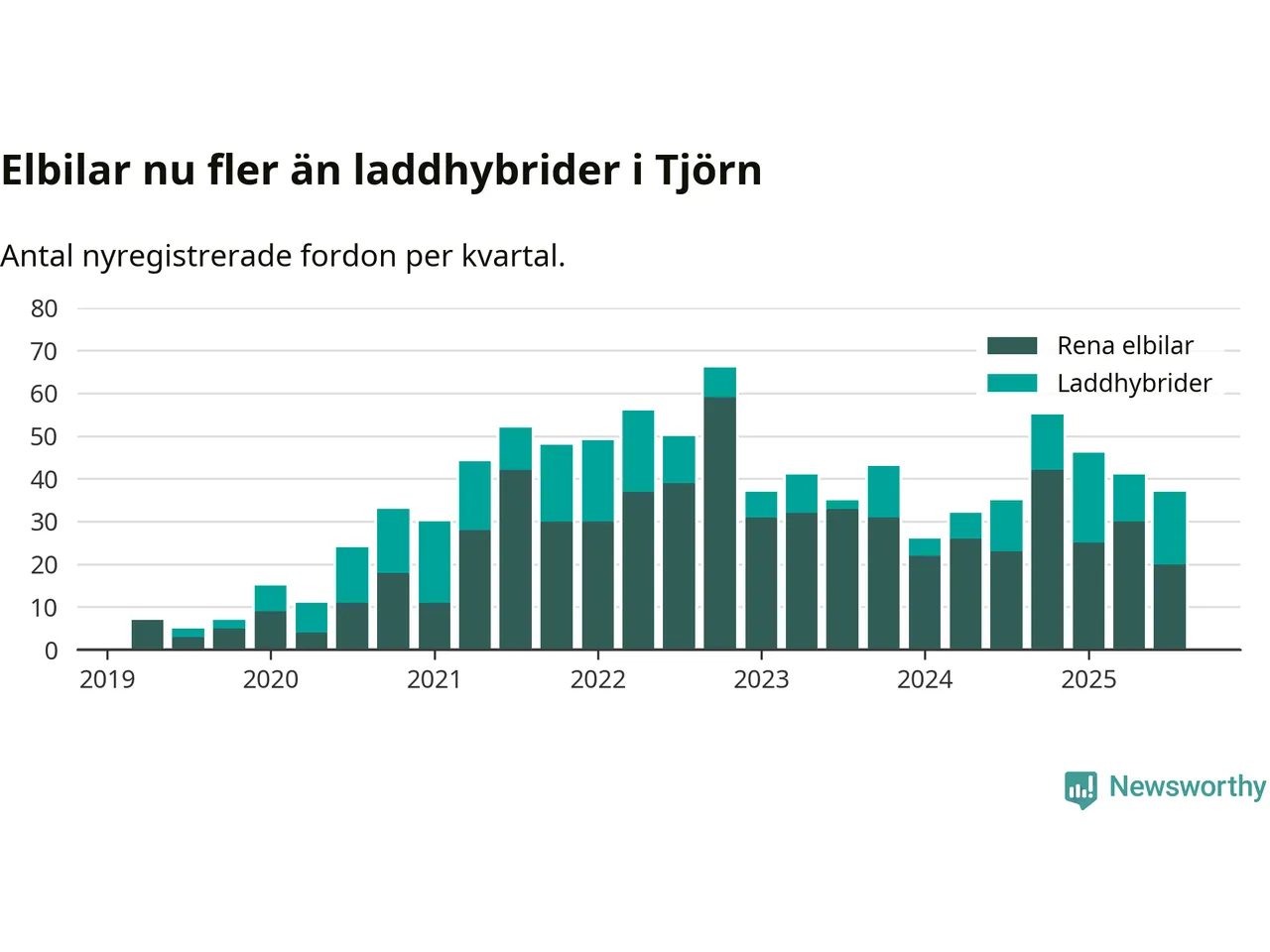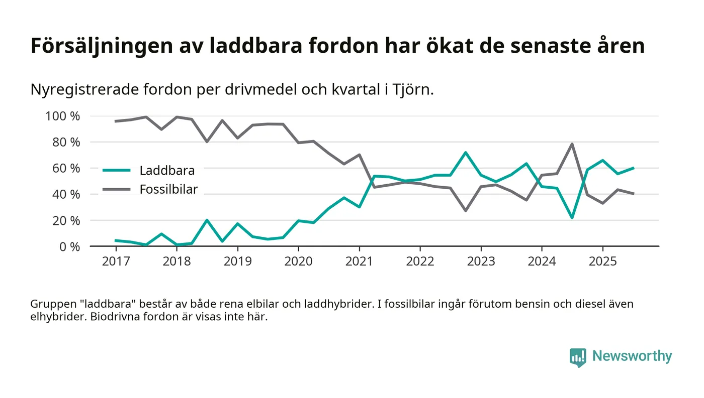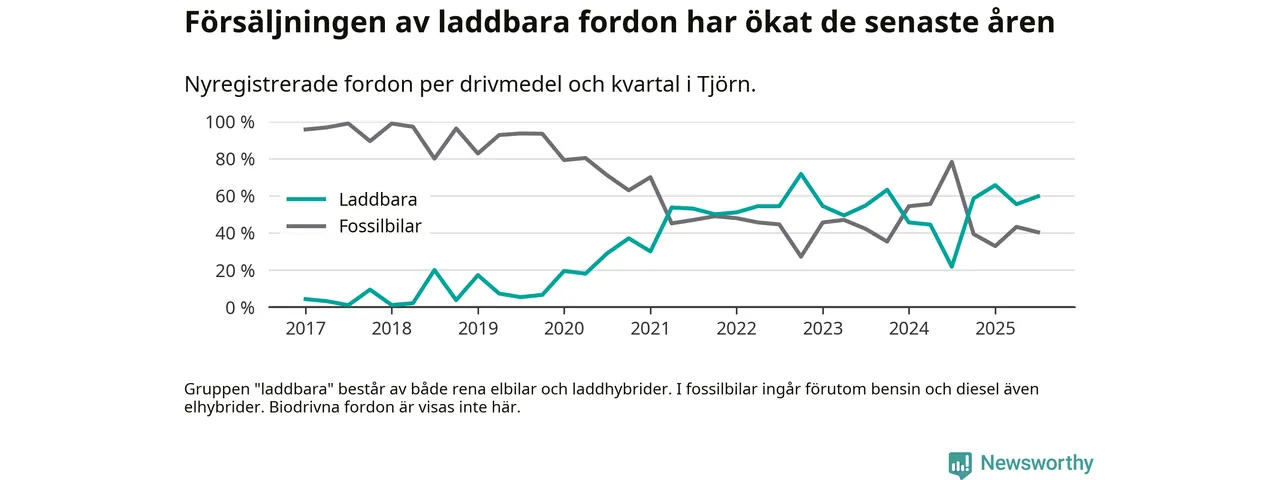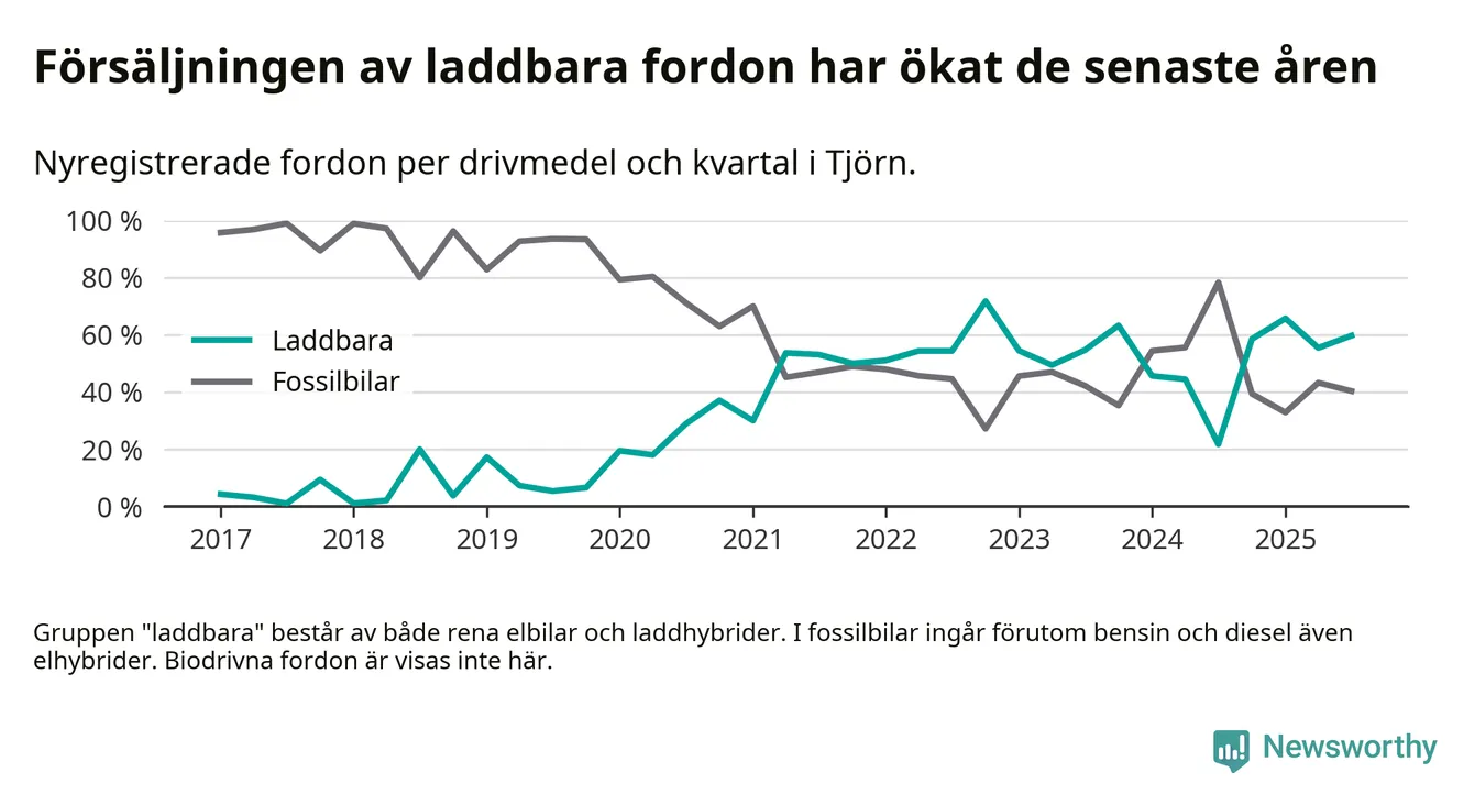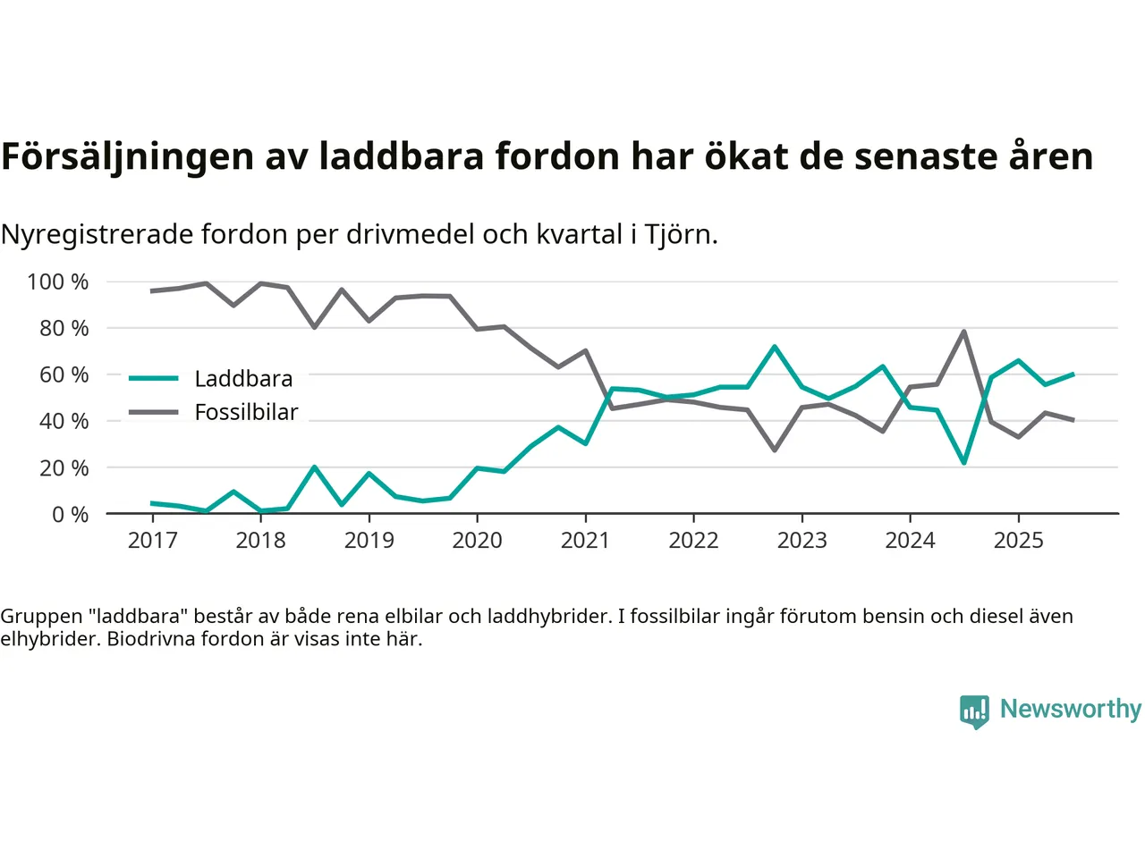Under tredje kvartalet var sex av tio nyregistrerade bilar i Tjörns kommun rena elbilar eller laddhybrider, en ökning jämfört med kvartalet innan. I riket däremot minskade andelen laddbara bilar något. Framför allt elbilsförsäljningen har tappat fart.