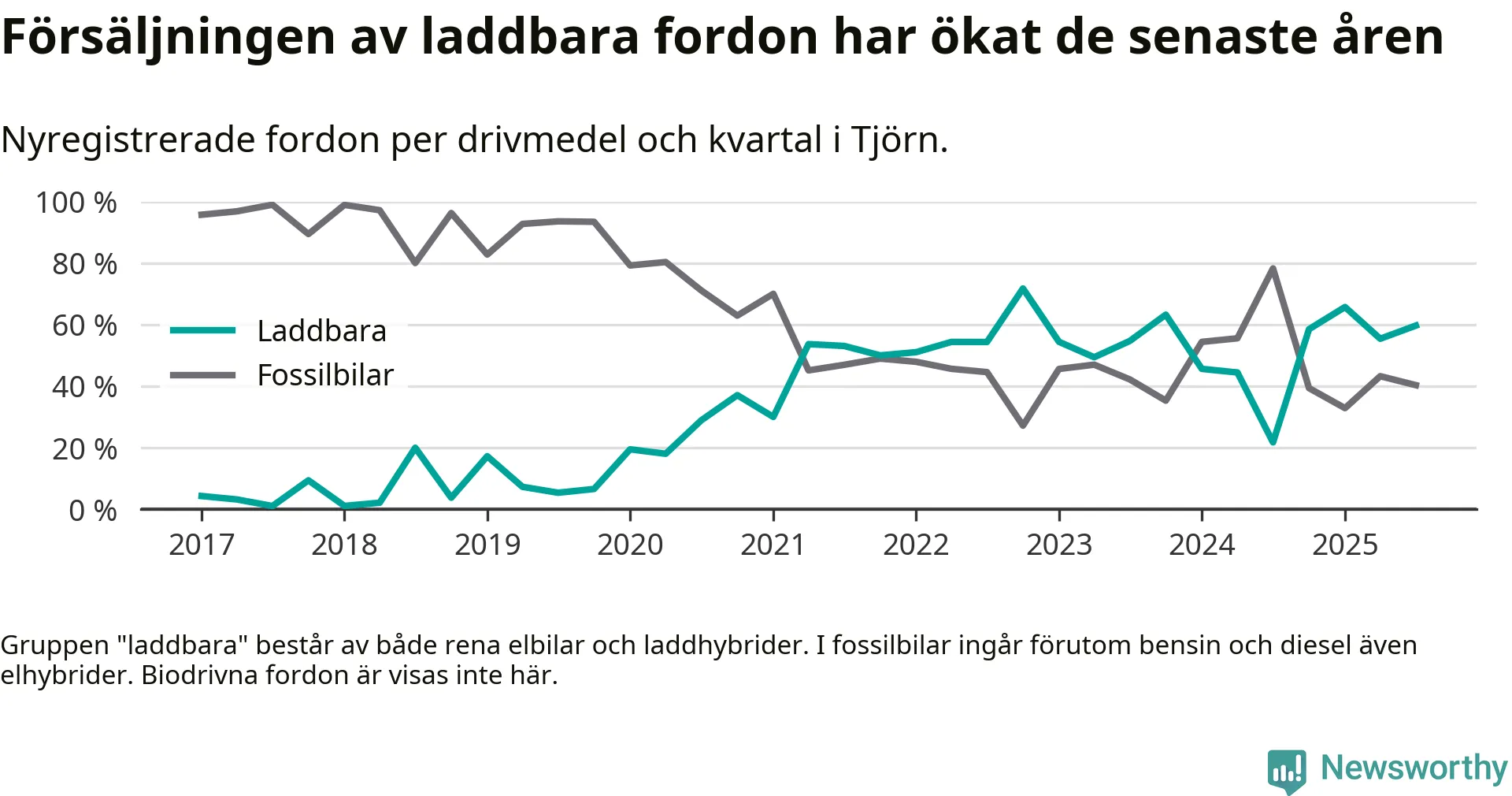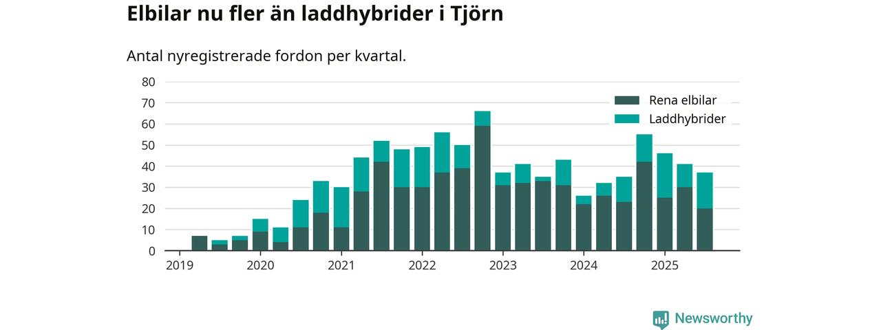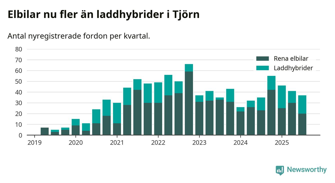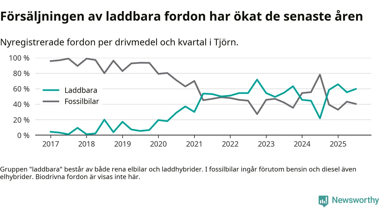 Under tredje kvartalet var sex av tio nyregistrerade bilar i Tjörns kommun rena elbilar eller laddhybrider, en ökning jämfört med kvartalet innan. I riket däremot minskade andelen laddbara bilar något. Framför allt elbilsförsäljningen har tappat fart.