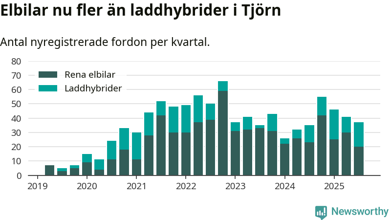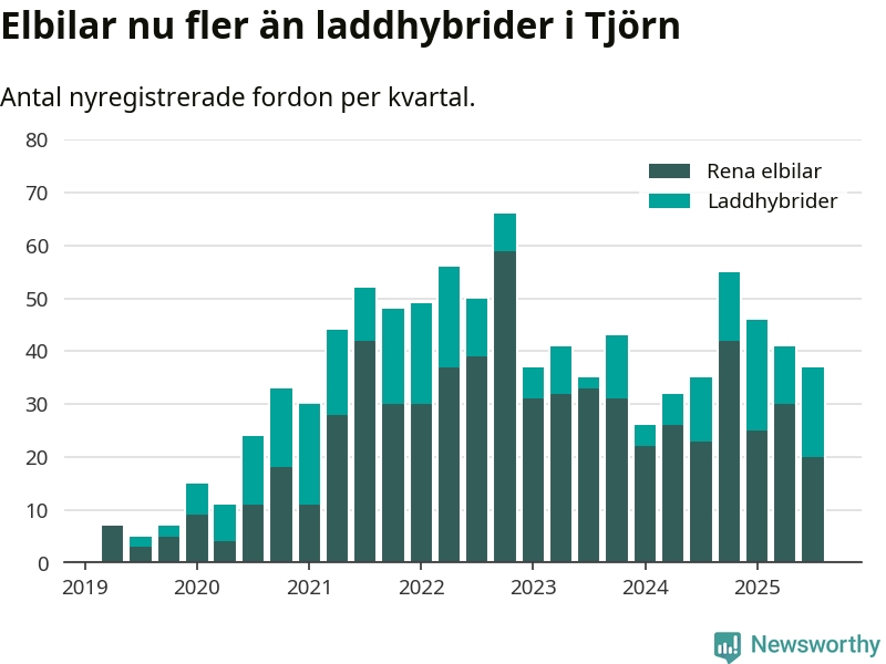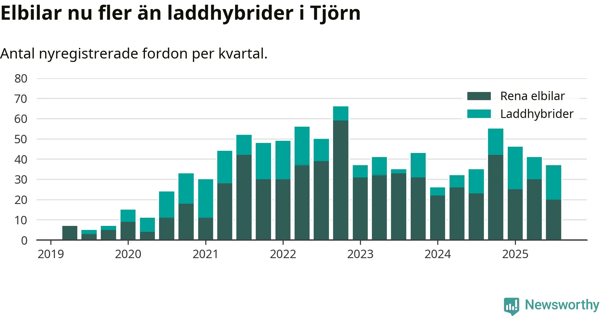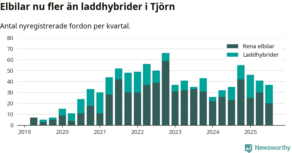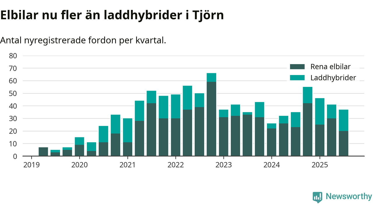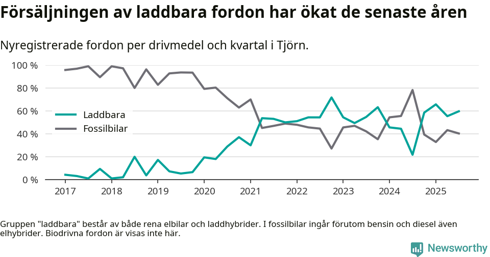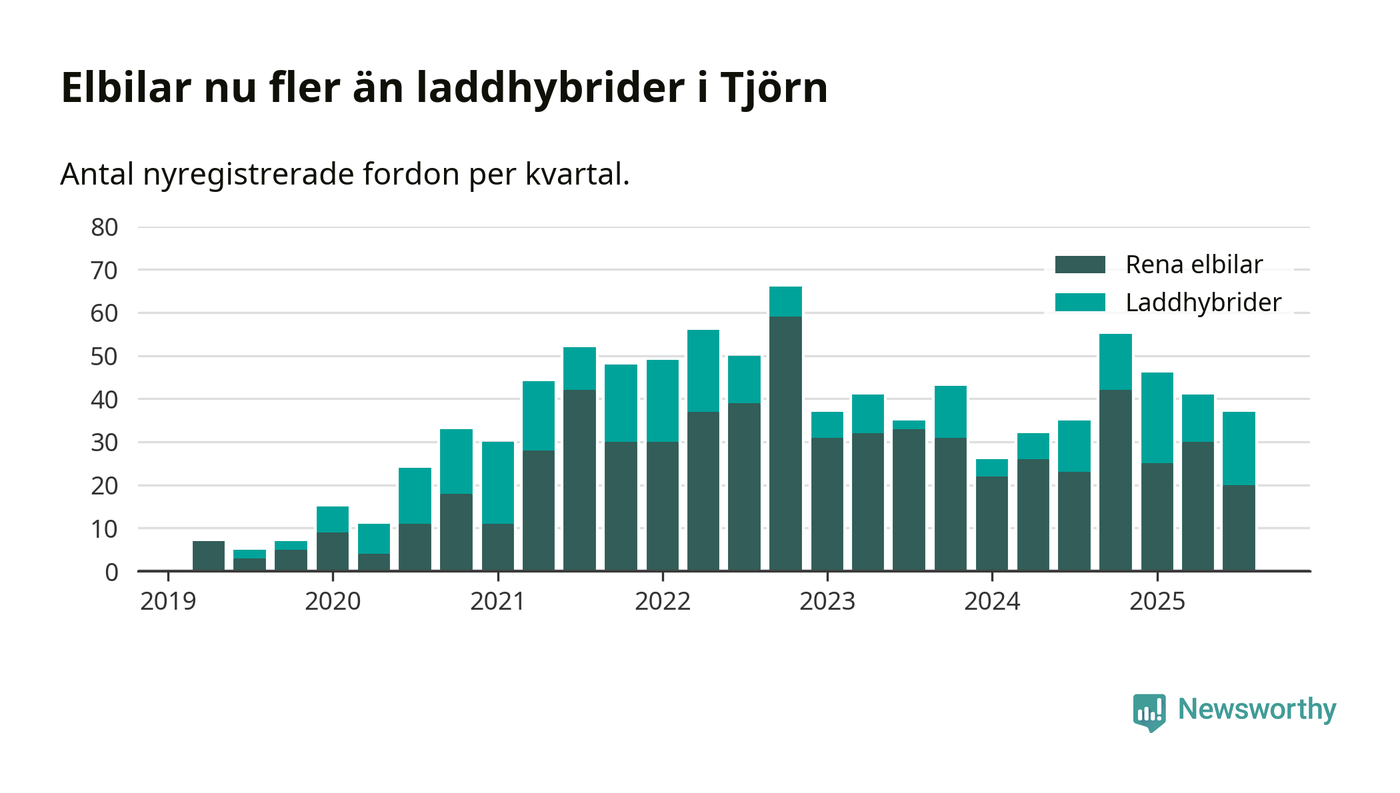 Under tredje kvartalet var sex av tio nyregistrerade bilar i Tjörns kommun rena elbilar eller laddhybrider, en ökning jämfört med kvartalet innan. I riket däremot minskade andelen laddbara bilar något. Framför allt elbilsförsäljningen har tappat fart.