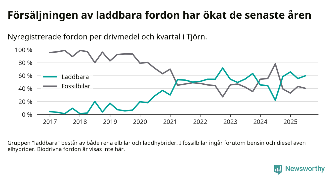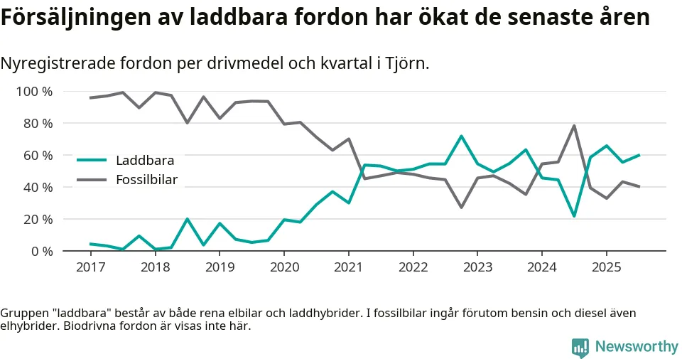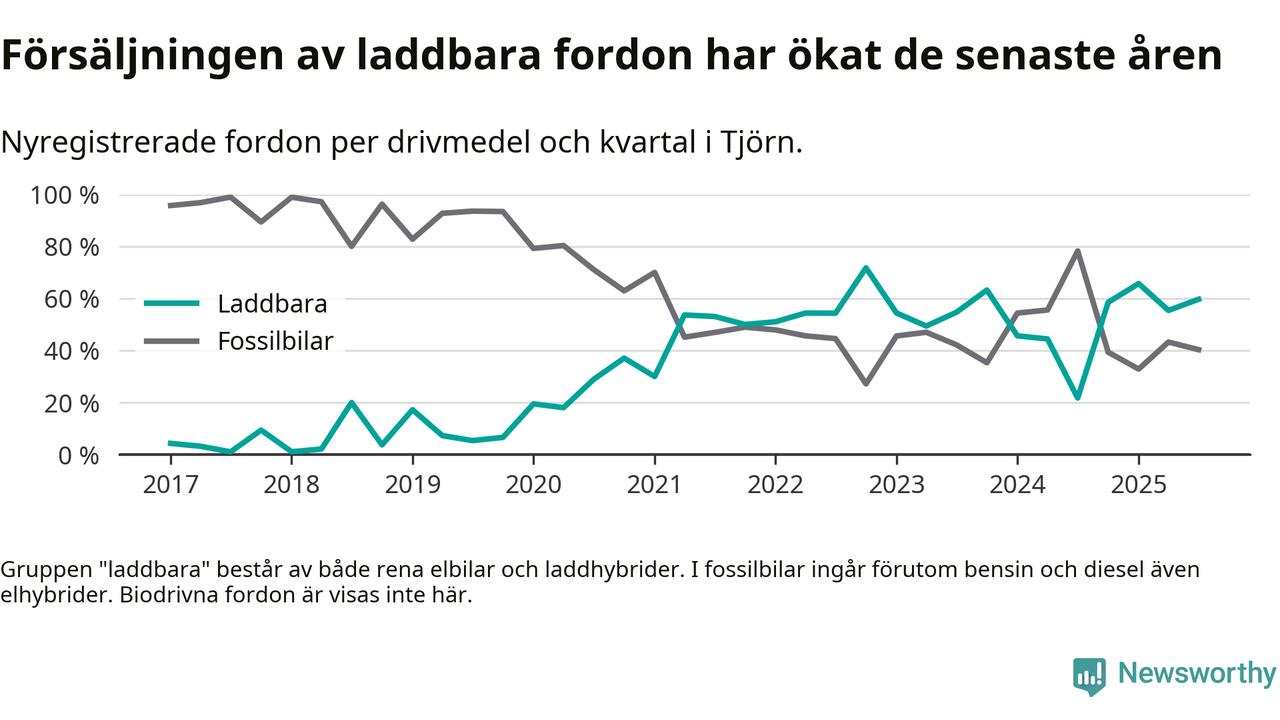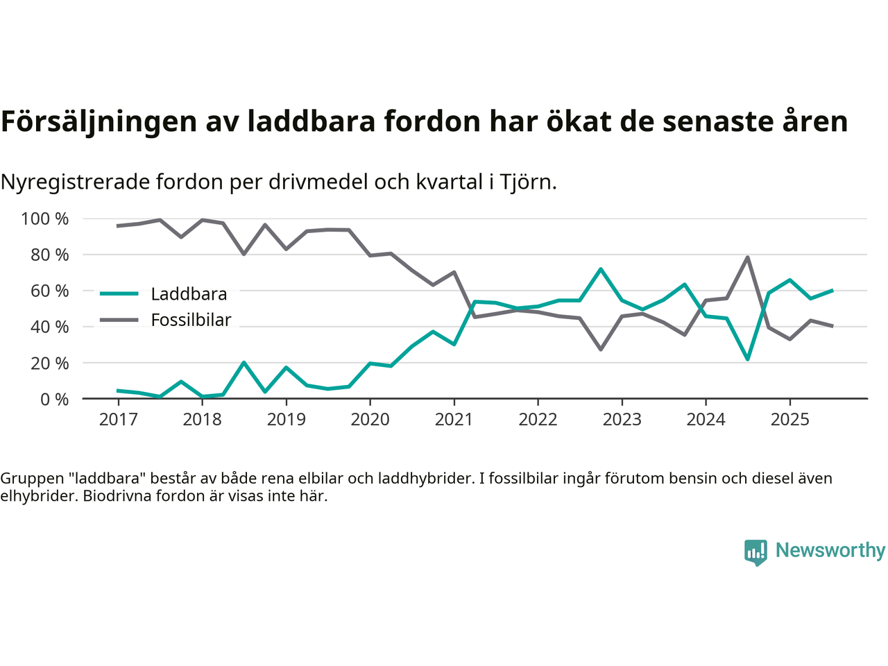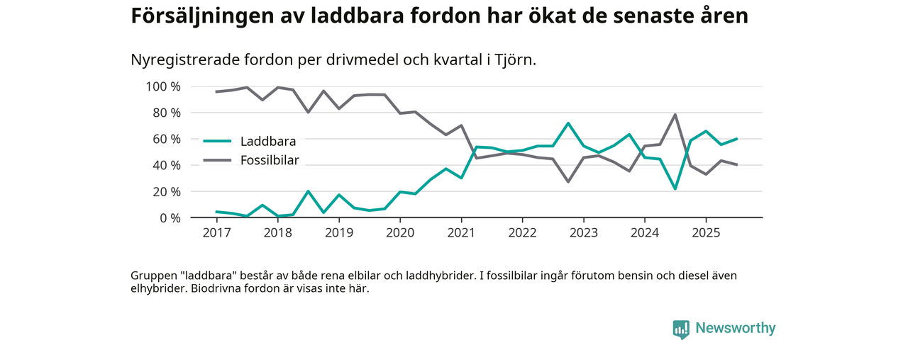 Under tredje kvartalet 2025 var 60 procent av alla nyregistrerade personbilar på Tjörn laddbara (sammanlagt registrerades 62 nya bilar). Merparten av de laddbara bilarna var rena elbilar (32 procent av alla).