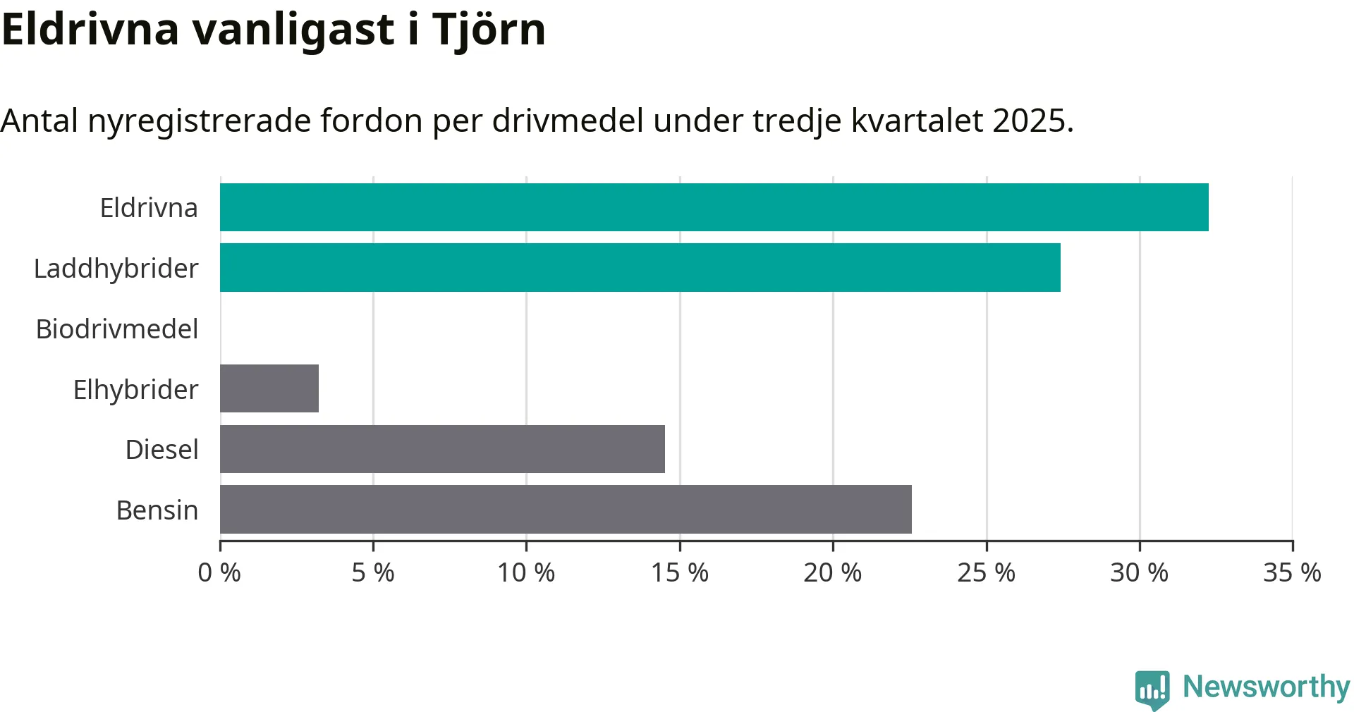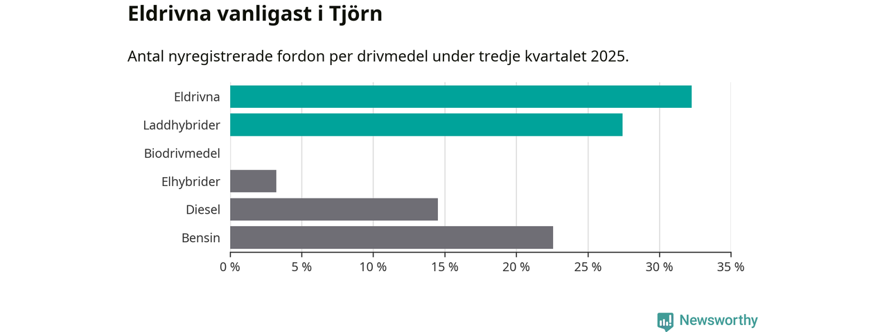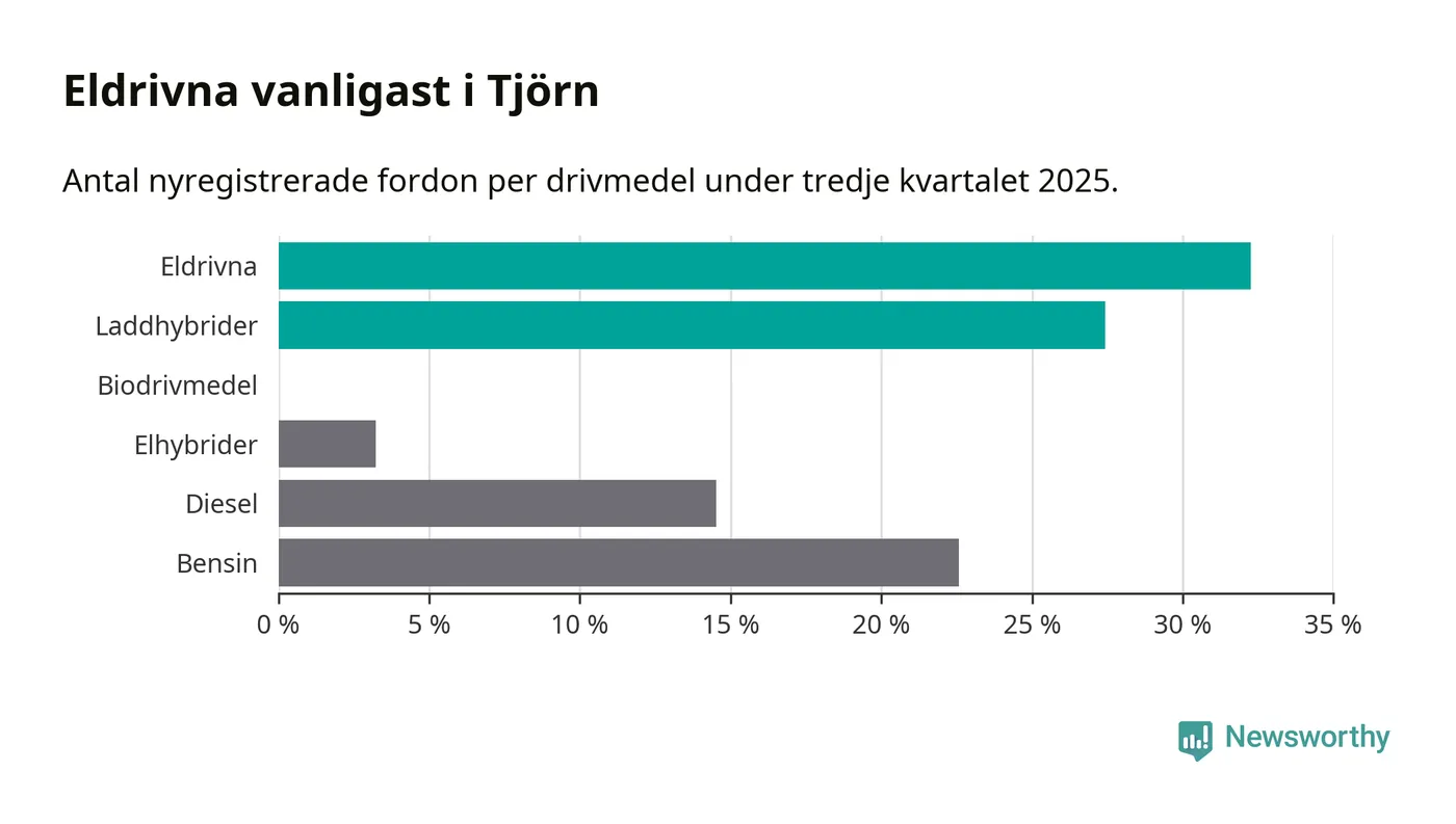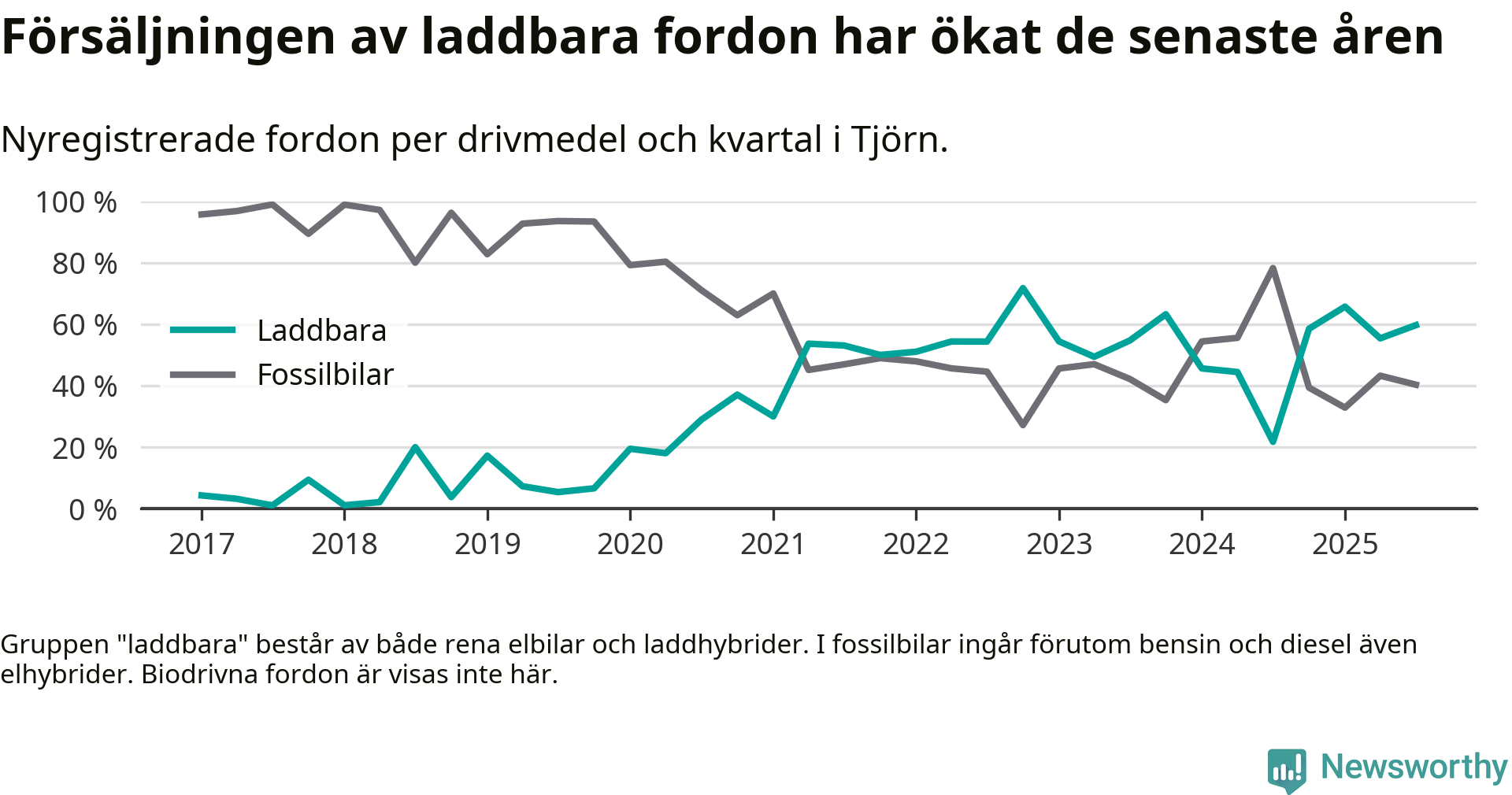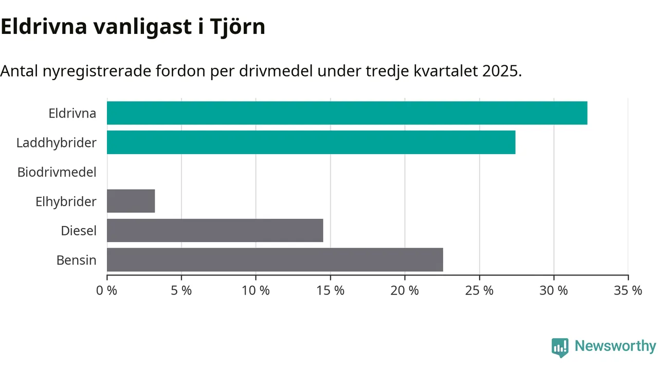 Under tredje kvartalet 2025 var 60 procent av alla nyregistrerade personbilar på Tjörn laddbara (sammanlagt registrerades 62 nya bilar). Merparten av de laddbara bilarna var rena elbilar (32 procent av alla).