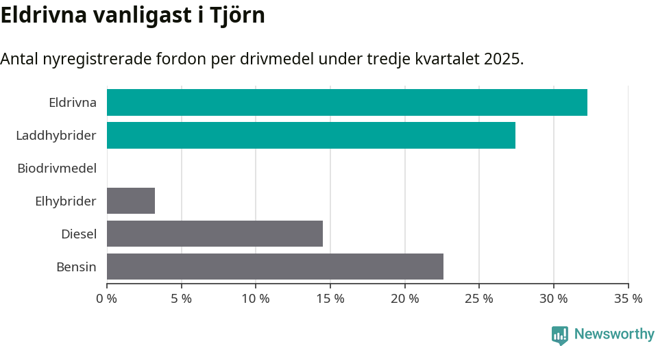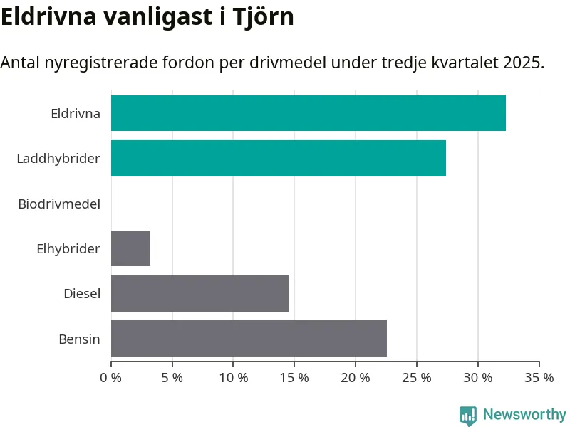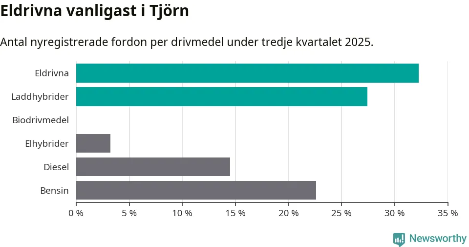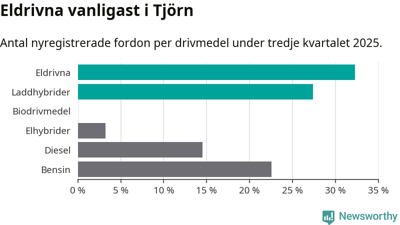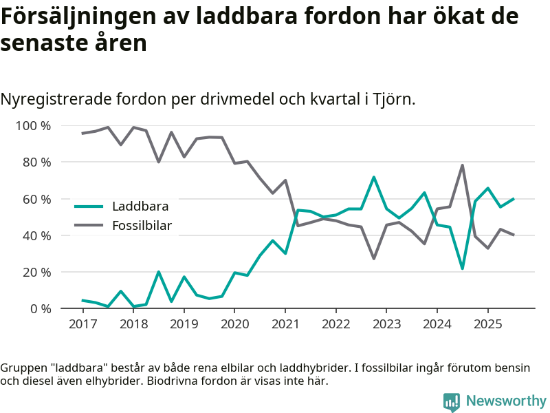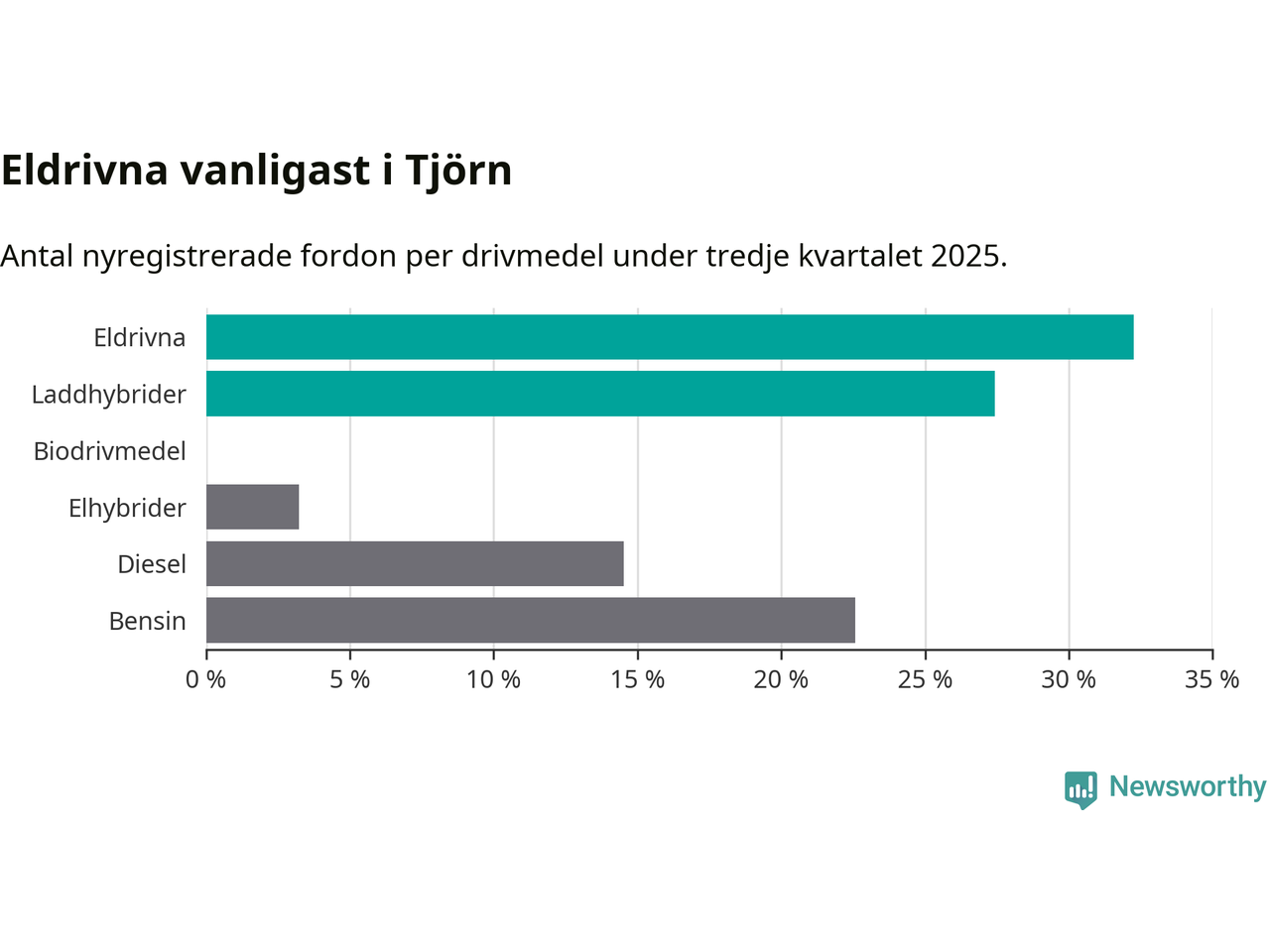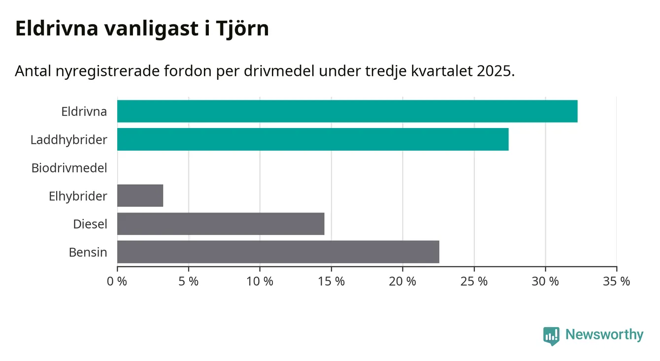 Under tredje kvartalet 2025 var 60 procent av alla nyregistrerade personbilar på Tjörn laddbara (sammanlagt registrerades 62 nya bilar). Merparten av de laddbara bilarna var rena elbilar (32 procent av alla).