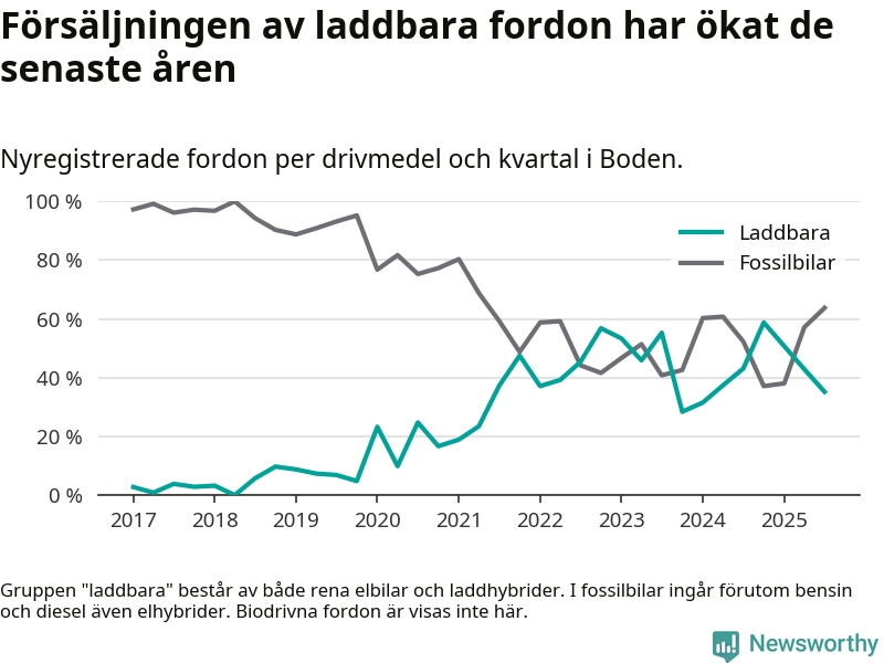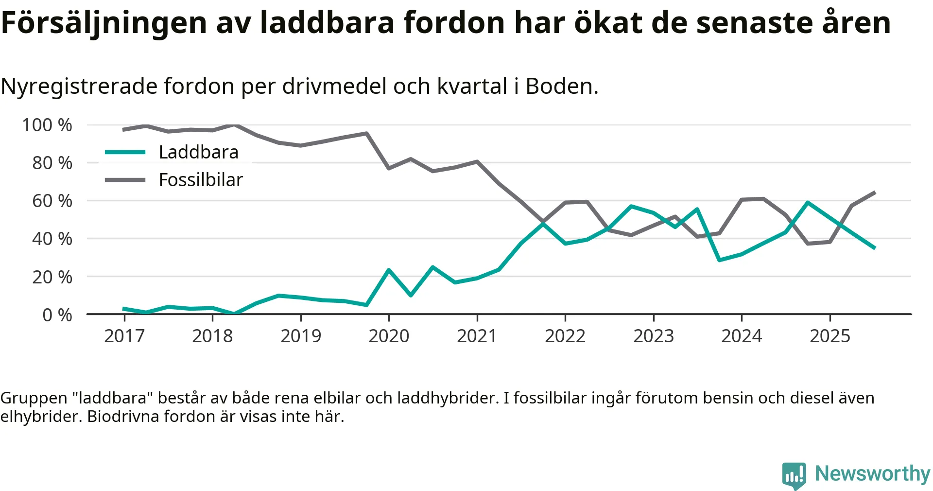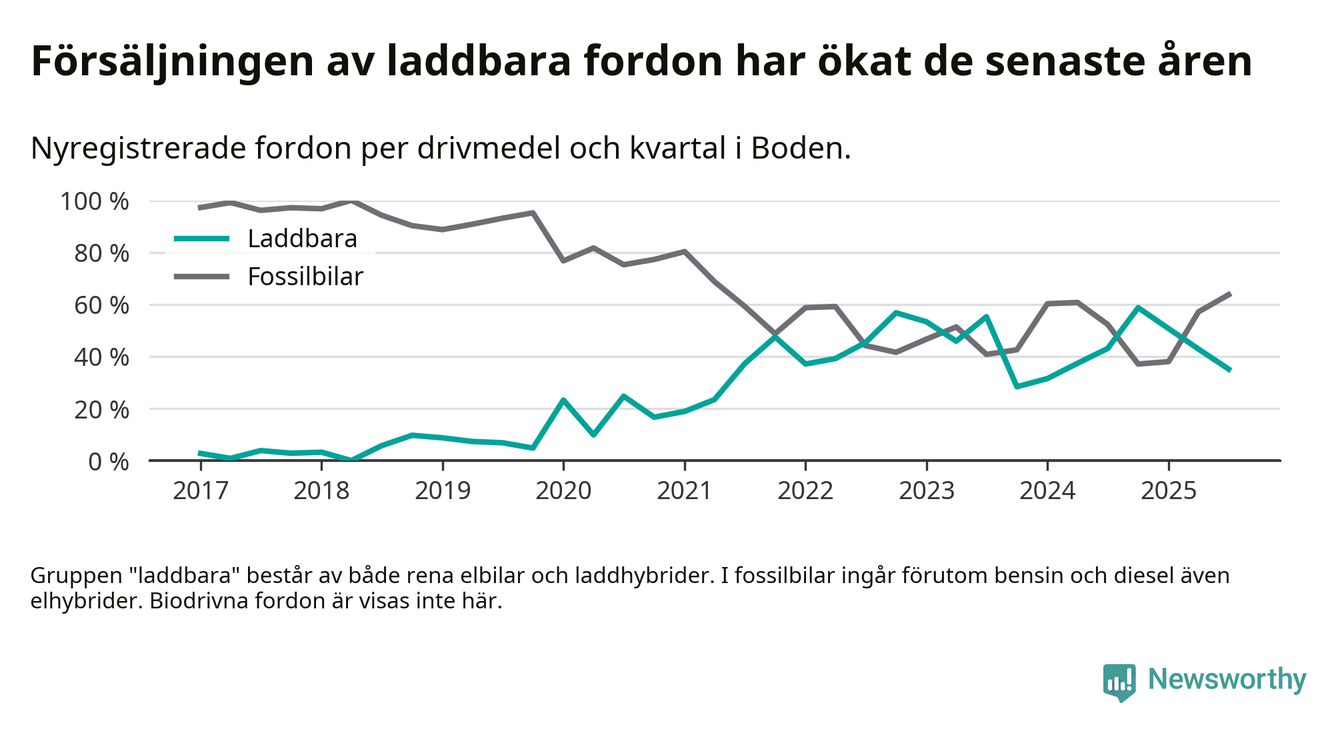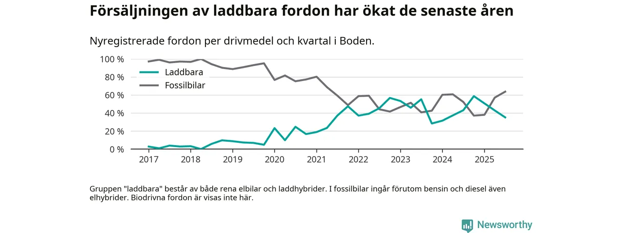 I Boden minskade andelen laddbara bilar under tredje kvartalet jämfört med kvartalet innan. Nyregistreringen peakade under fjärde kvartalet 2024 då 59 procent av de nya bilarna var laddbara.