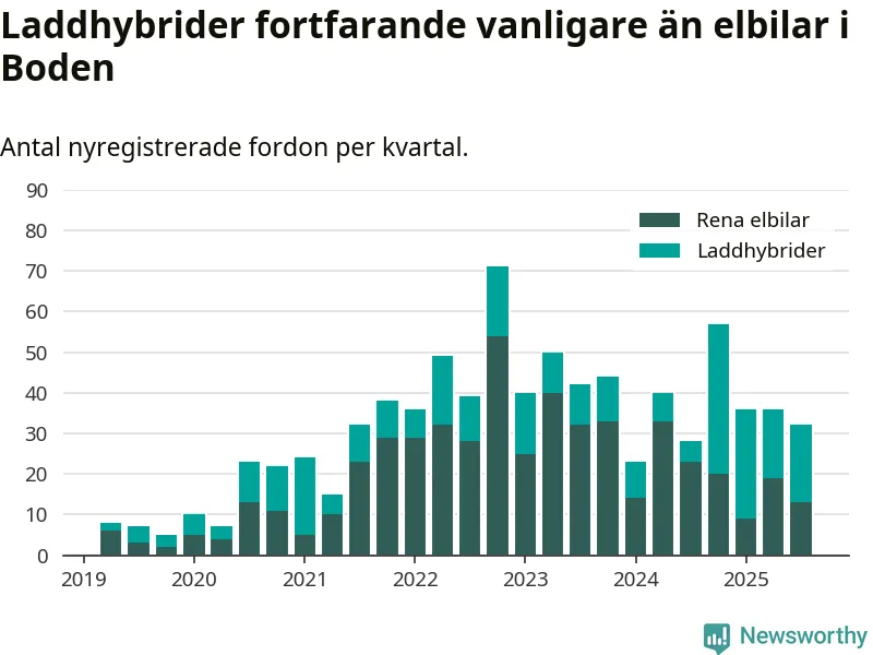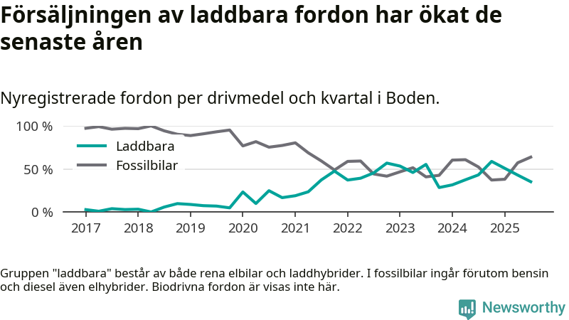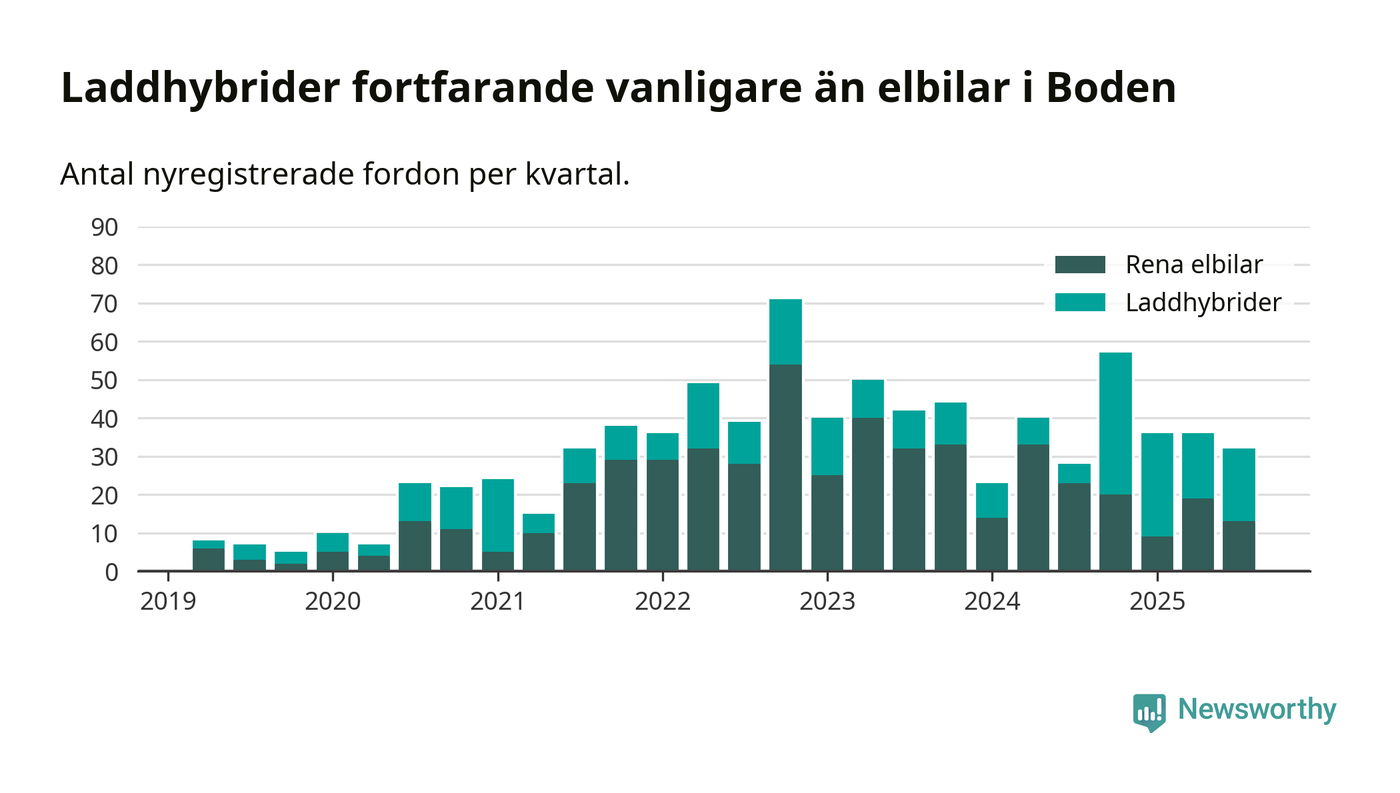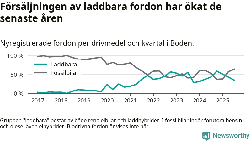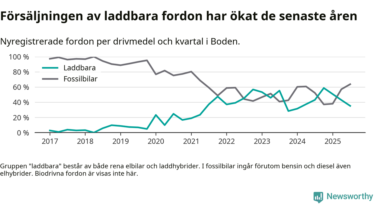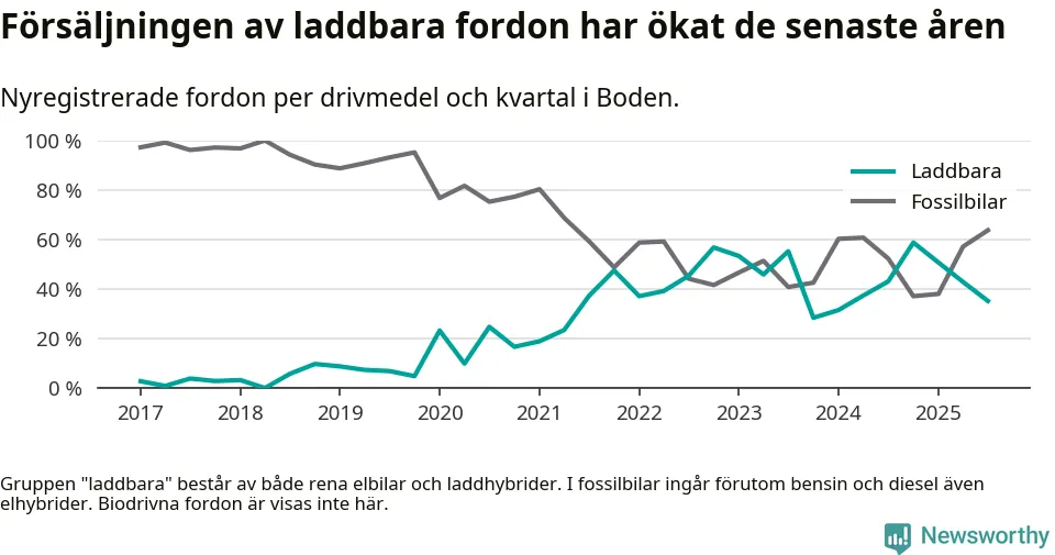 I Boden minskade andelen laddbara bilar under tredje kvartalet jämfört med kvartalet innan. Nyregistreringen peakade under fjärde kvartalet 2024 då 59 procent av de nya bilarna var laddbara.