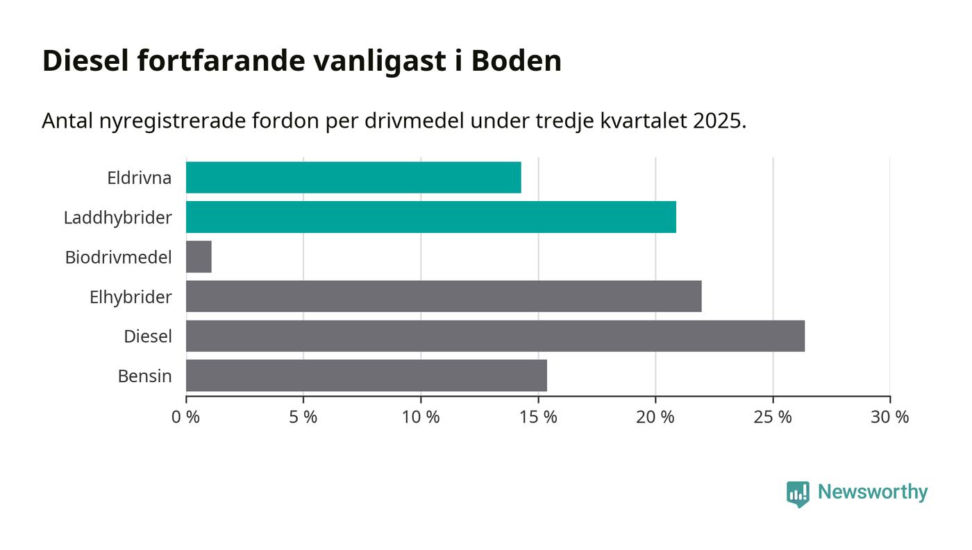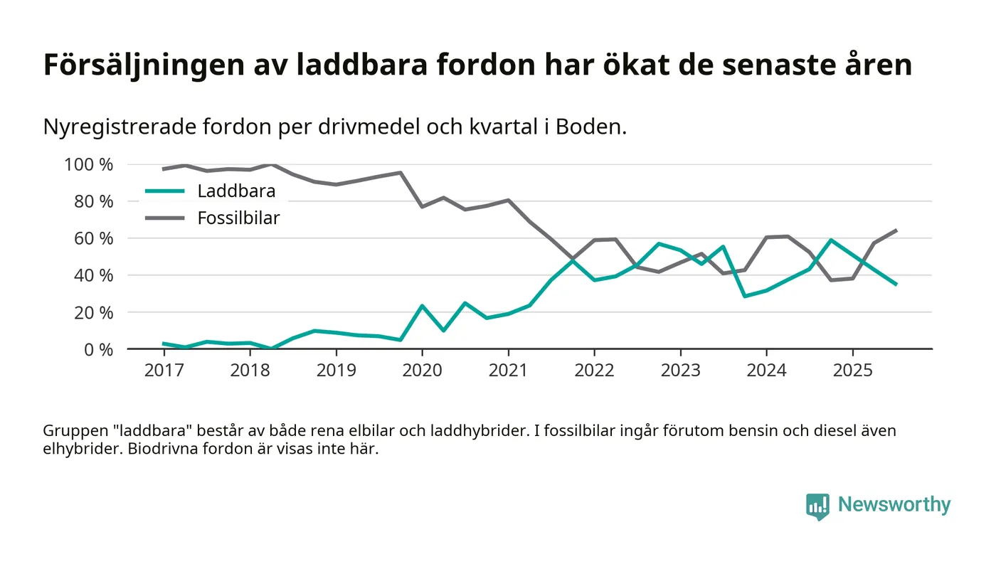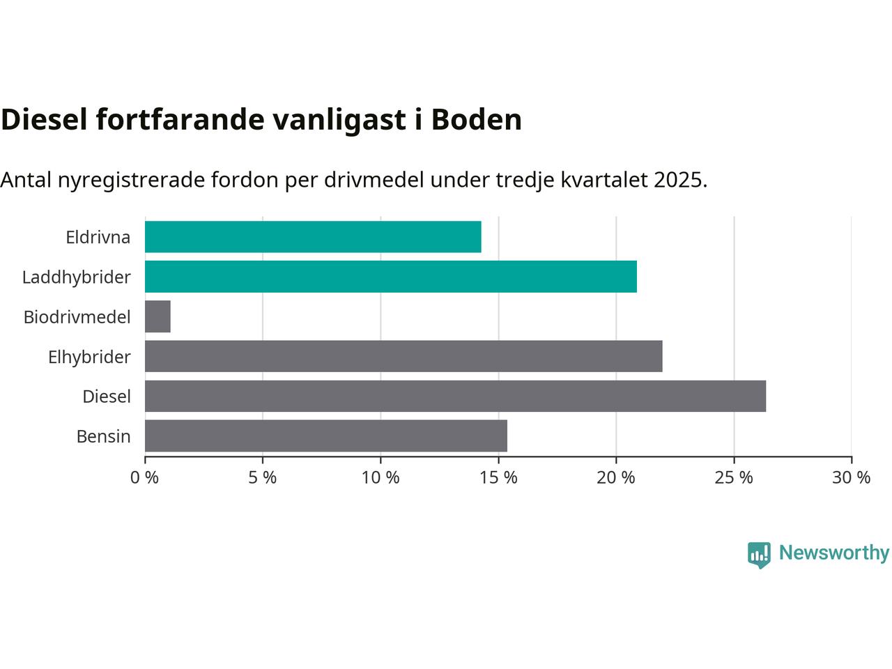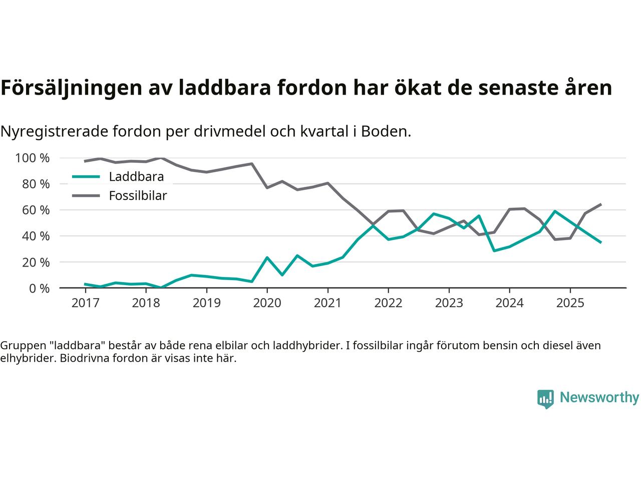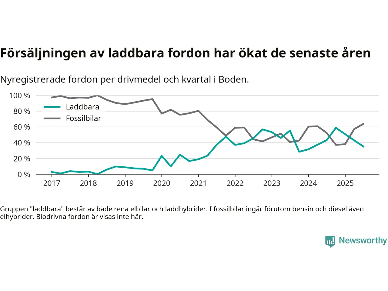 Under tredje kvartalet 2025 var 35 procent av alla nyregistrerade personbilar i Boden laddbara (sammanlagt registrerades 91 nya bilar). Merparten av de laddbara bilarna var så kallade laddhybrider, det vill säga fordon som går att ladda och köra på el, men som även har en förbränningsmotor. 14 procent av alla nya bilar var rena elbilar.