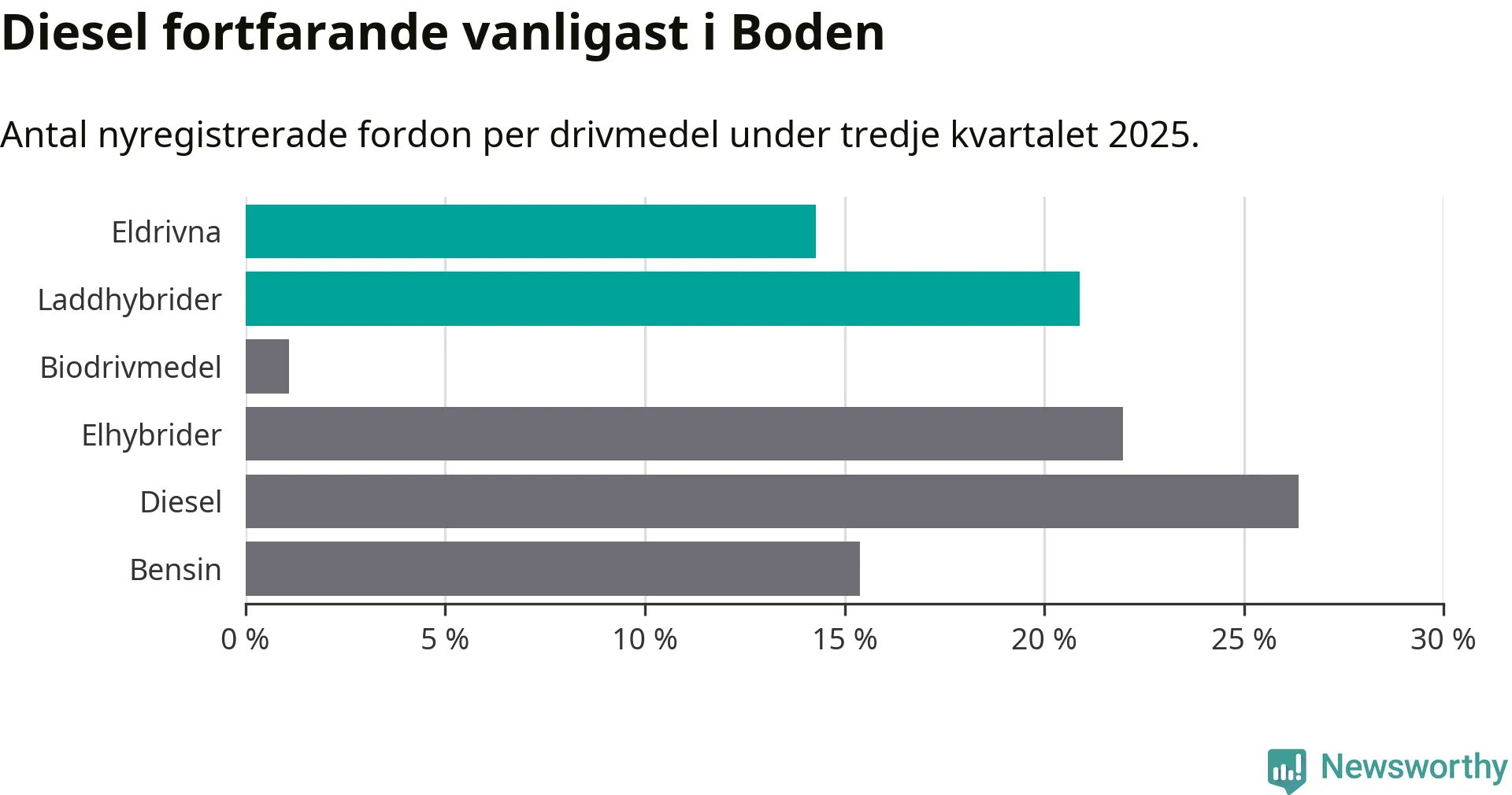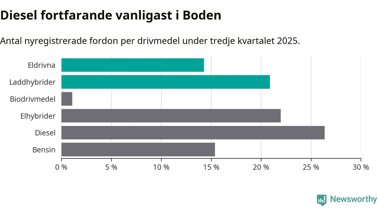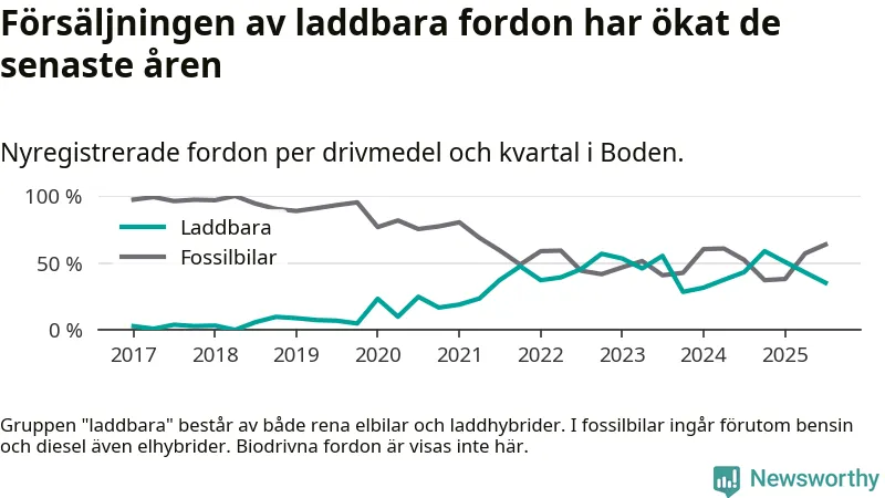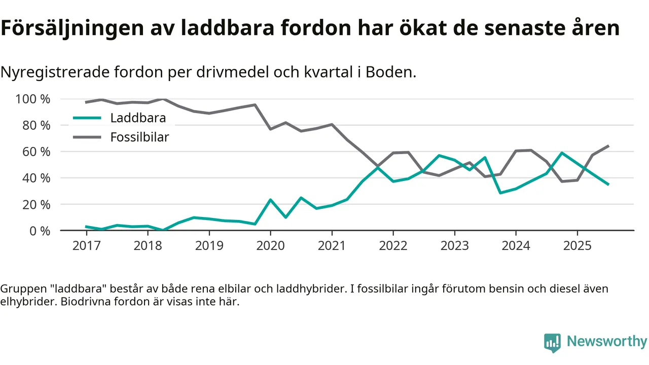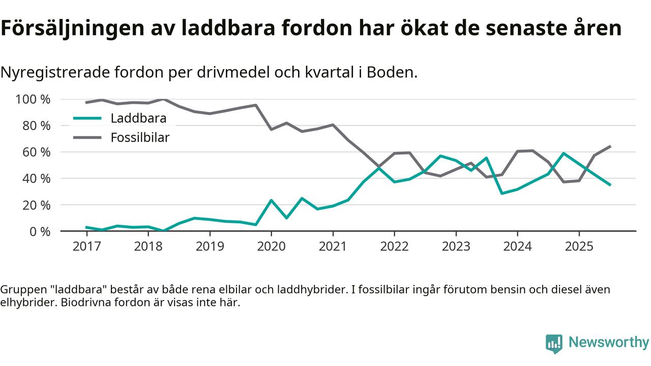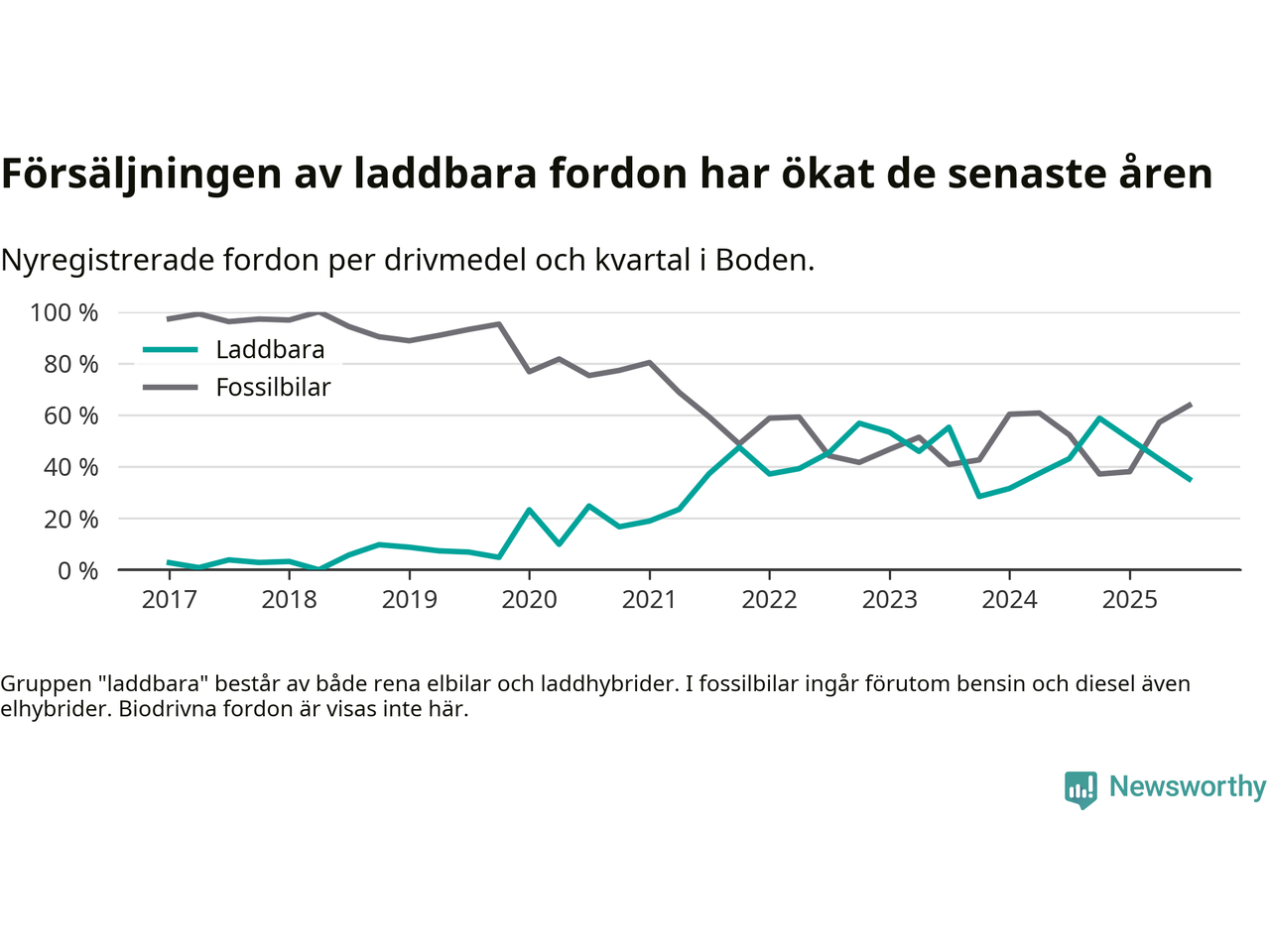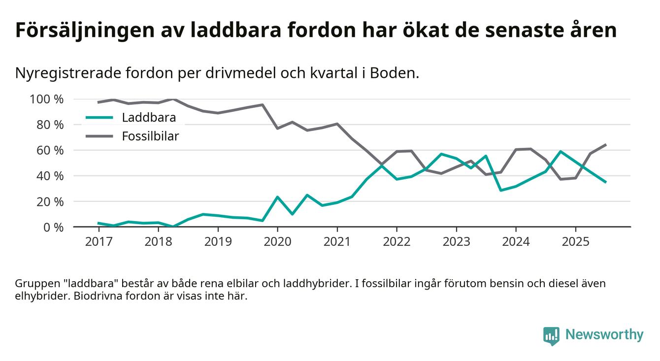 Under tredje kvartalet 2025 var 35 procent av alla nyregistrerade personbilar i Boden laddbara (sammanlagt registrerades 91 nya bilar). Merparten av de laddbara bilarna var så kallade laddhybrider, det vill säga fordon som går att ladda och köra på el, men som även har en förbränningsmotor. 14 procent av alla nya bilar var rena elbilar.