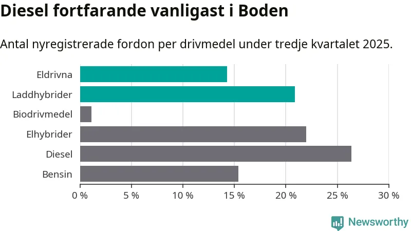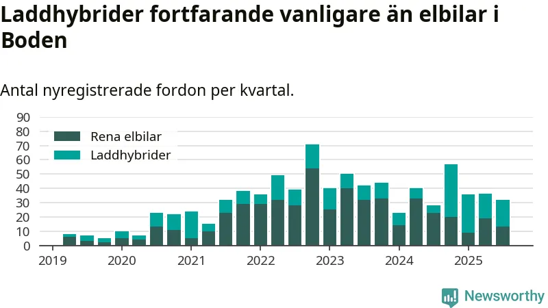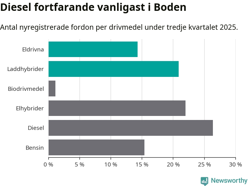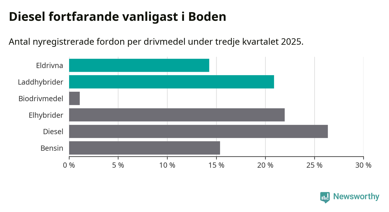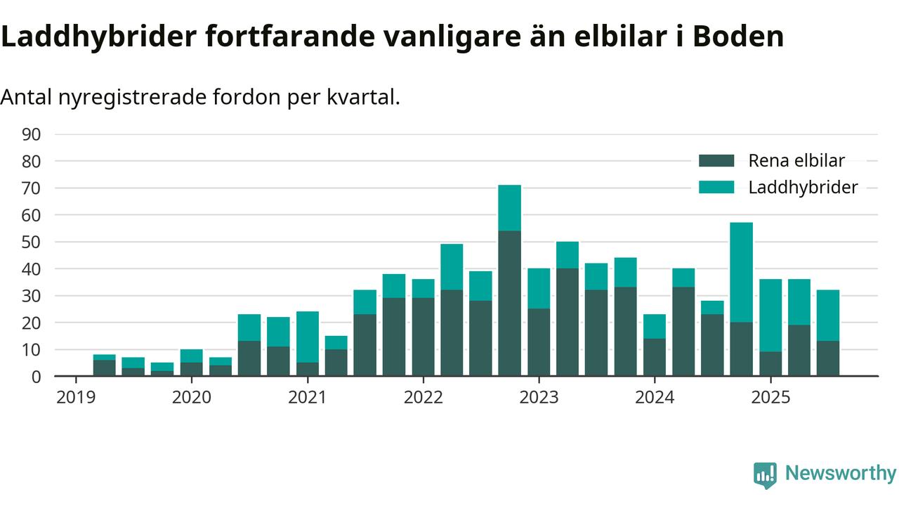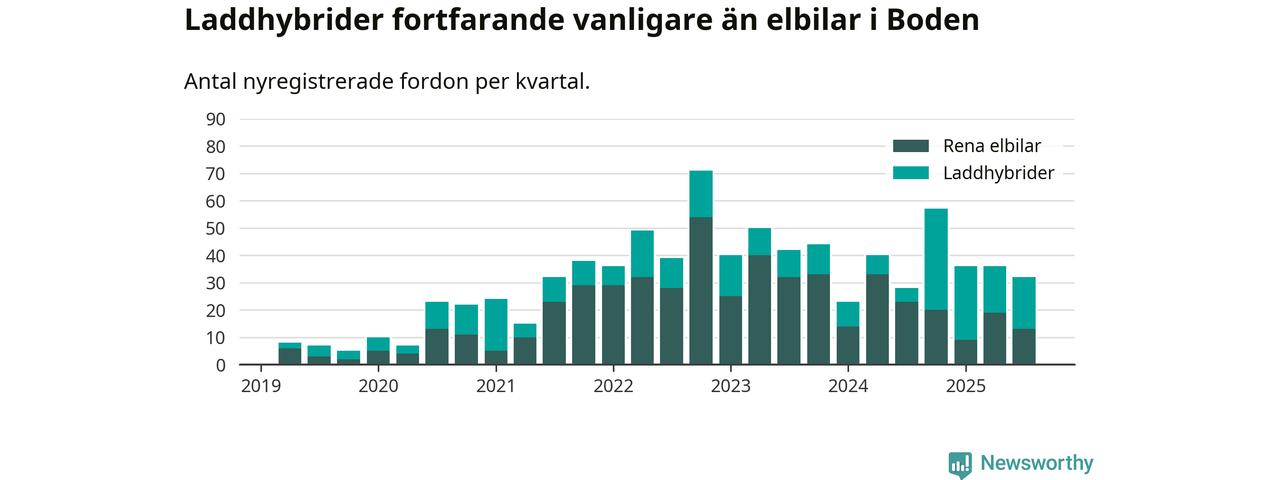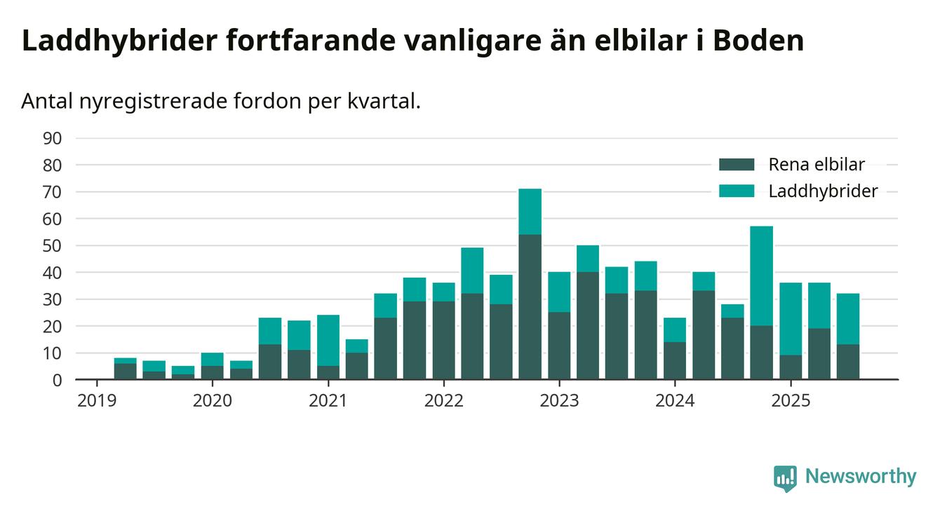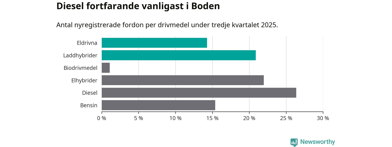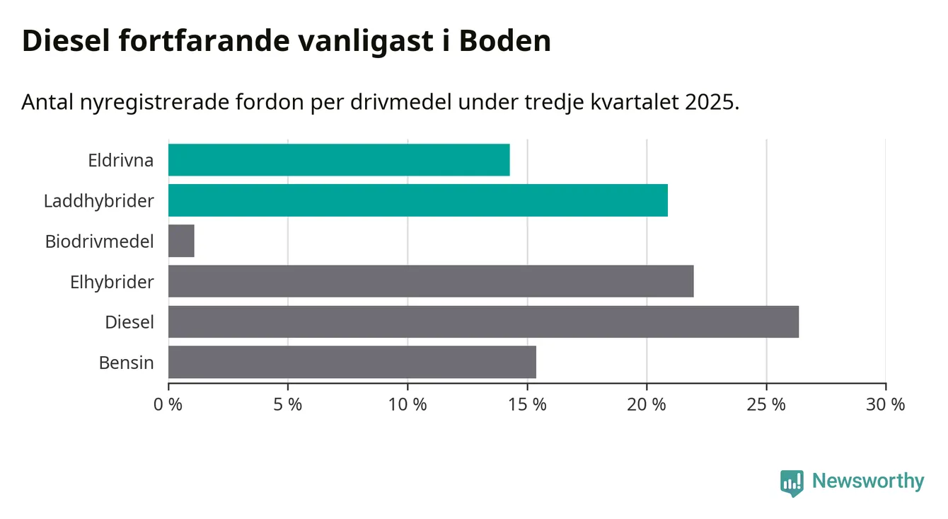 Under tredje kvartalet 2025 var 35 procent av alla nyregistrerade personbilar i Boden laddbara (sammanlagt registrerades 91 nya bilar). Merparten av de laddbara bilarna var så kallade laddhybrider, det vill säga fordon som går att ladda och köra på el, men som även har en förbränningsmotor. 14 procent av alla nya bilar var rena elbilar.