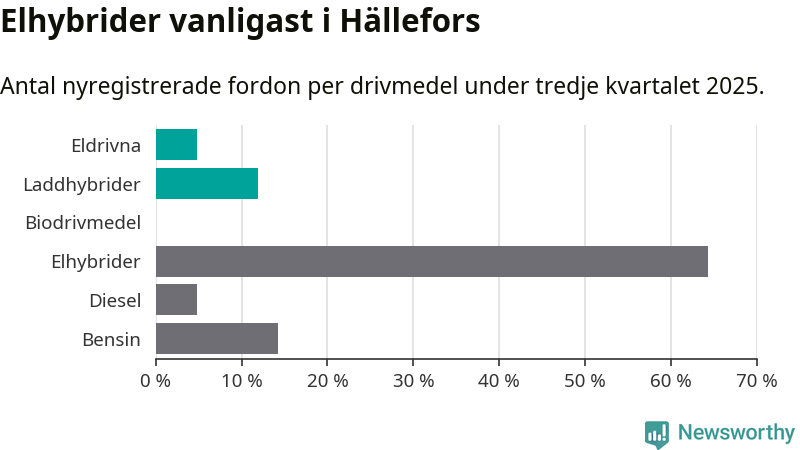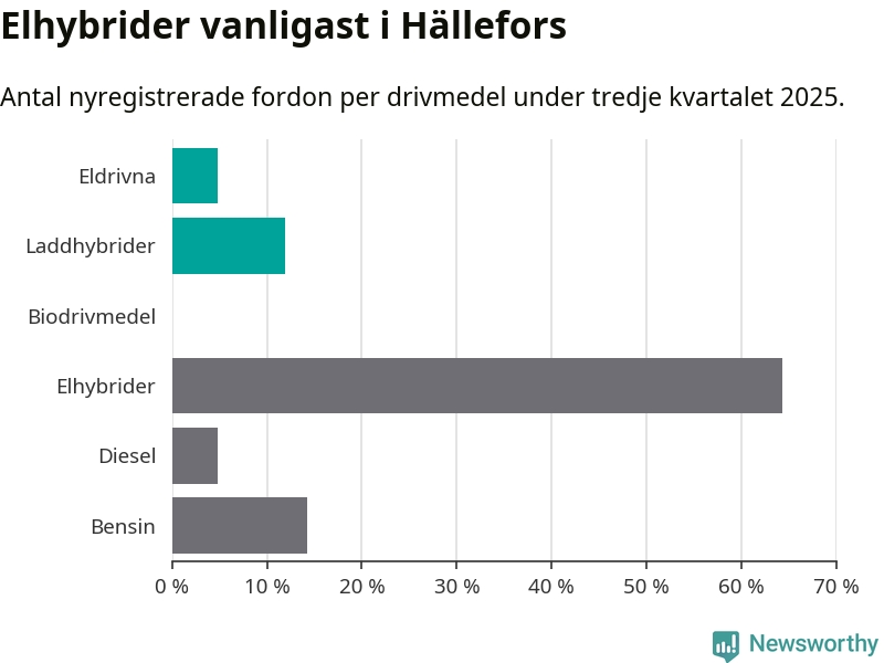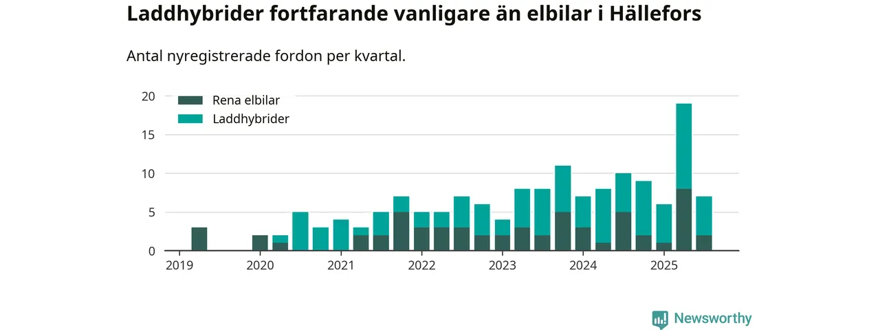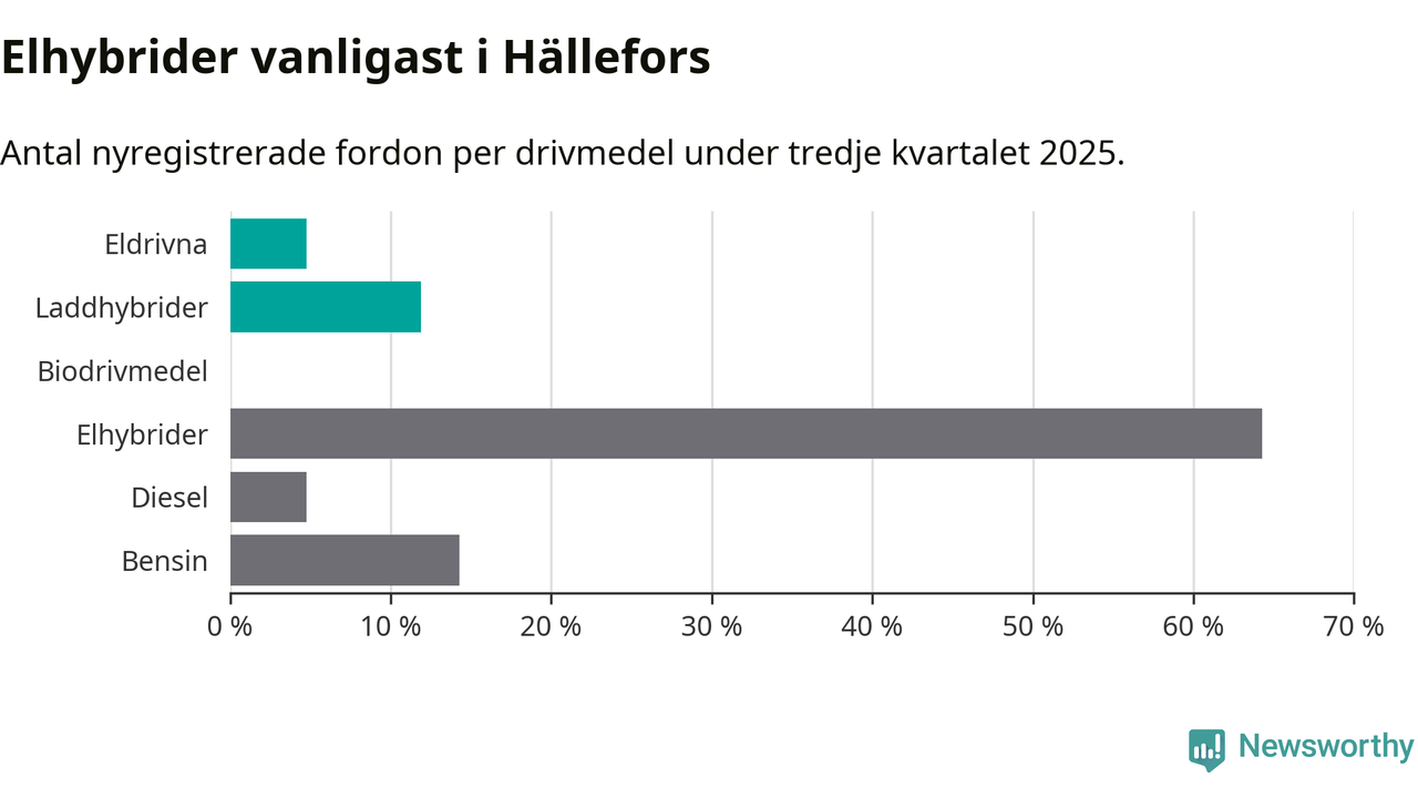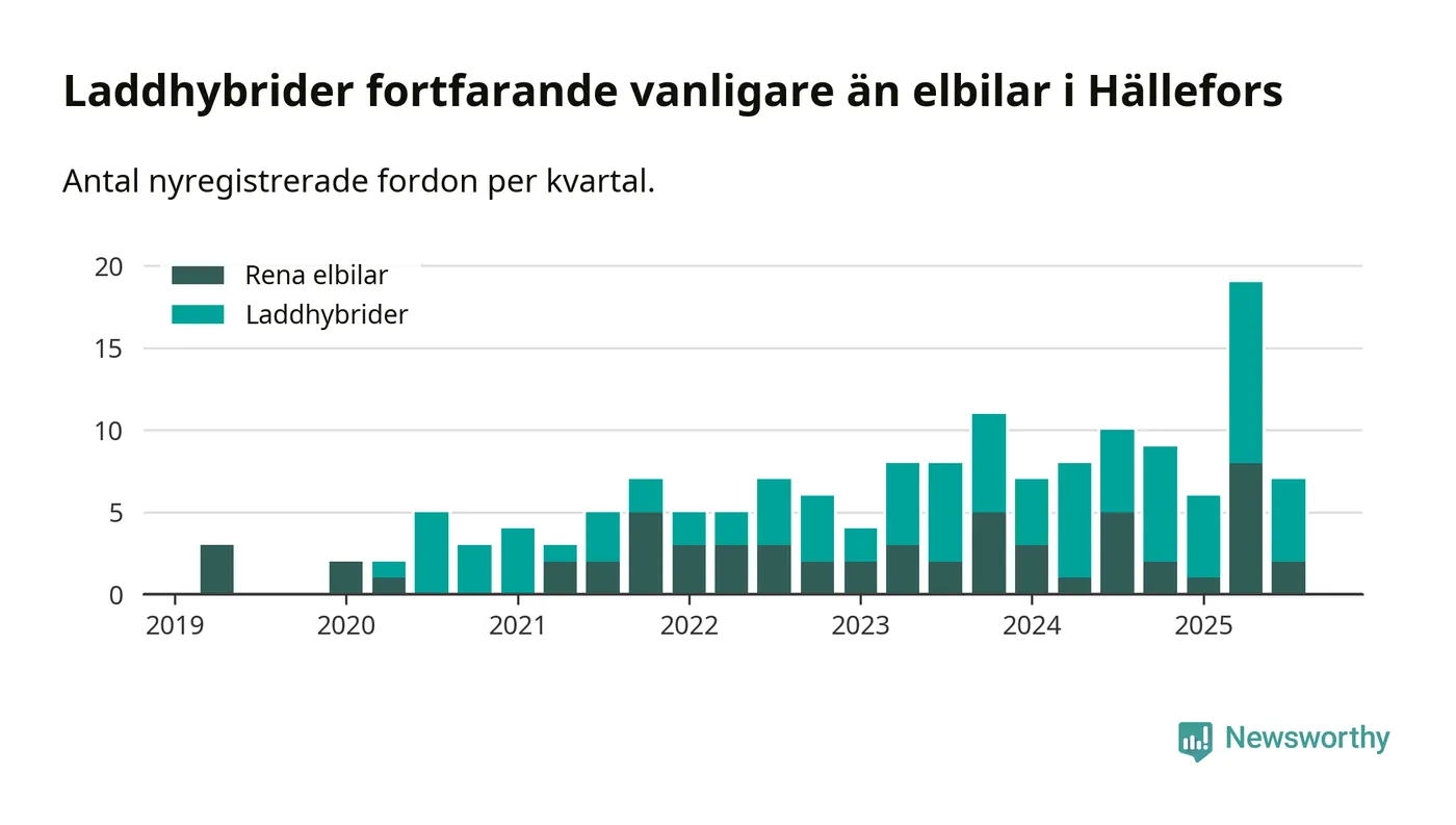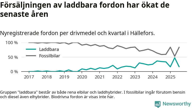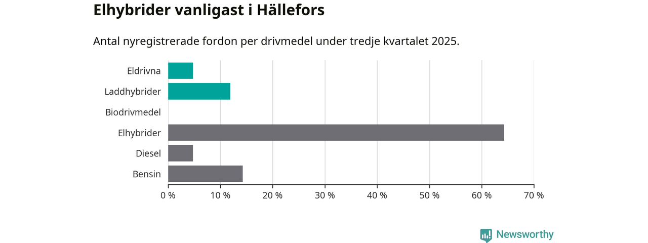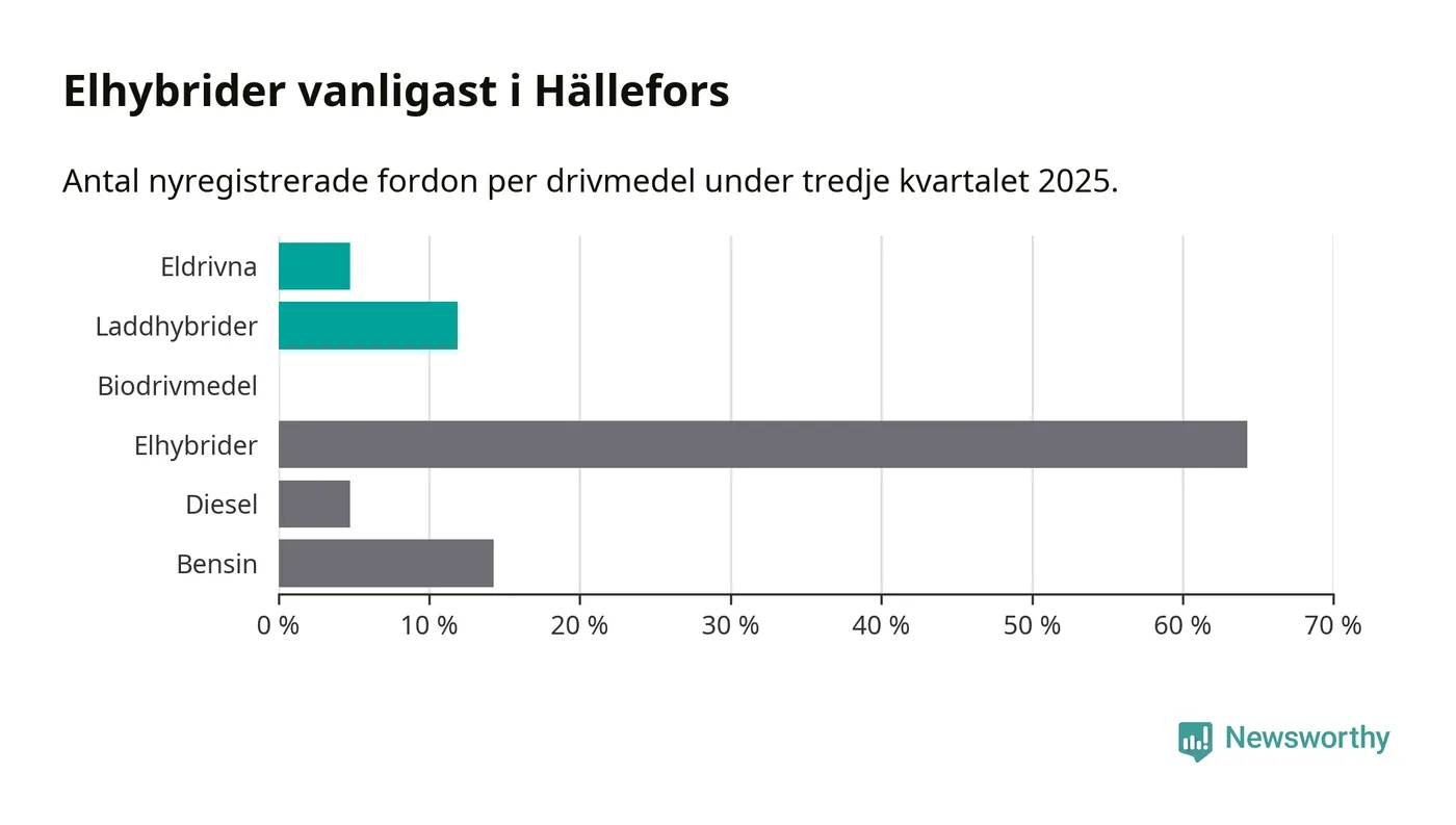 Under tredje kvartalet 2025 var 17 procent av alla nyregistrerade personbilar i Hällefors laddbara (sammanlagt registrerades 42 nya bilar). Merparten av de laddbara bilarna var så kallade laddhybrider, det vill säga fordon som går att ladda och köra på el, men som även har en förbränningsmotor. 5 procent av alla nya bilar var rena elbilar.