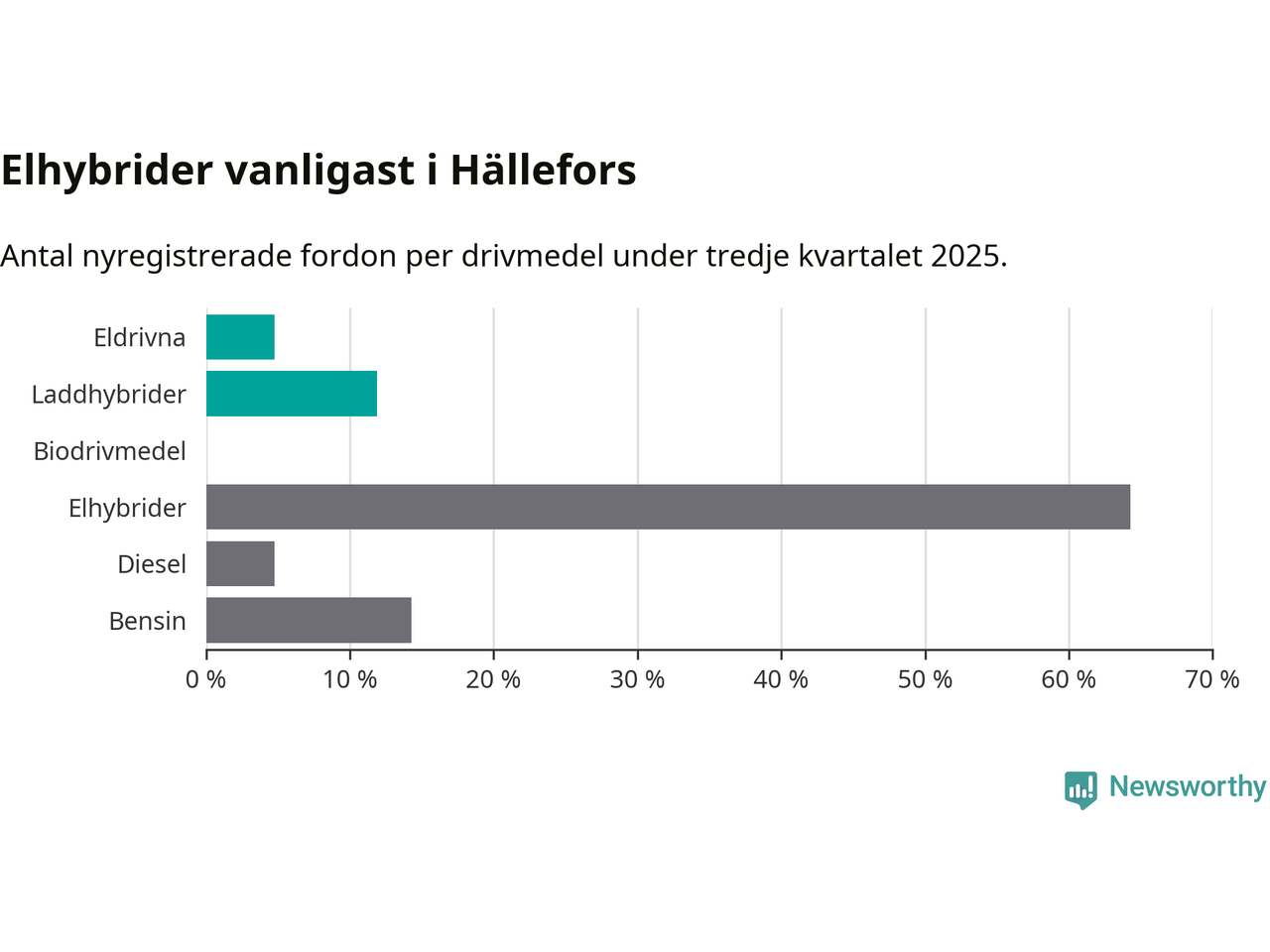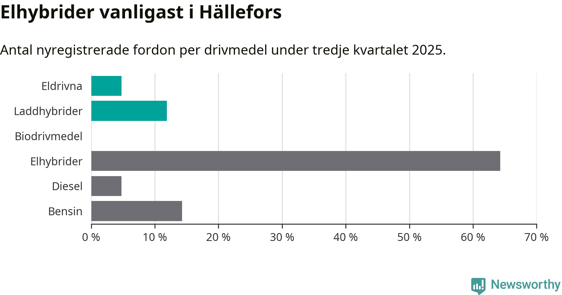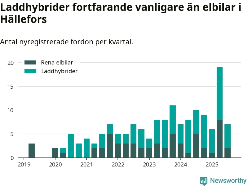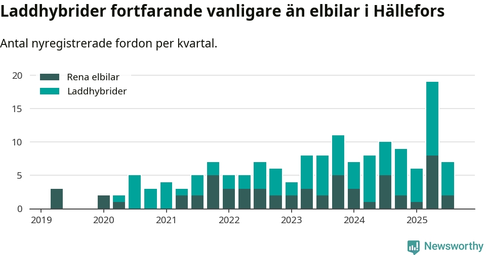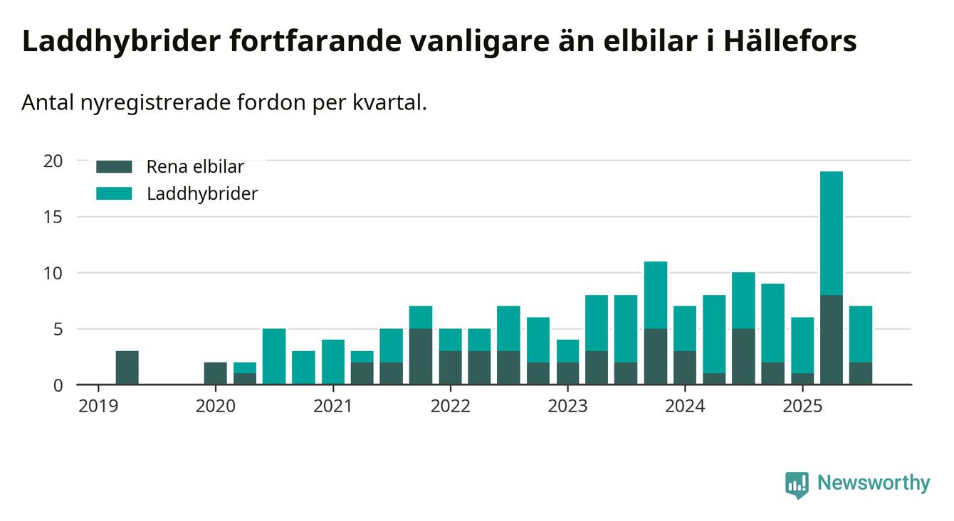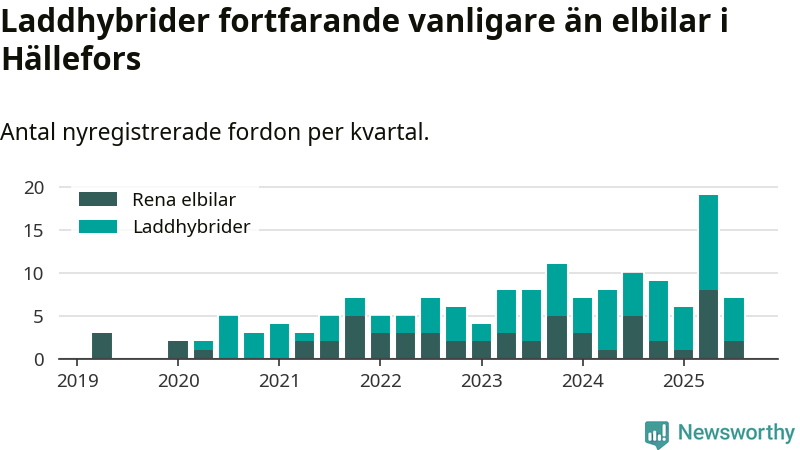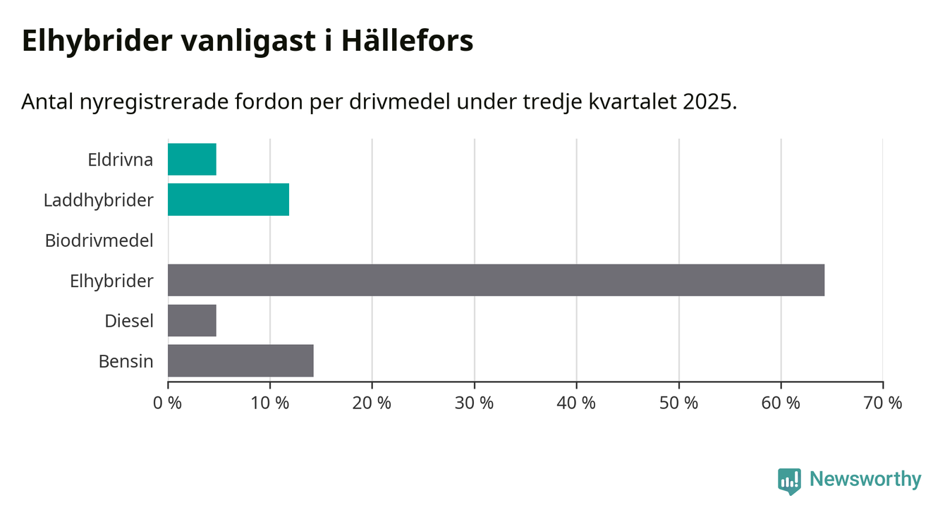 Under tredje kvartalet 2025 var 17 procent av alla nyregistrerade personbilar i Hällefors laddbara (sammanlagt registrerades 42 nya bilar). Merparten av de laddbara bilarna var så kallade laddhybrider, det vill säga fordon som går att ladda och köra på el, men som även har en förbränningsmotor. 5 procent av alla nya bilar var rena elbilar.