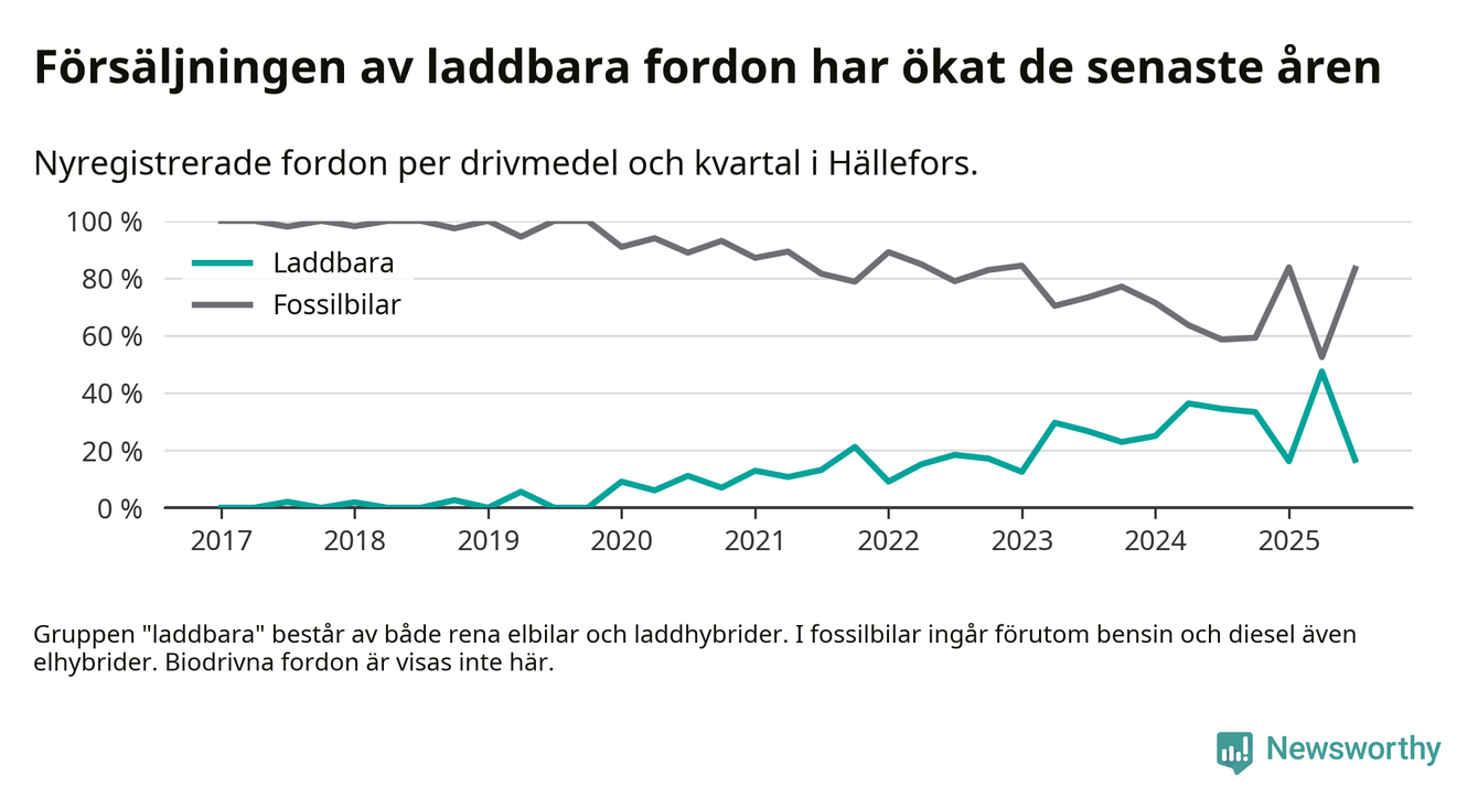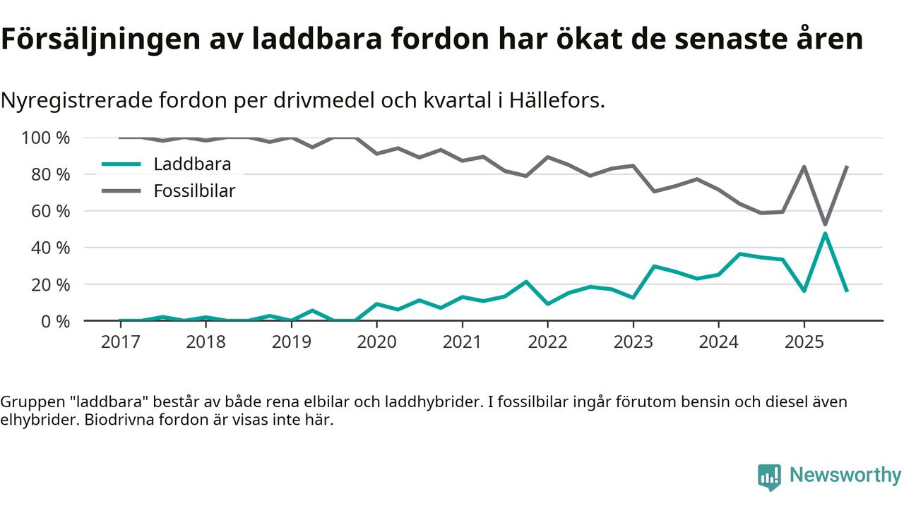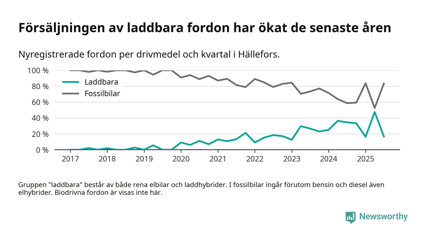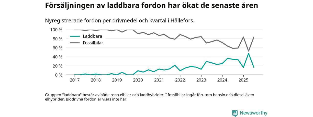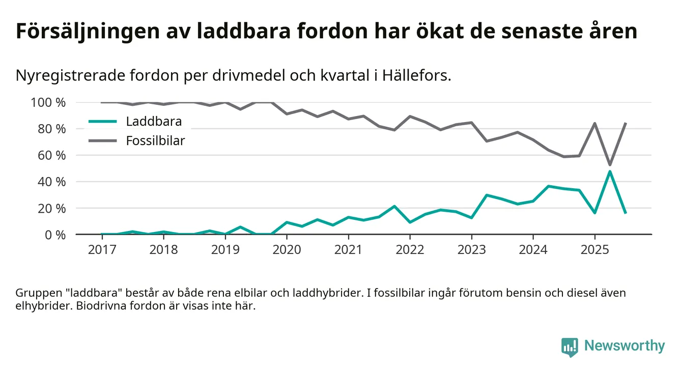 I Hällefors minskade andelen laddbara bilar under tredje kvartalet jämfört med kvartalet innan. Nyregistreringen peakade under andra kvartalet 2025 då 48 procent av de nya bilarna var laddbara.
