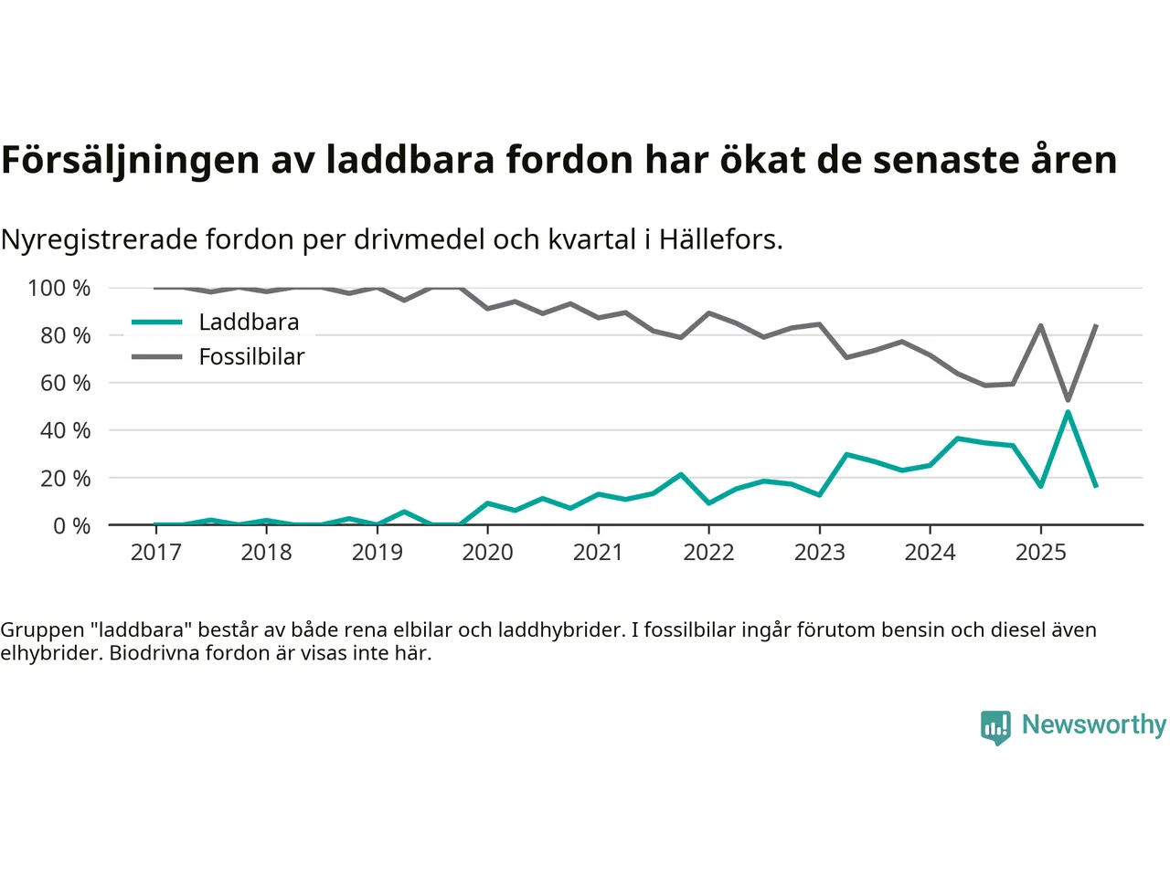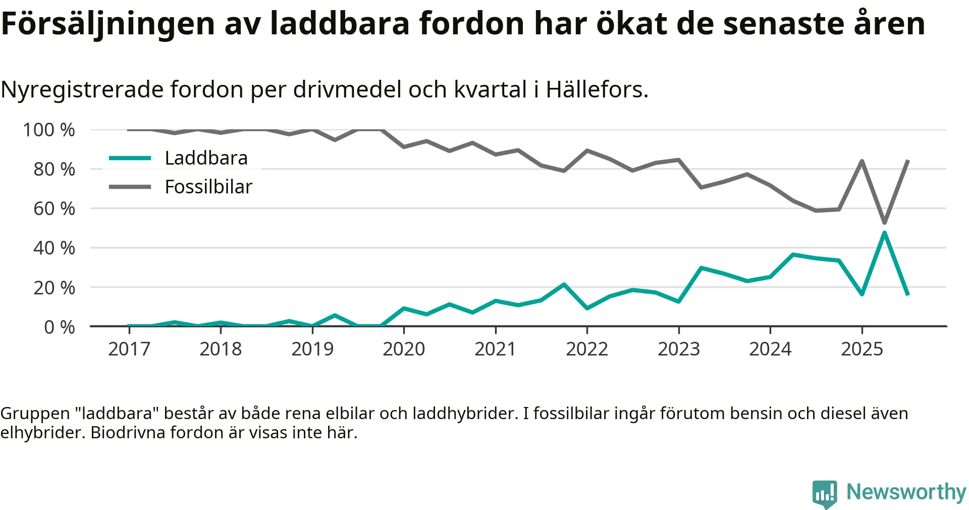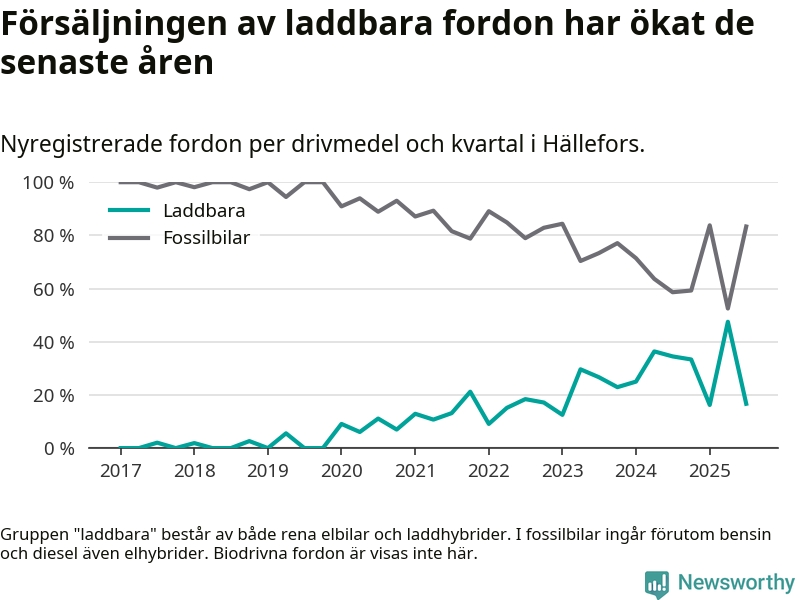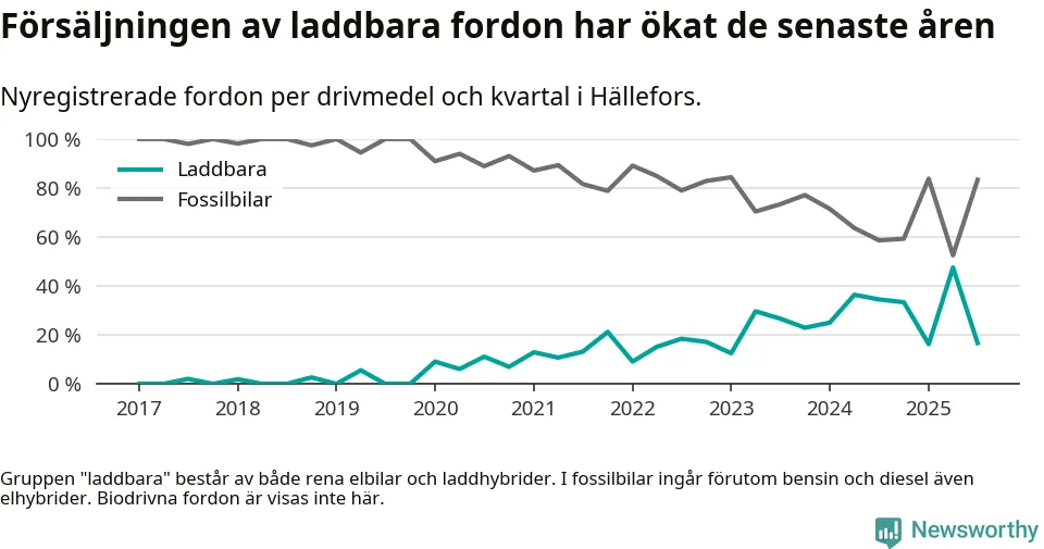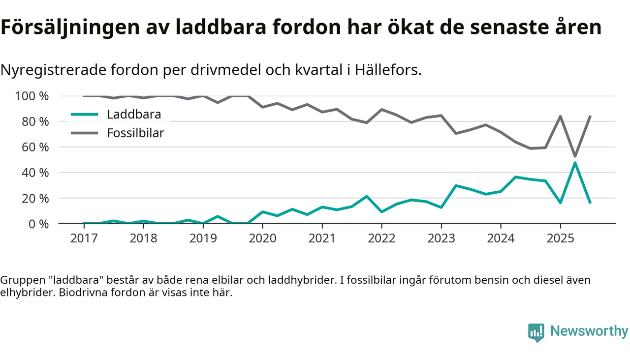 I Hällefors minskade andelen laddbara bilar under tredje kvartalet jämfört med kvartalet innan. Nyregistreringen peakade under andra kvartalet 2025 då 48 procent av de nya bilarna var laddbara.