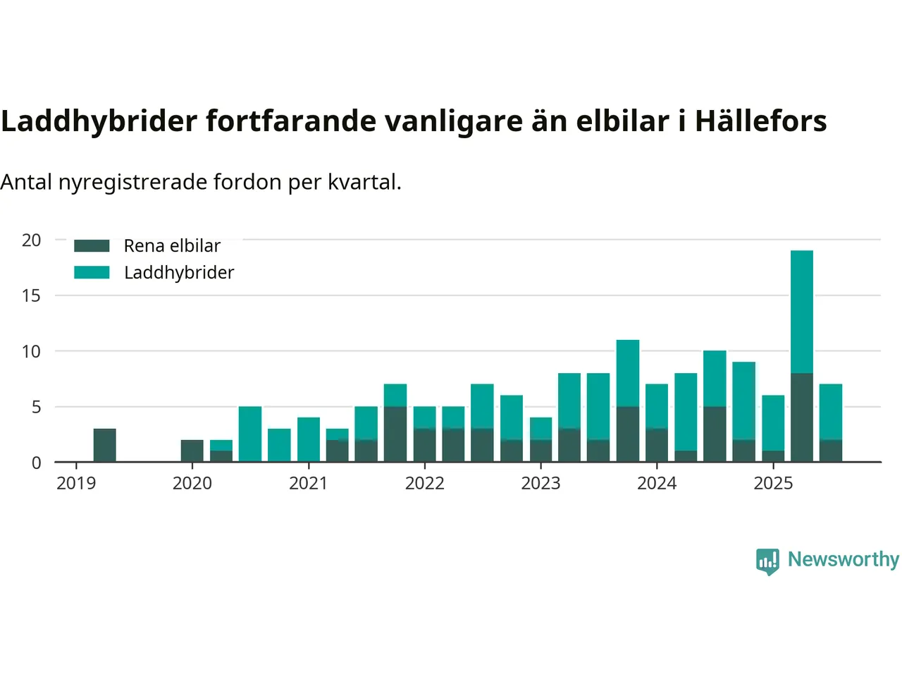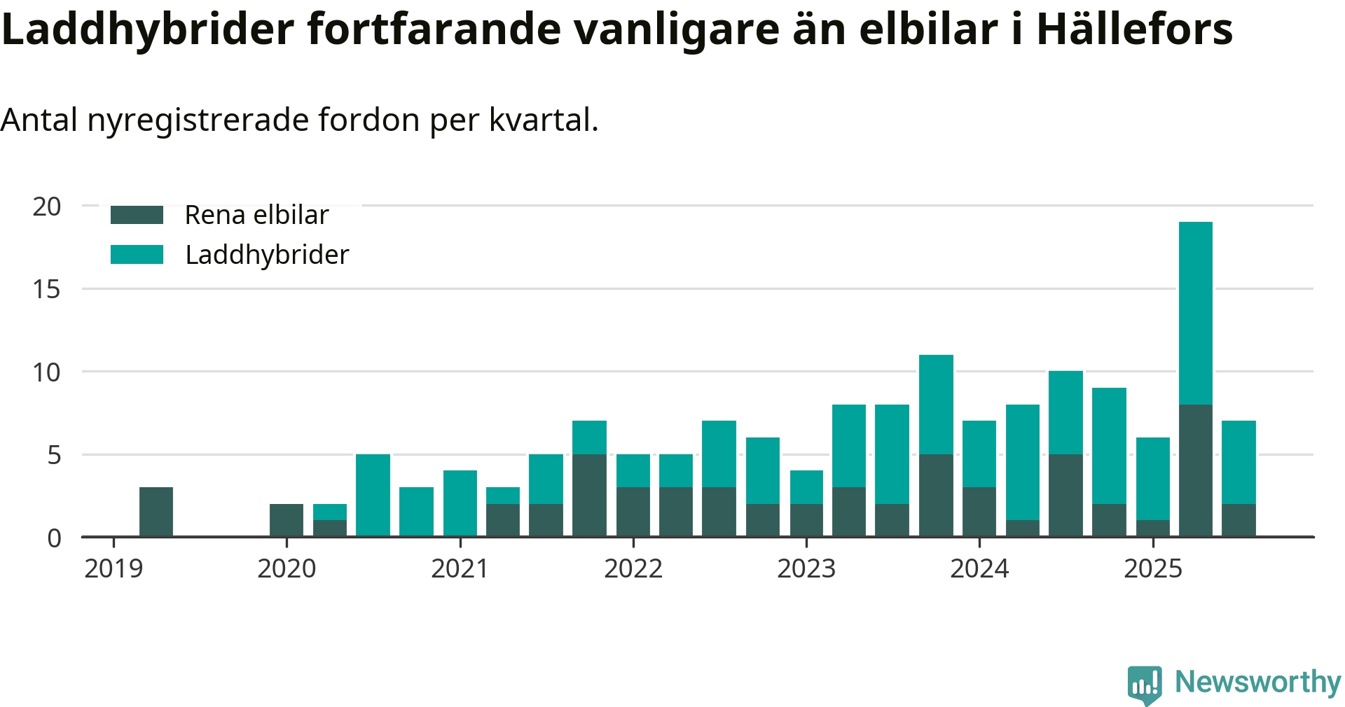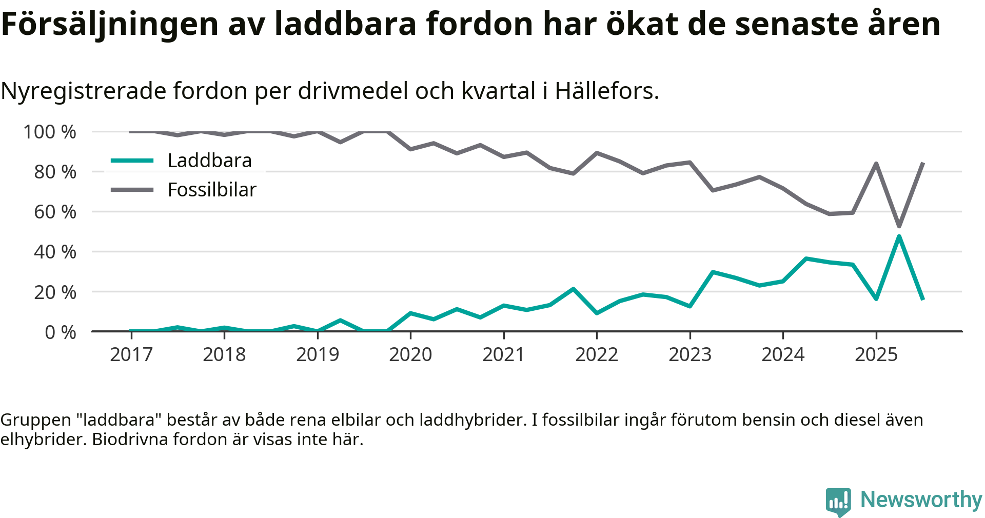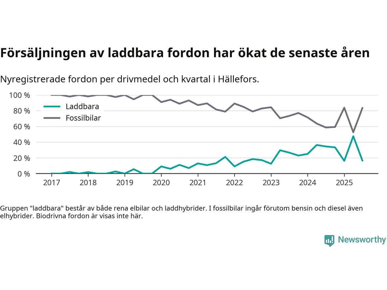 I Hällefors minskade andelen laddbara bilar under tredje kvartalet jämfört med kvartalet innan. Nyregistreringen peakade under andra kvartalet 2025 då 48 procent av de nya bilarna var laddbara.