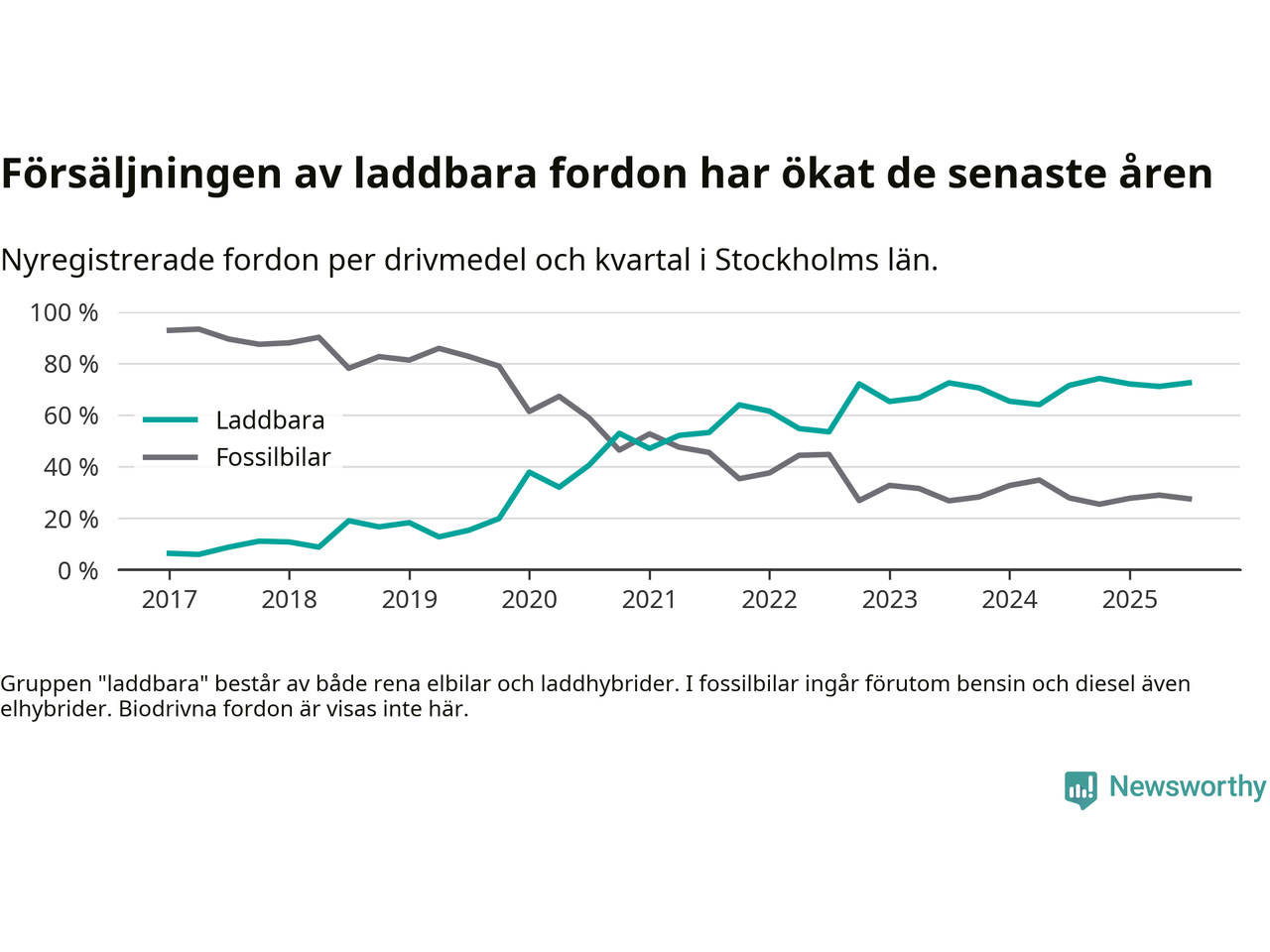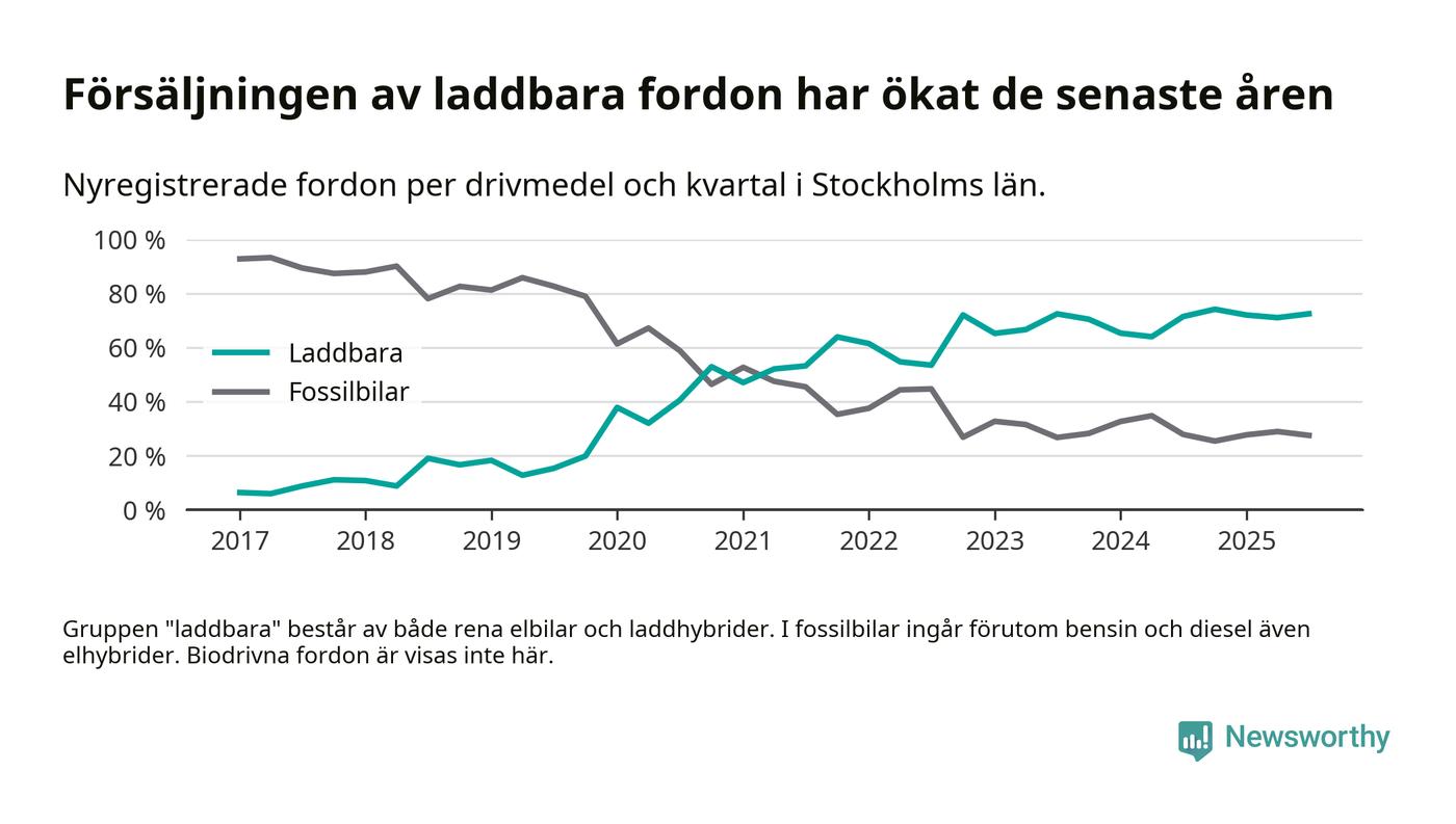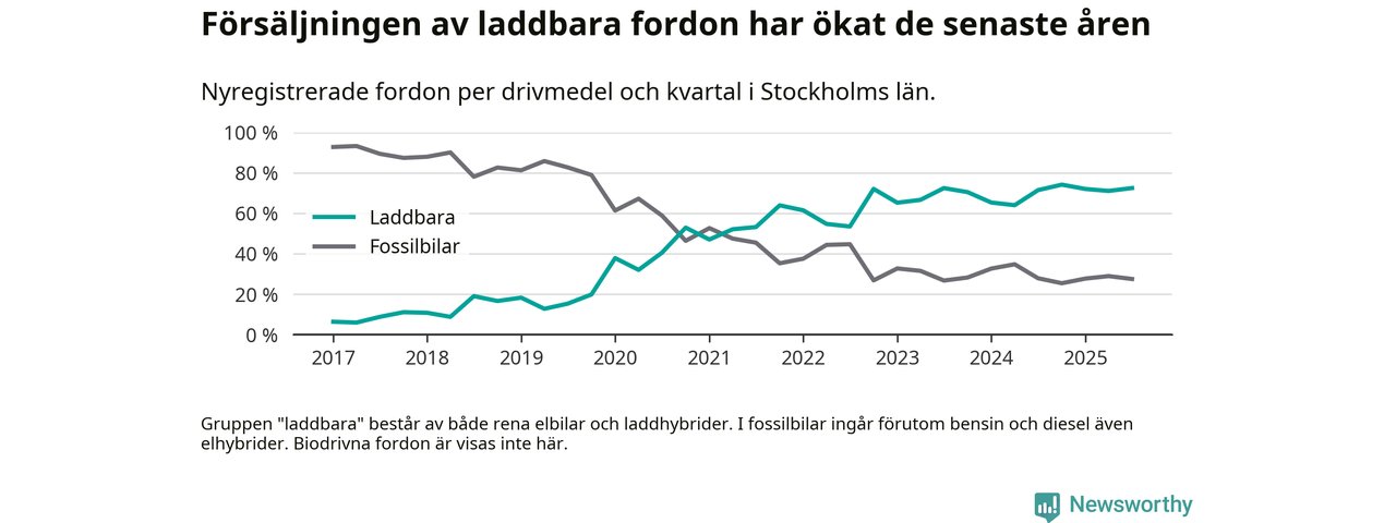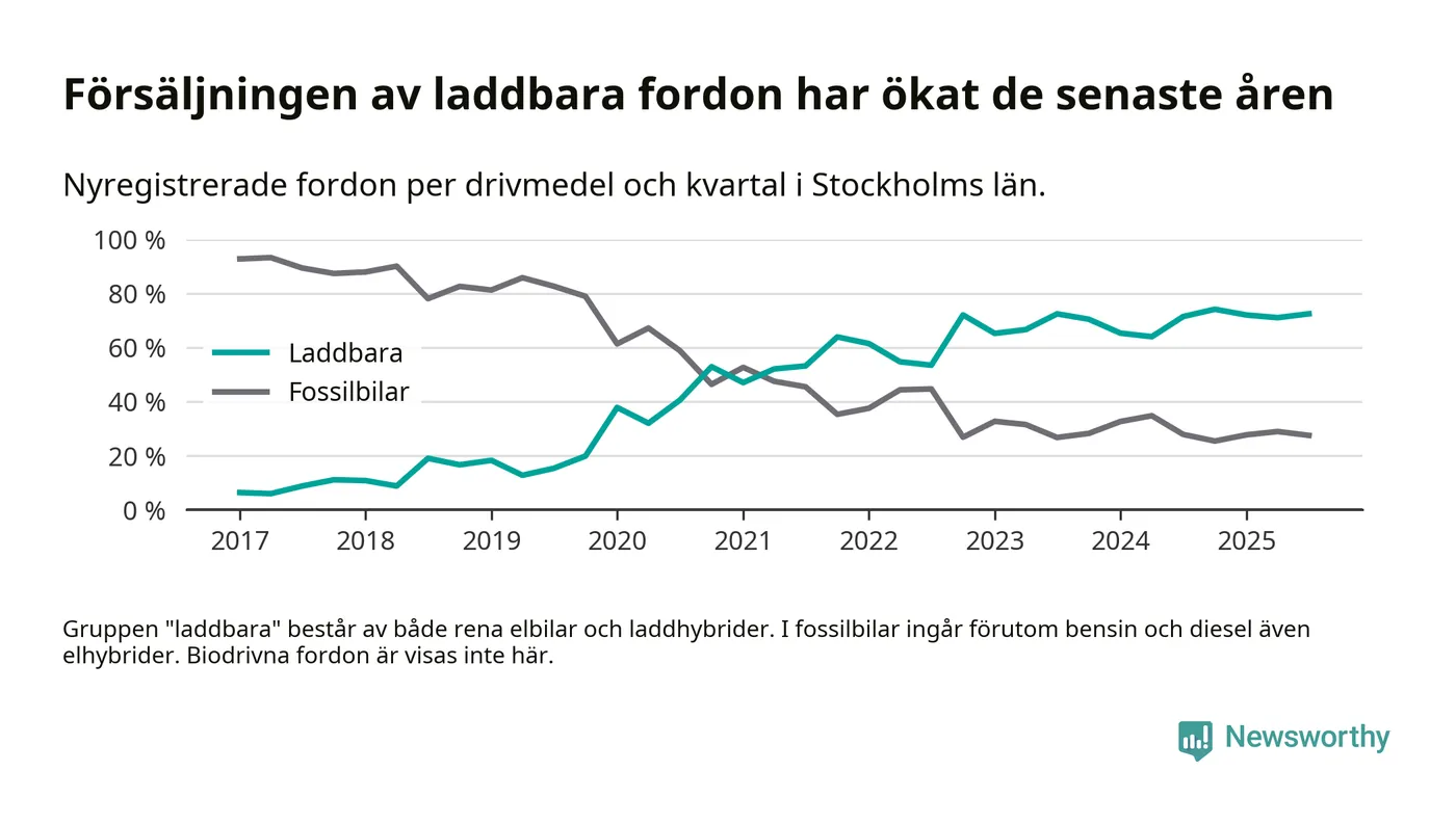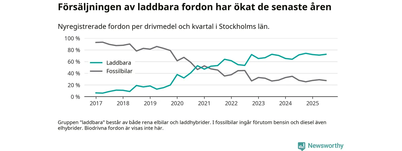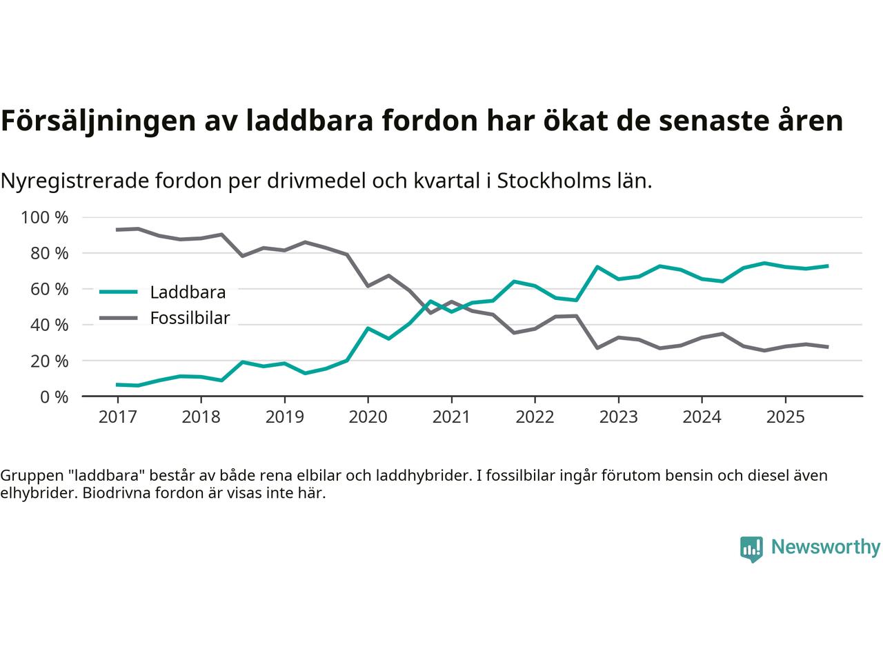 Under tredje kvartalet 2025 var 72 procent av alla nyregistrerade personbilar i Stockholms län laddbara (sammanlagt registrerades 23 590 nya bilar). Merparten av de laddbara bilarna var rena elbilar (44 procent av alla).