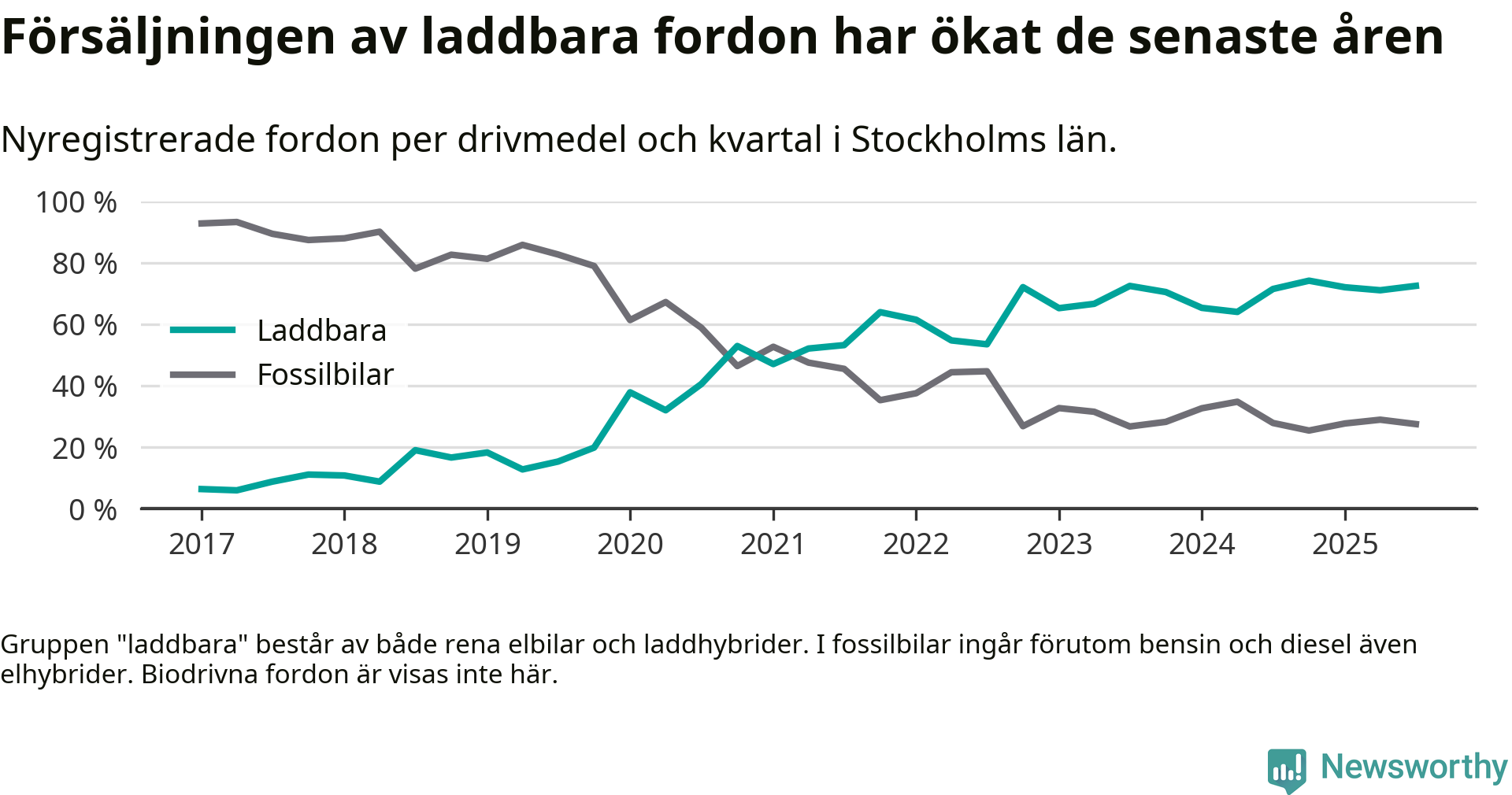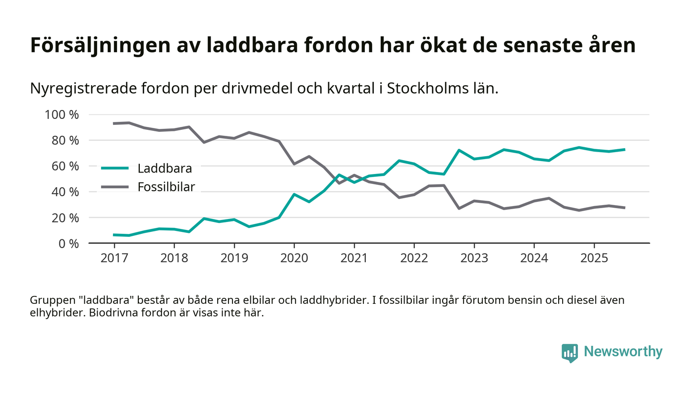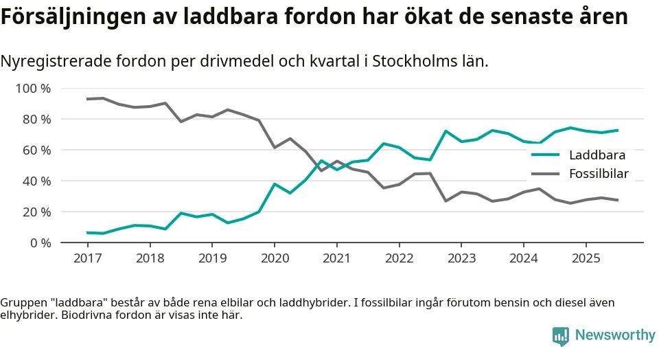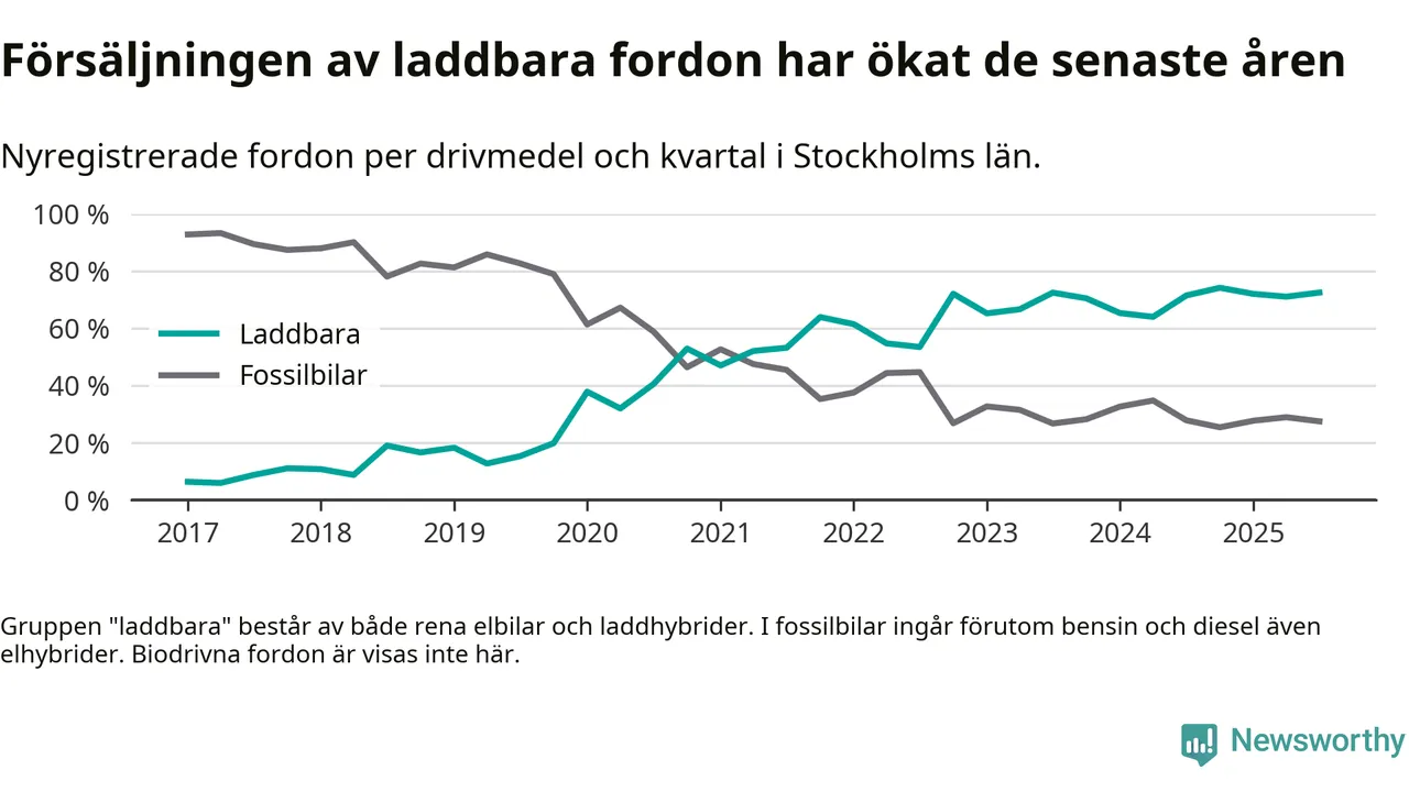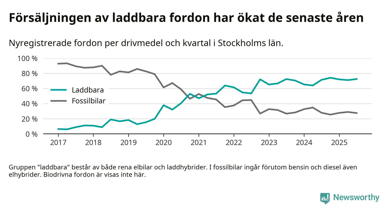 Under tredje kvartalet 2025 var 72 procent av alla nyregistrerade personbilar i Stockholms län laddbara (sammanlagt registrerades 23 590 nya bilar). Merparten av de laddbara bilarna var rena elbilar (44 procent av alla).