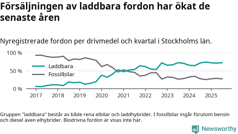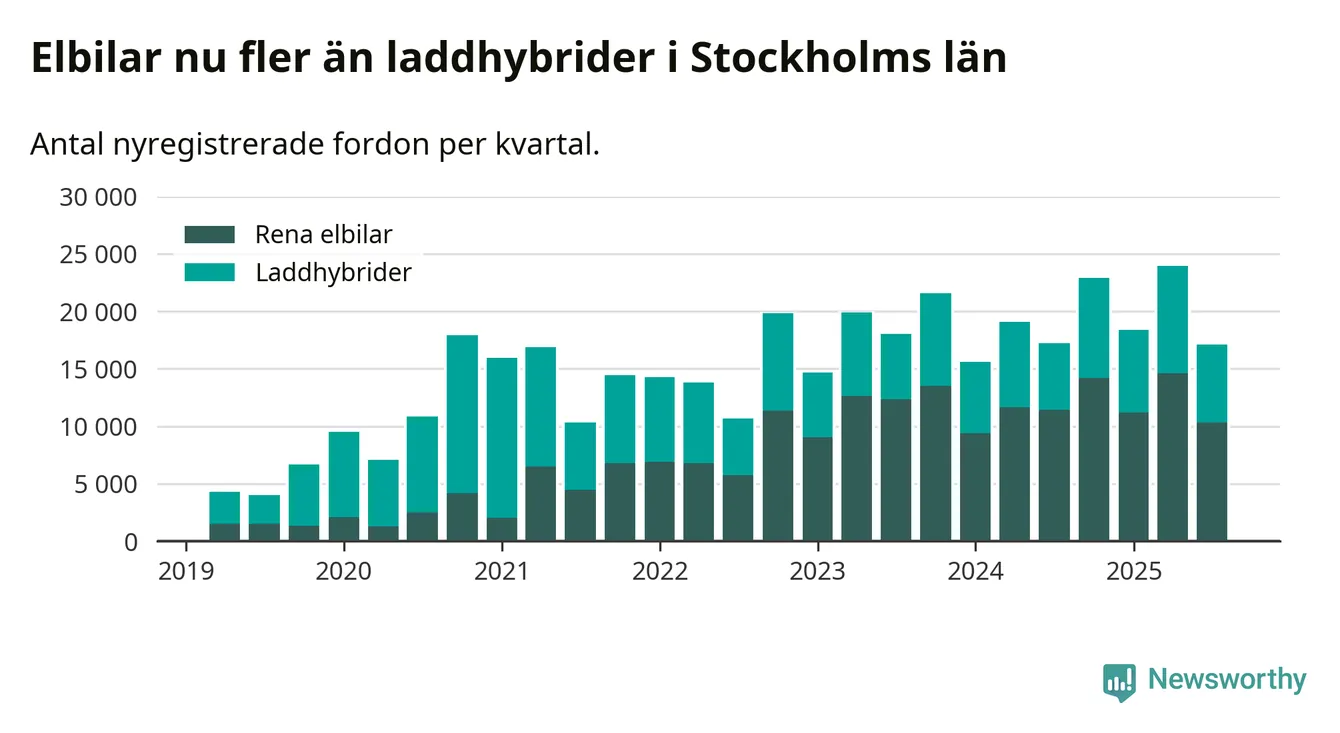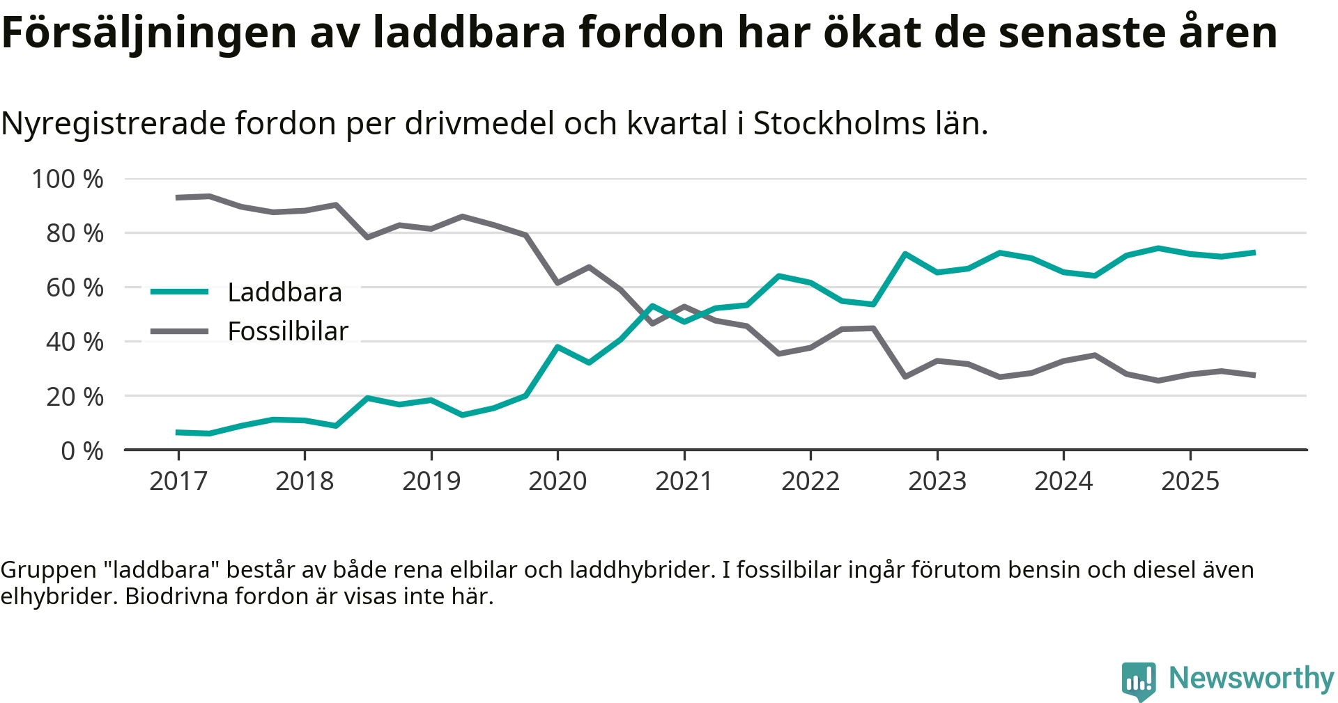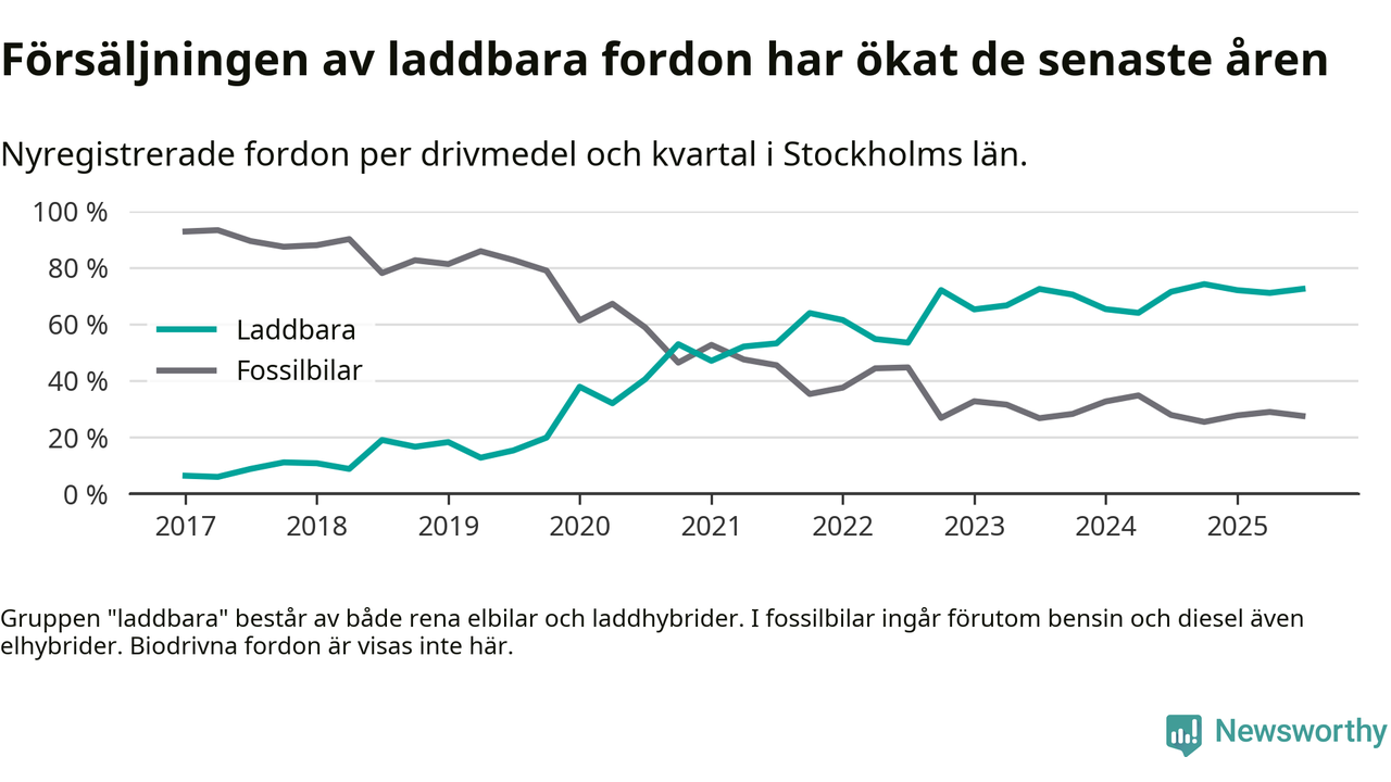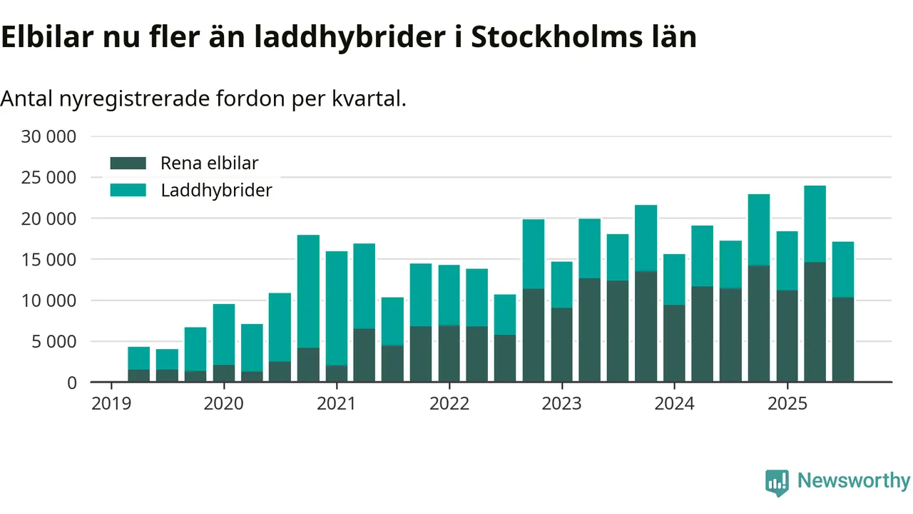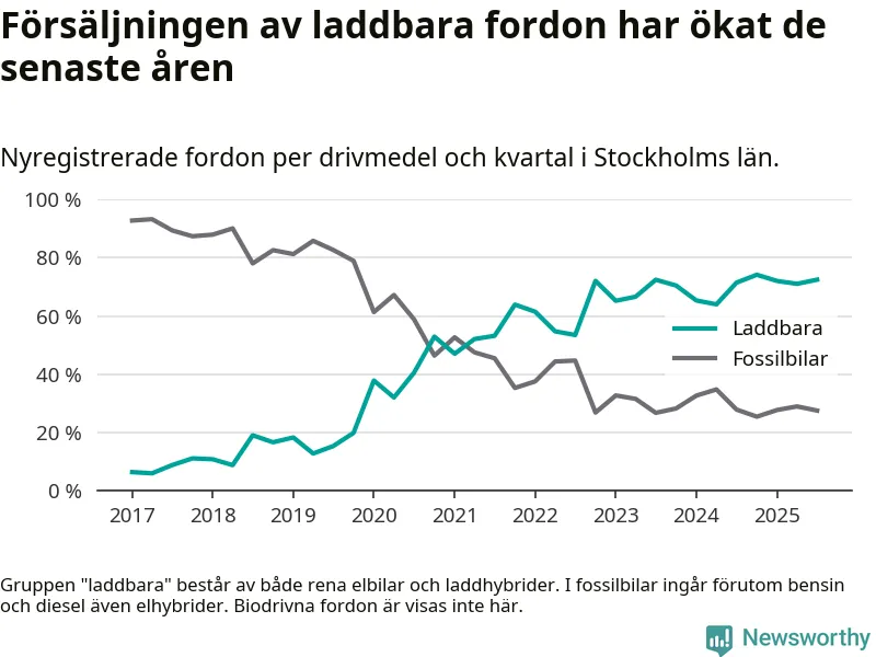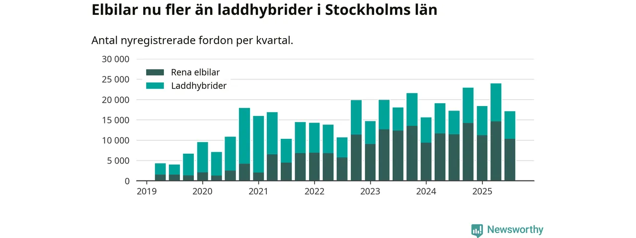 Under tredje kvartalet 2025 var 72 procent av alla nyregistrerade personbilar i Stockholms län laddbara (sammanlagt registrerades 23 590 nya bilar). Merparten av de laddbara bilarna var rena elbilar (44 procent av alla).