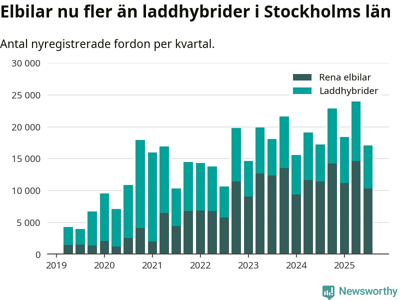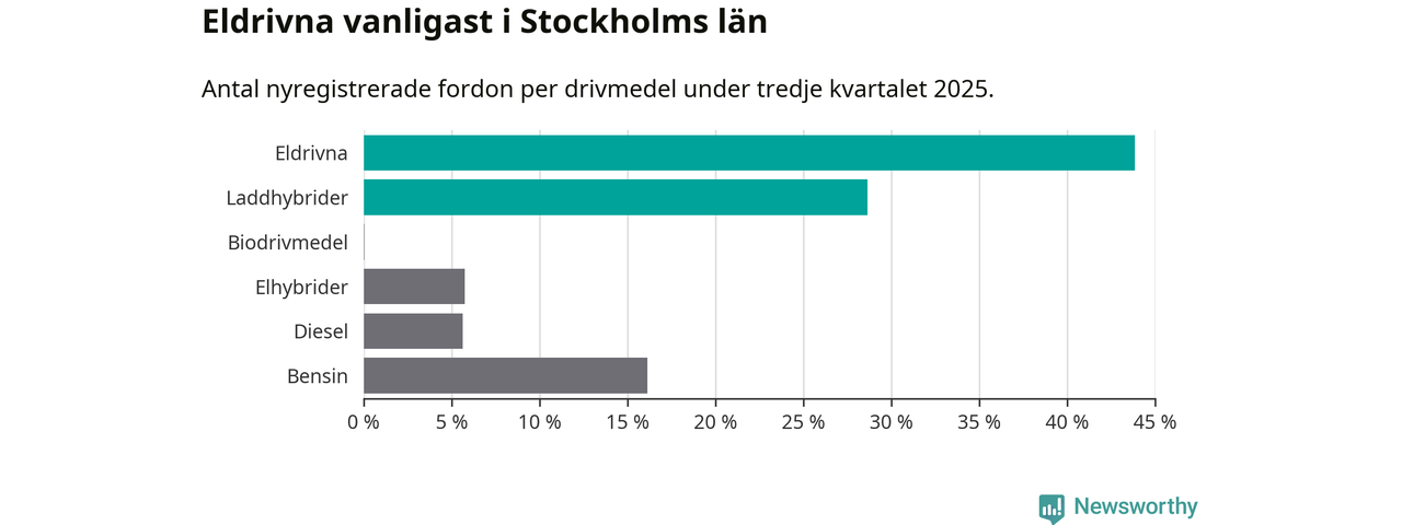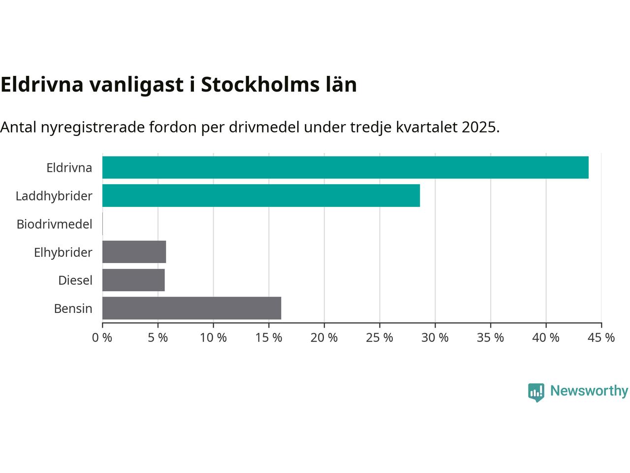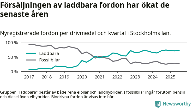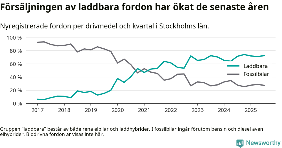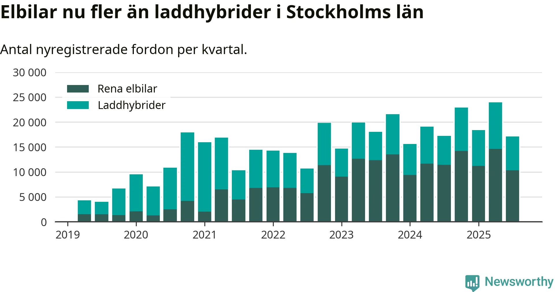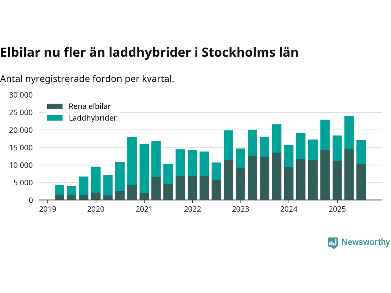Under tredje kvartalet 2025 var 72 procent av alla nyregistrerade personbilar i Stockholms län laddbara (sammanlagt registrerades 23 590 nya bilar). Merparten av de laddbara bilarna var rena elbilar (44 procent av alla).