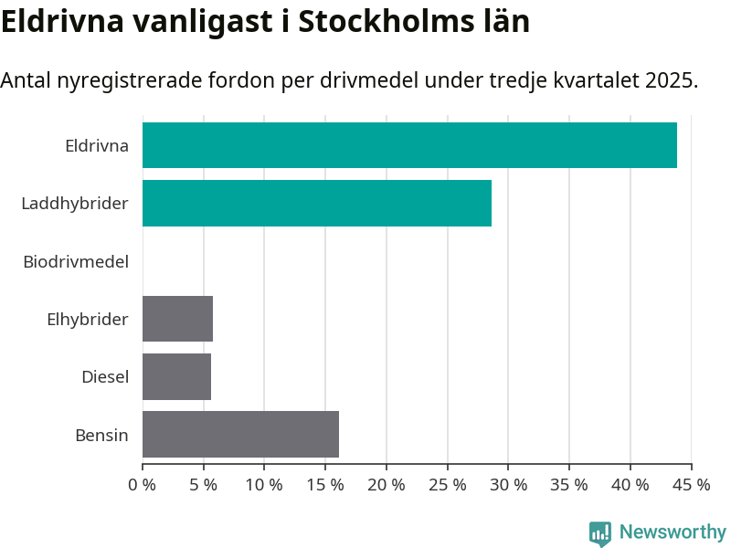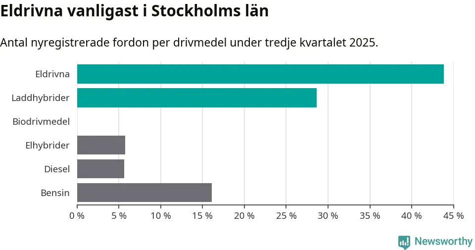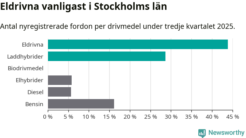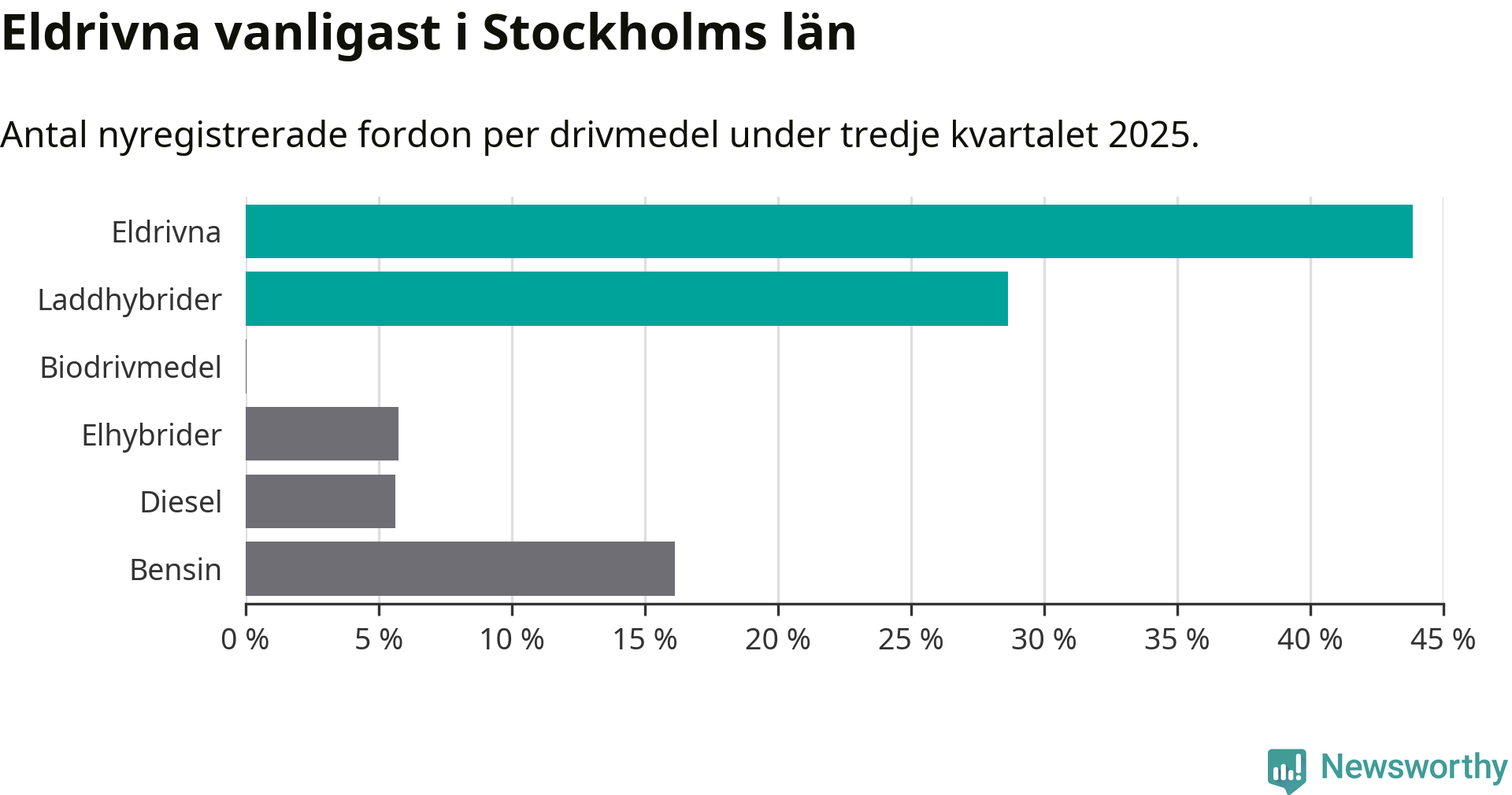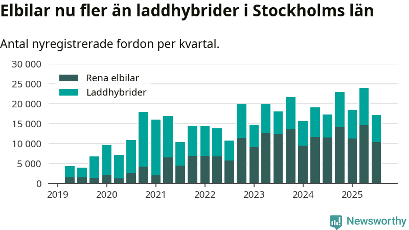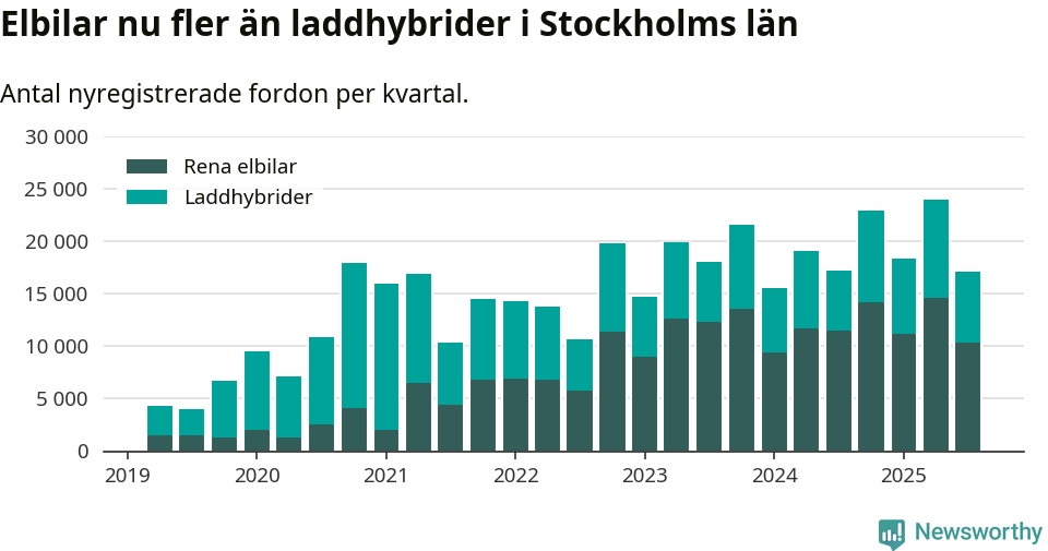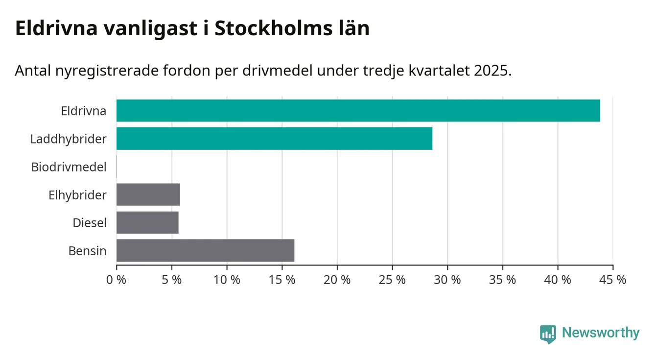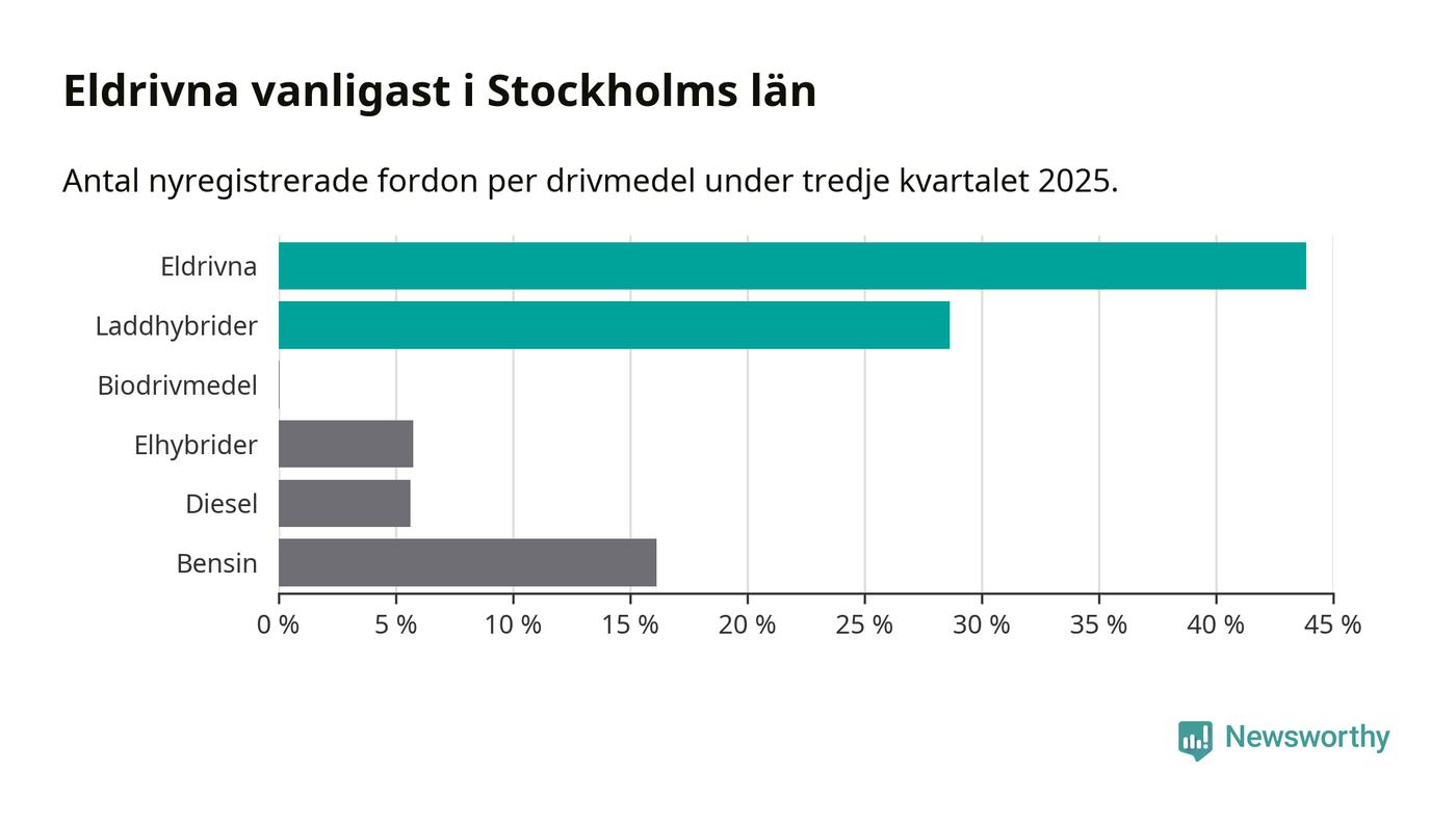 Under tredje kvartalet 2025 var 72 procent av alla nyregistrerade personbilar i Stockholms län laddbara (sammanlagt registrerades 23 590 nya bilar). Merparten av de laddbara bilarna var rena elbilar (44 procent av alla).