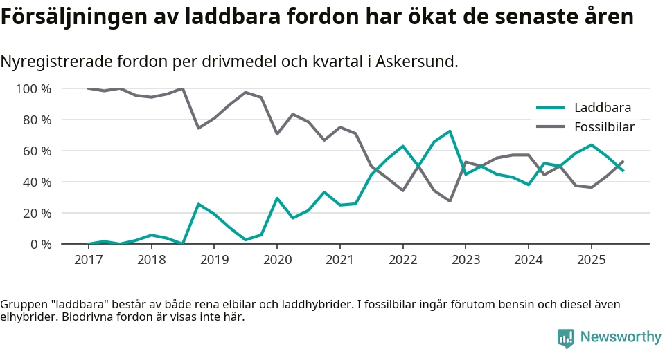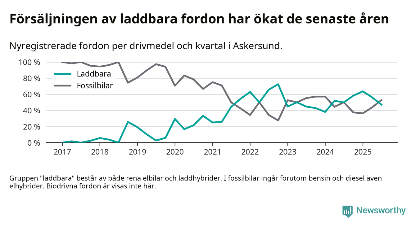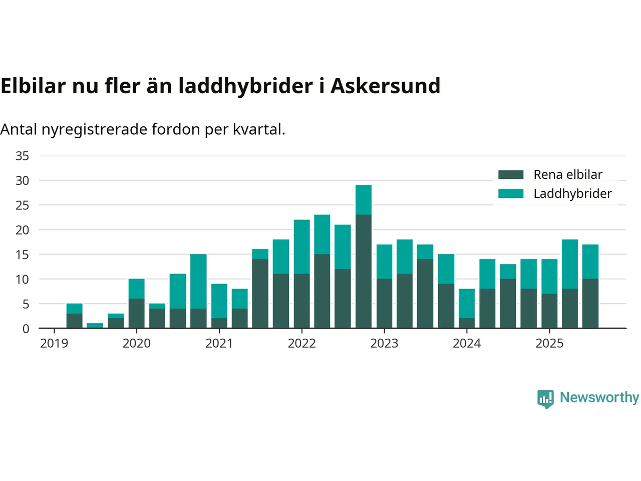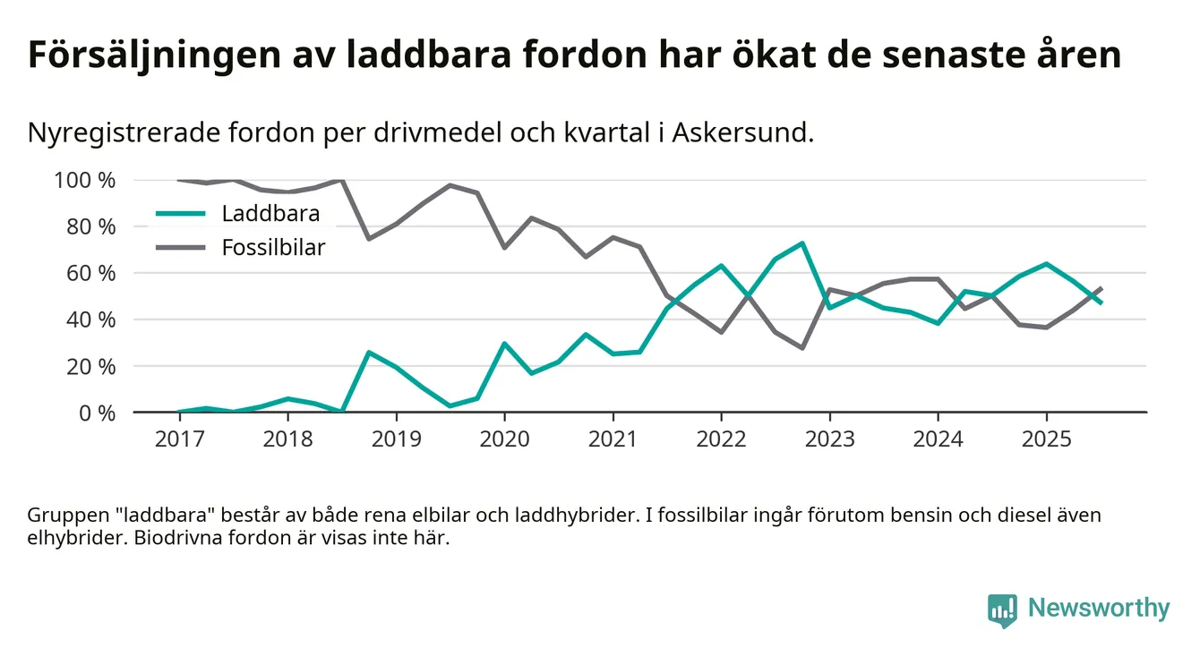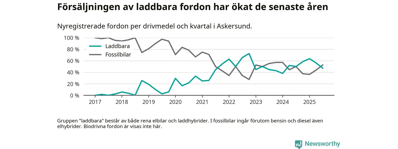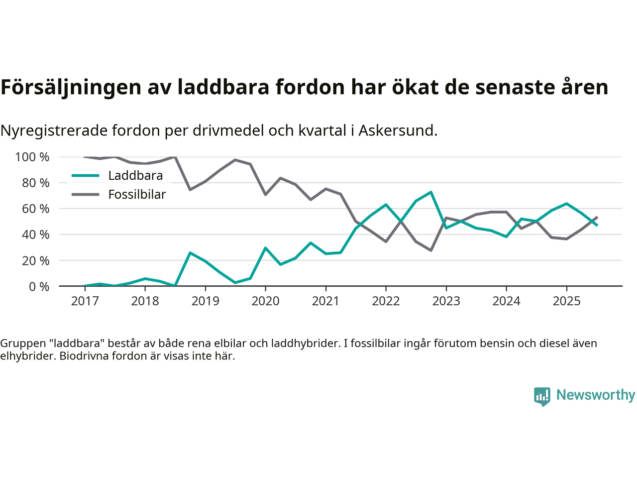 Under tredje kvartalet 2025 var 47 procent av alla nyregistrerade personbilar i Askersund laddbara (sammanlagt registrerades 36 nya bilar). Merparten av de laddbara bilarna var rena elbilar (28 procent av alla).