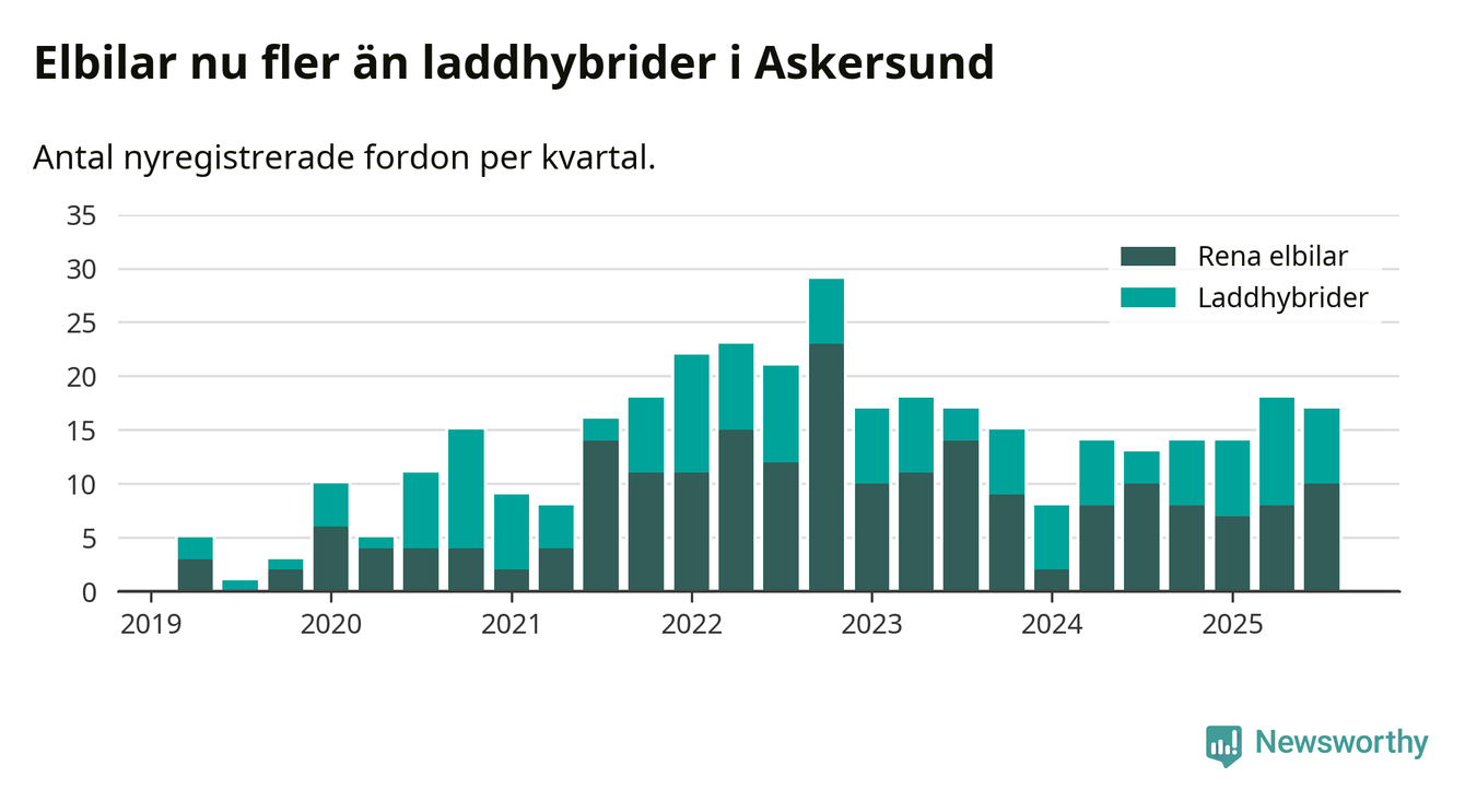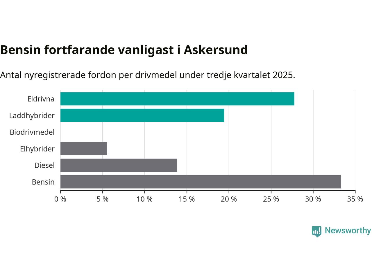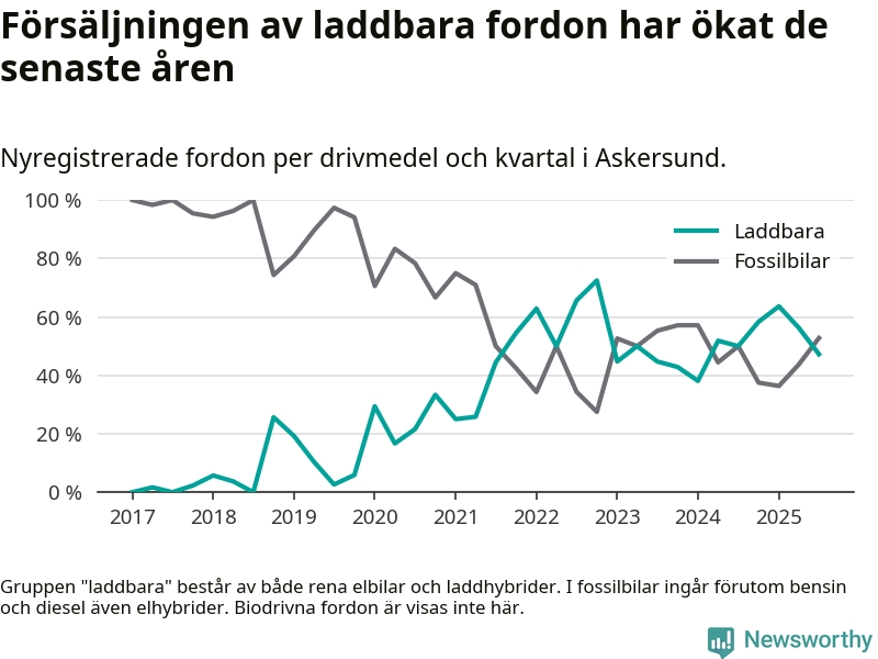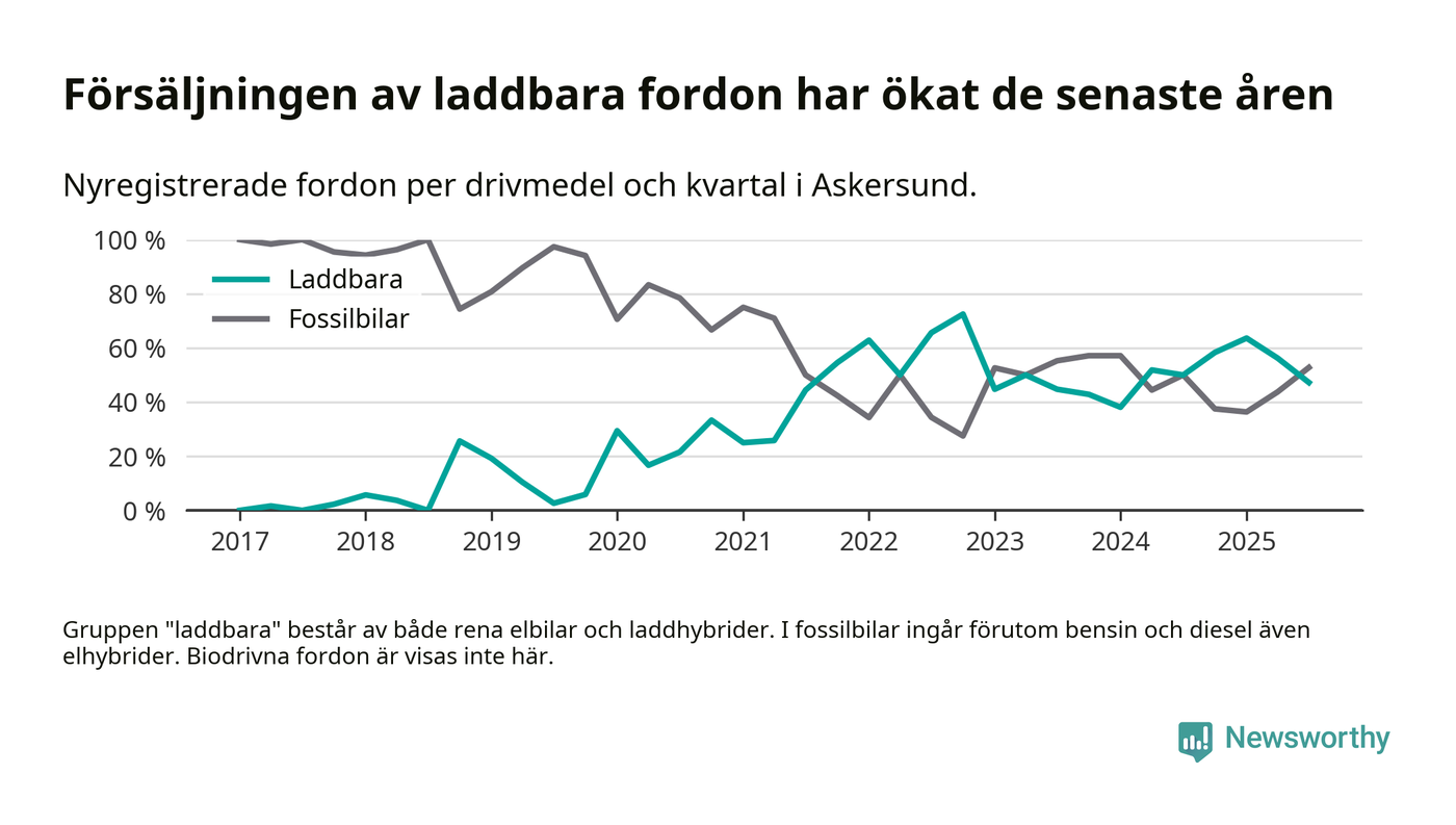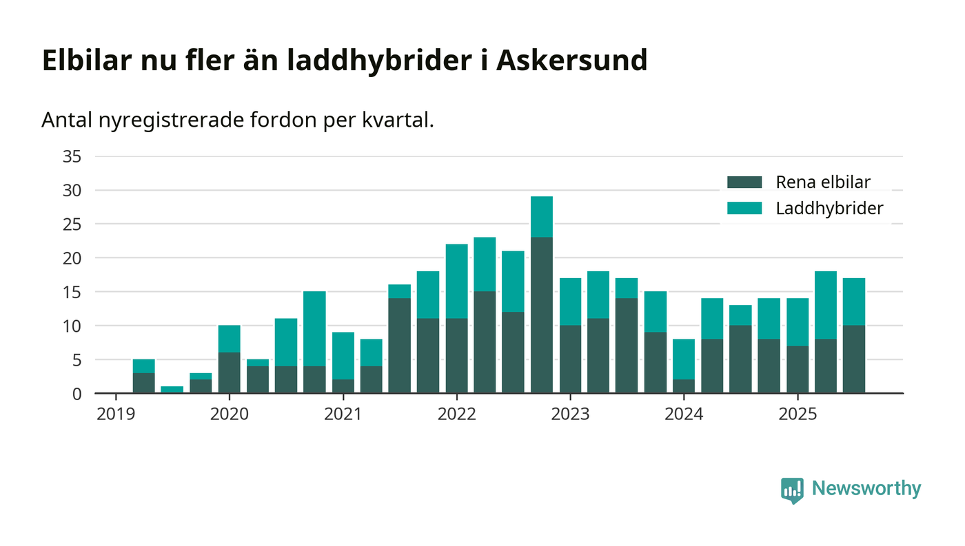Under tredje kvartalet 2025 var 47 procent av alla nyregistrerade personbilar i Askersund laddbara (sammanlagt registrerades 36 nya bilar). Merparten av de laddbara bilarna var rena elbilar (28 procent av alla).