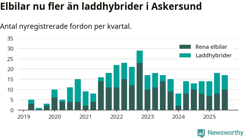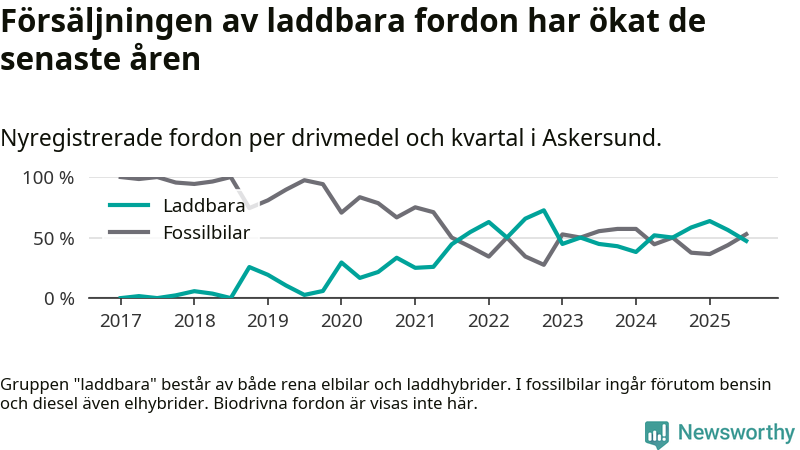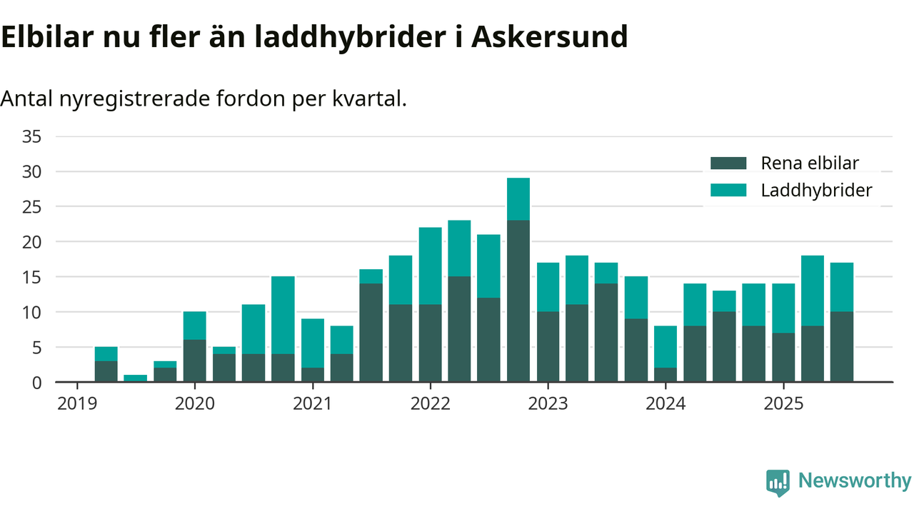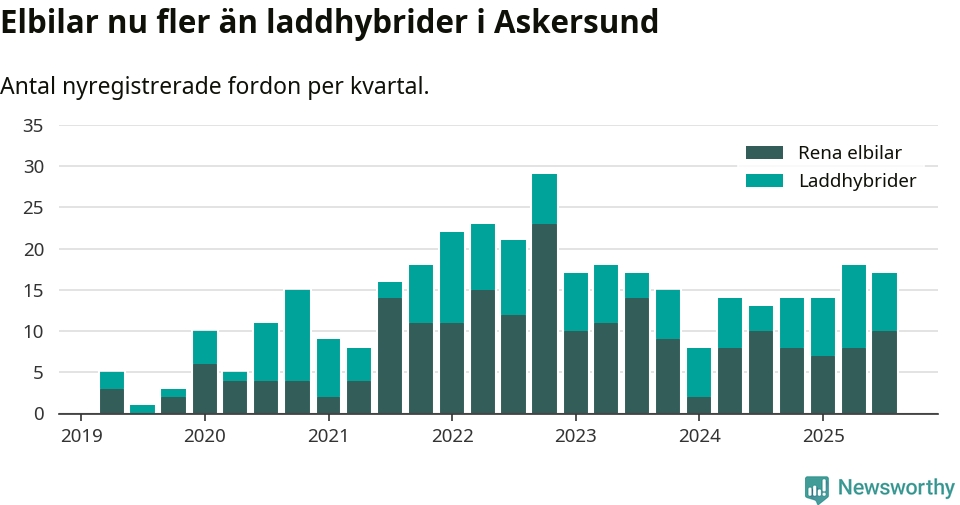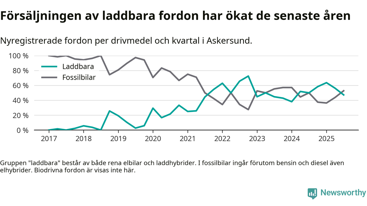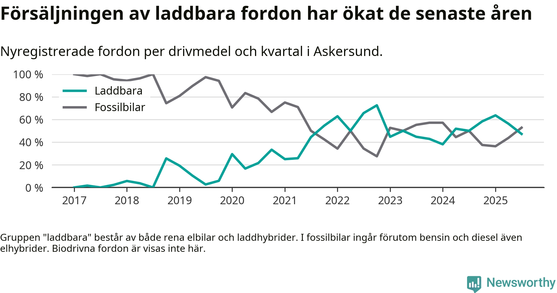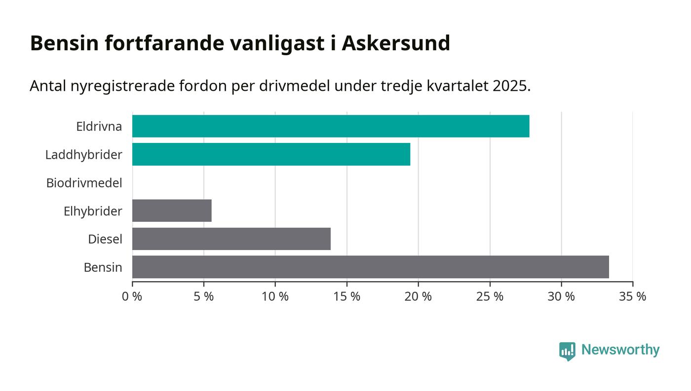 Under tredje kvartalet 2025 var 47 procent av alla nyregistrerade personbilar i Askersund laddbara (sammanlagt registrerades 36 nya bilar). Merparten av de laddbara bilarna var rena elbilar (28 procent av alla).