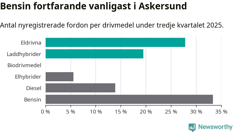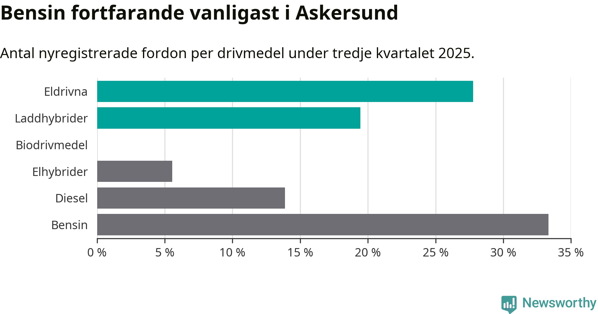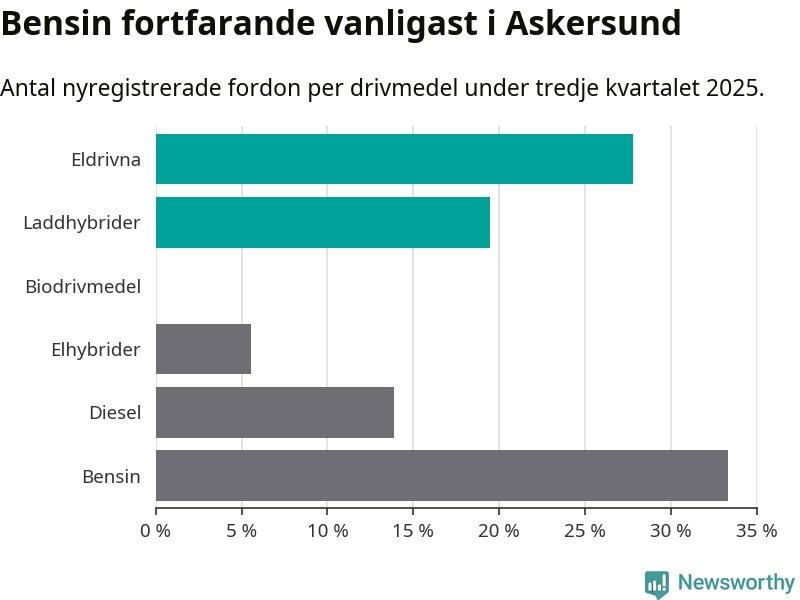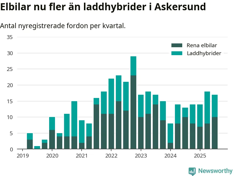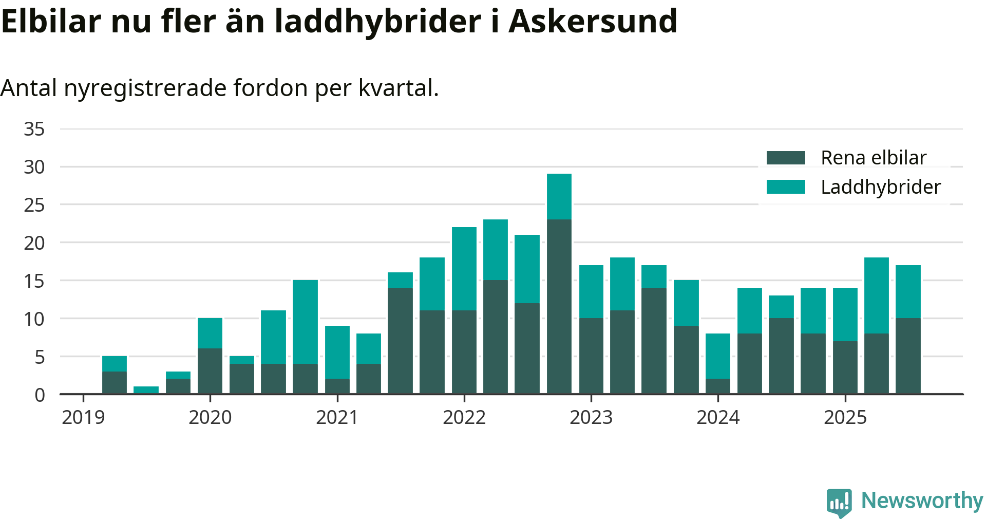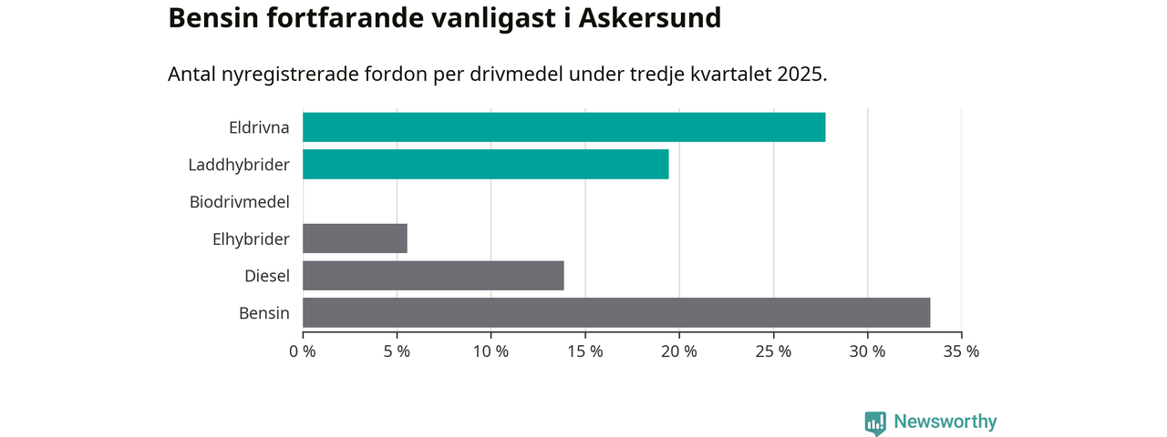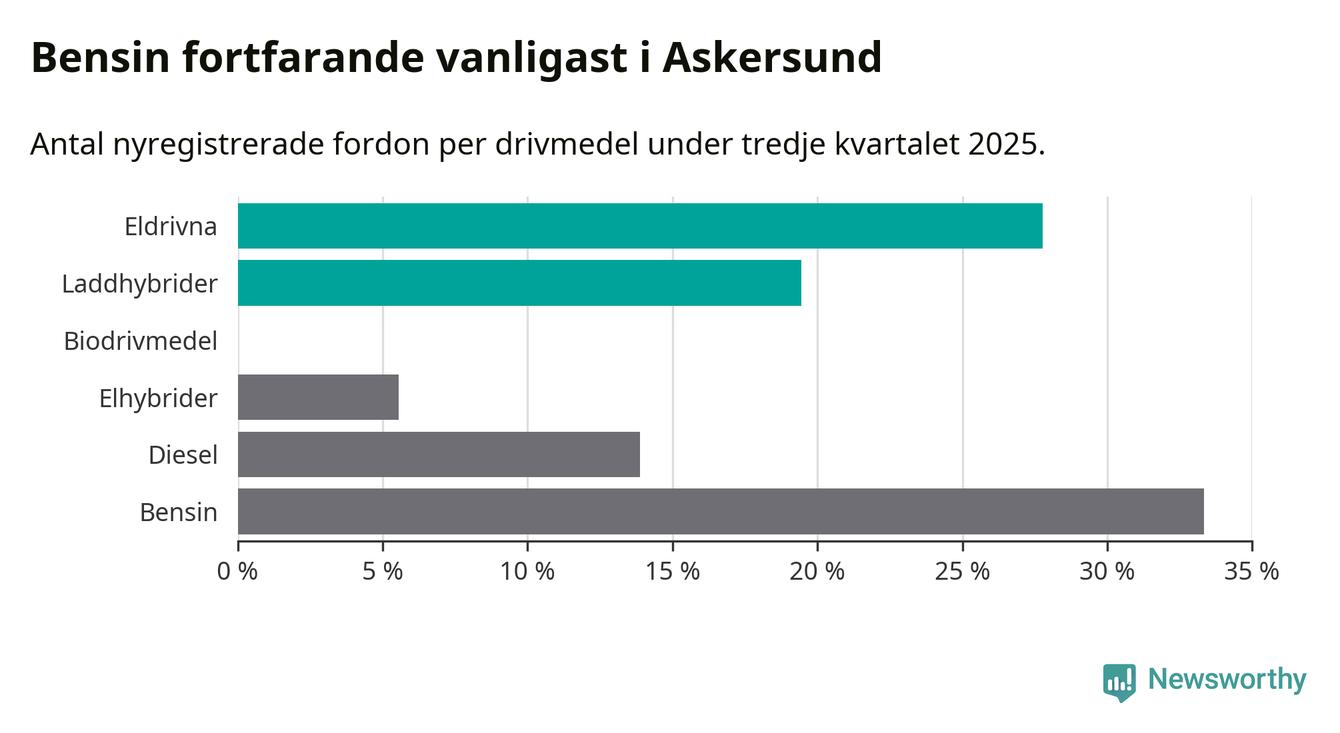 Under tredje kvartalet 2025 var 47 procent av alla nyregistrerade personbilar i Askersund laddbara (sammanlagt registrerades 36 nya bilar). Merparten av de laddbara bilarna var rena elbilar (28 procent av alla).