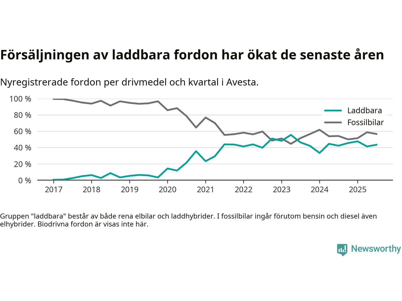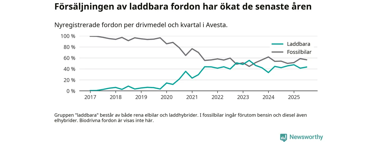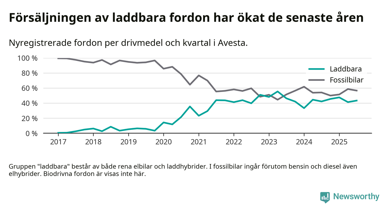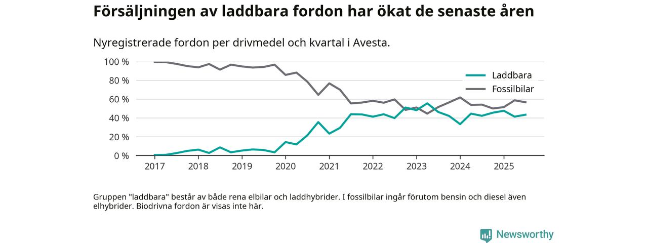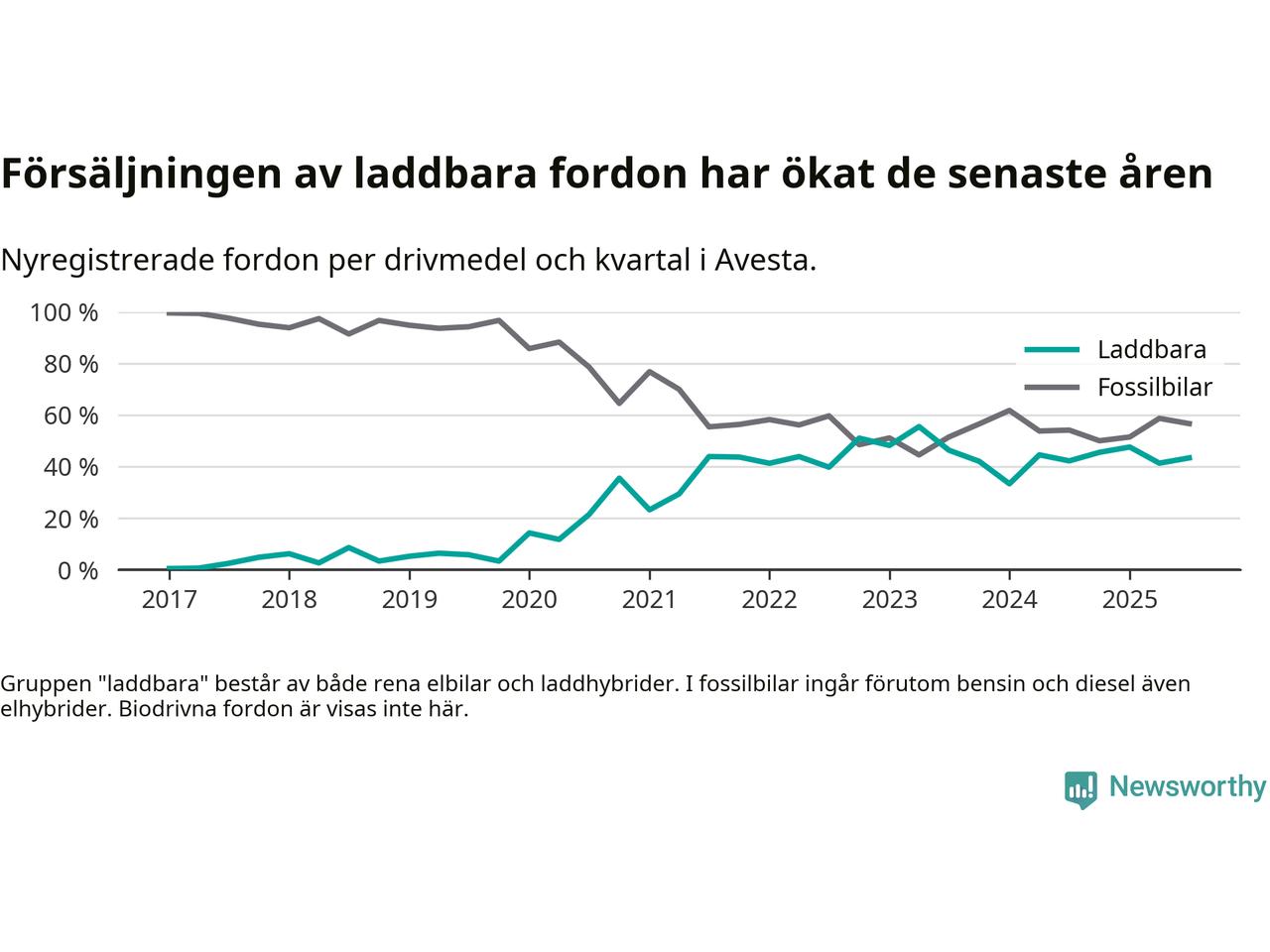 Under tredje kvartalet var fyra av tio nyregistrerade bilar i Avesta kommun rena elbilar eller laddhybrider, en ökning jämfört med kvartalet innan. I riket däremot minskade andelen laddbara bilar något. Framför allt elbilsförsäljningen har tappat fart.