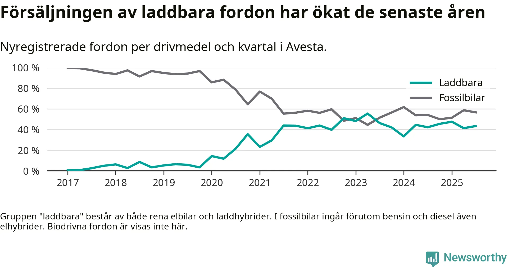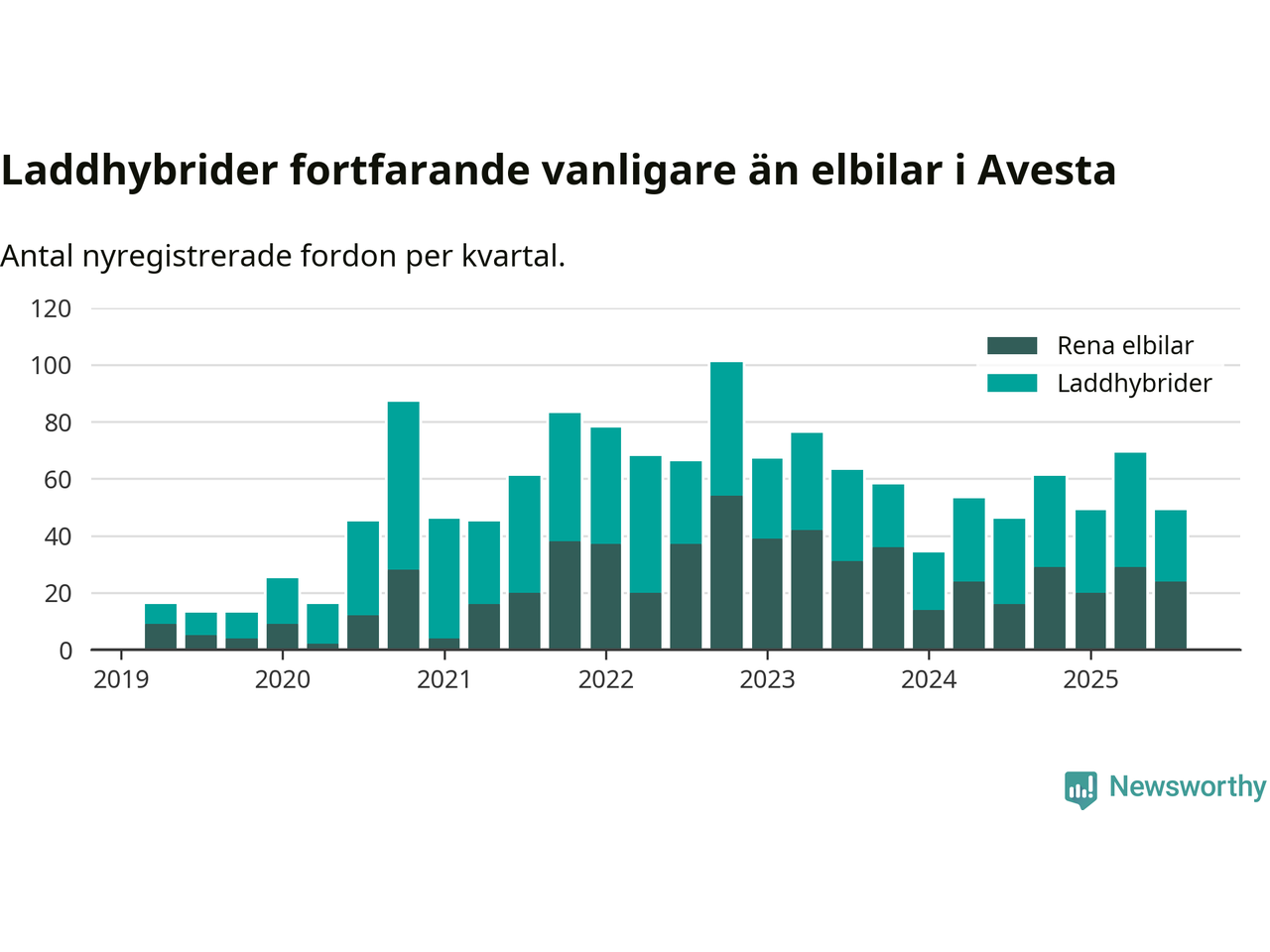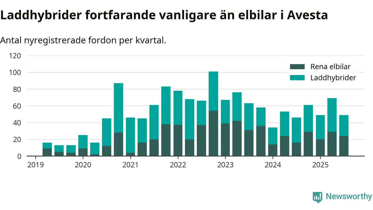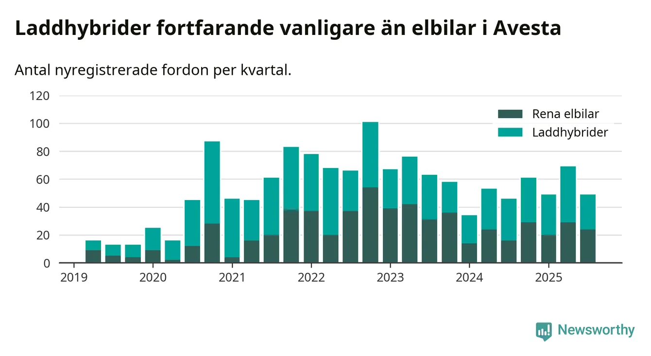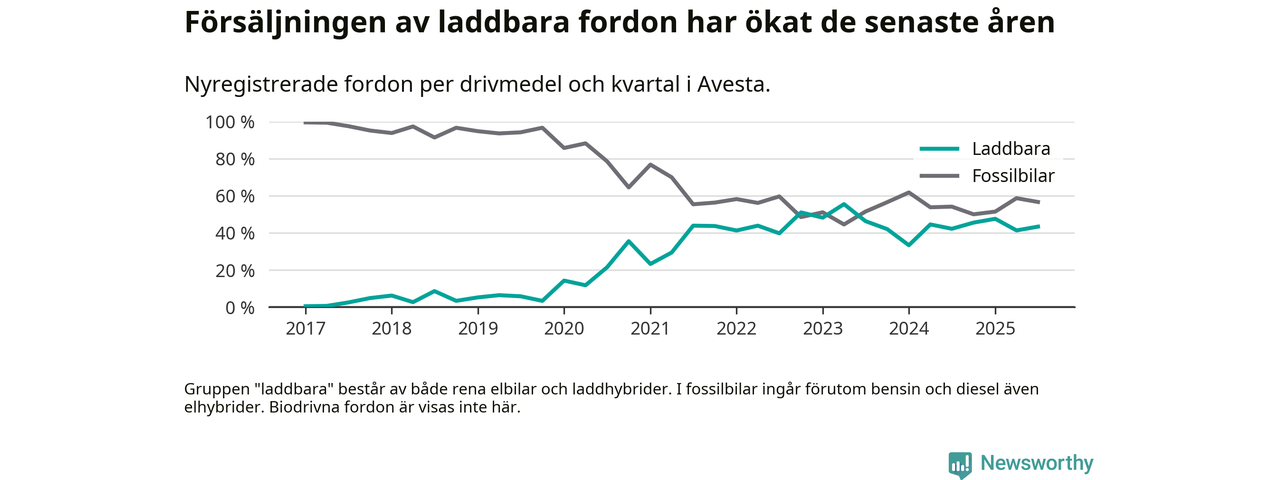 Under tredje kvartalet var fyra av tio nyregistrerade bilar i Avesta kommun rena elbilar eller laddhybrider, en ökning jämfört med kvartalet innan. I riket däremot minskade andelen laddbara bilar något. Framför allt elbilsförsäljningen har tappat fart.