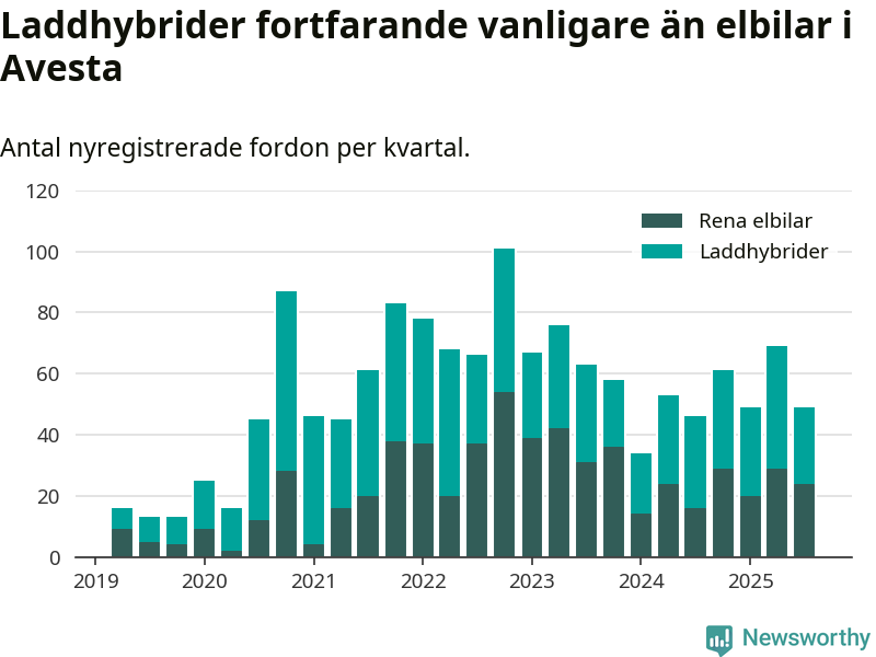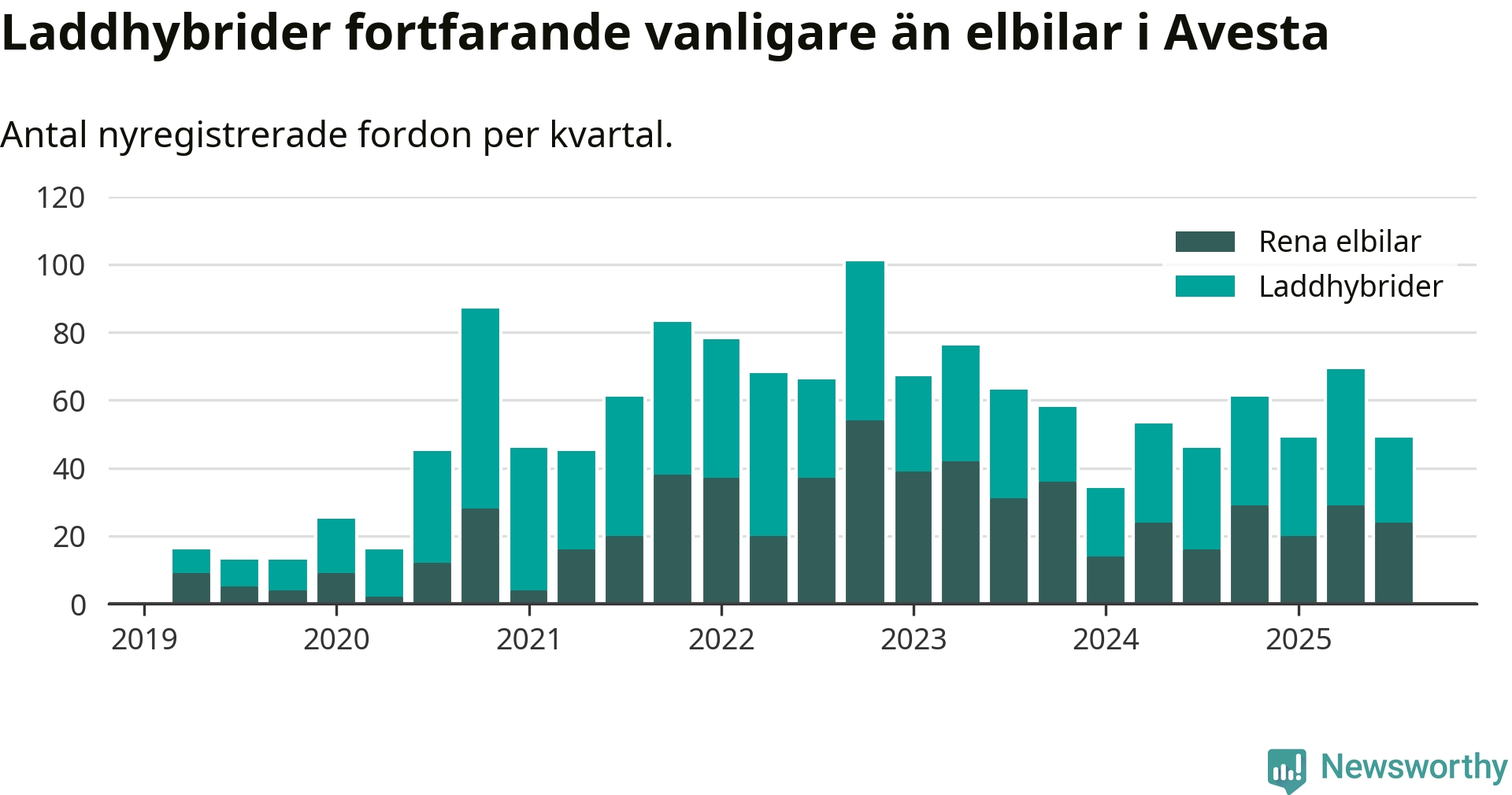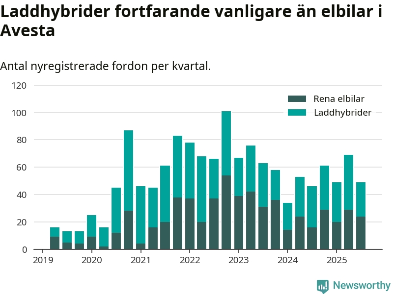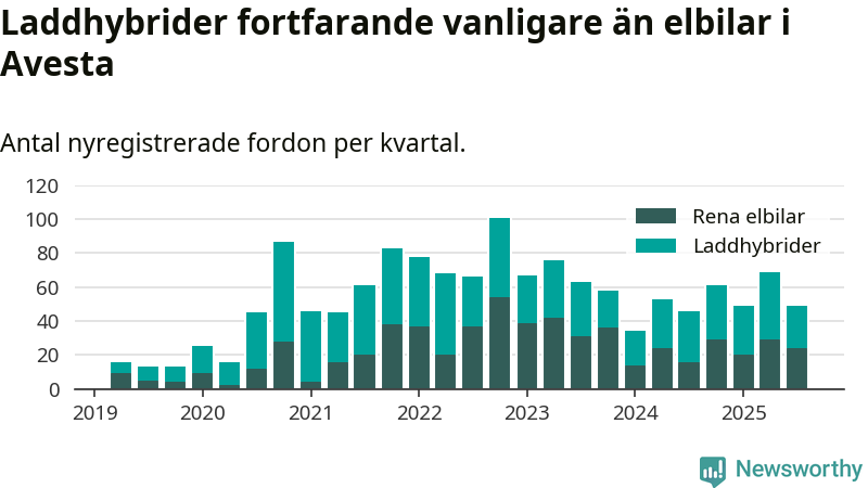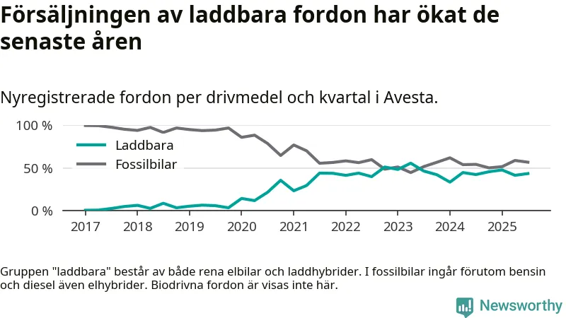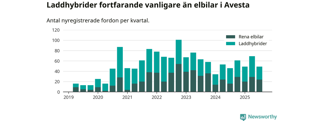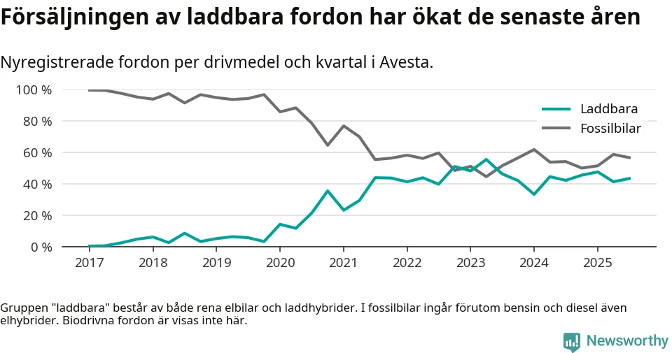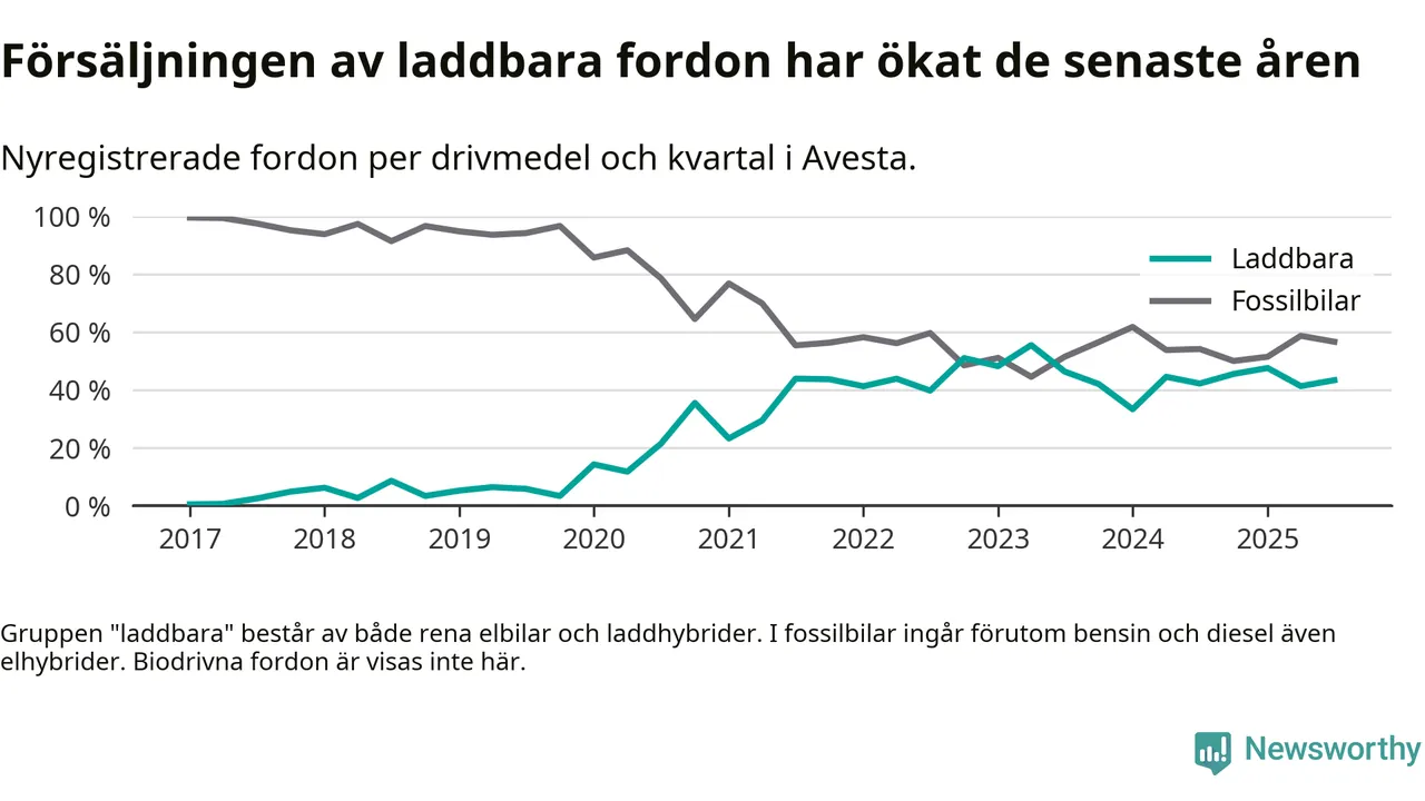 Under tredje kvartalet var fyra av tio nyregistrerade bilar i Avesta kommun rena elbilar eller laddhybrider, en ökning jämfört med kvartalet innan. I riket däremot minskade andelen laddbara bilar något. Framför allt elbilsförsäljningen har tappat fart.