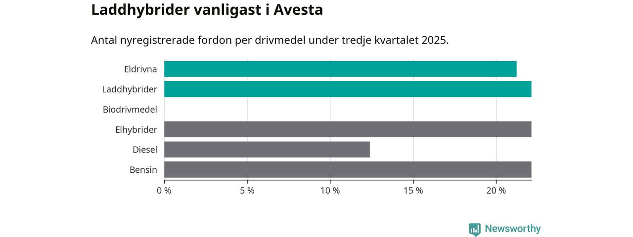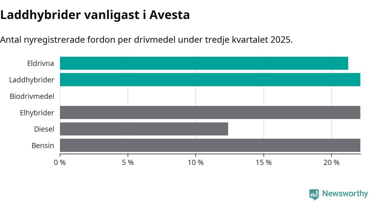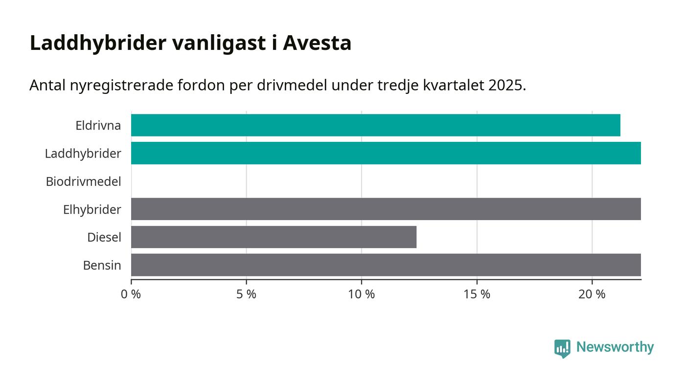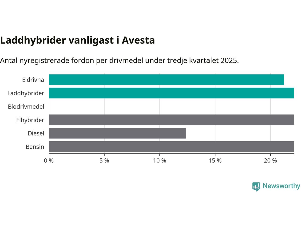 Under tredje kvartalet 2025 var 43 procent av alla nyregistrerade personbilar i Avesta laddbara (sammanlagt registrerades 113 nya bilar). Merparten av de laddbara bilarna var så kallade laddhybrider, det vill säga fordon som går att ladda och köra på el, men som även har en förbränningsmotor. 21 procent av alla nya bilar var rena elbilar.