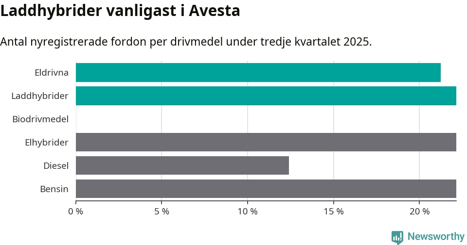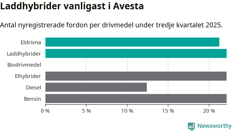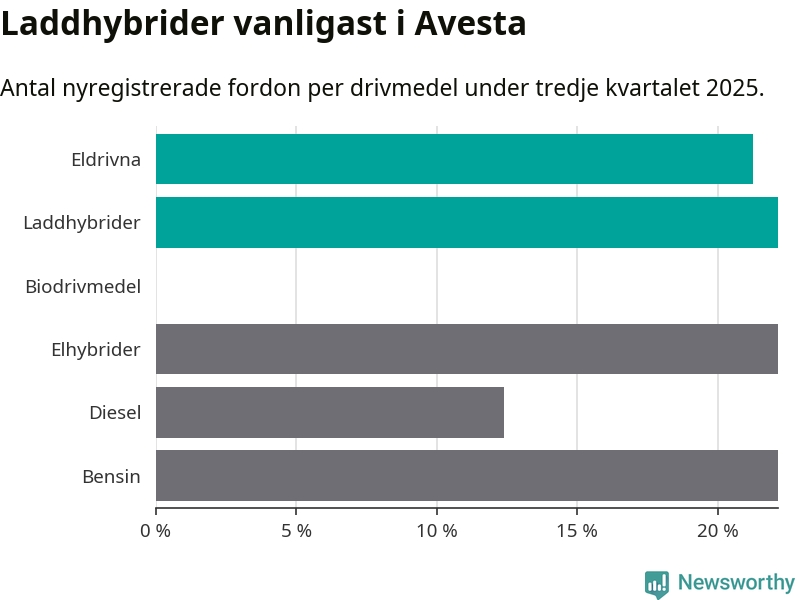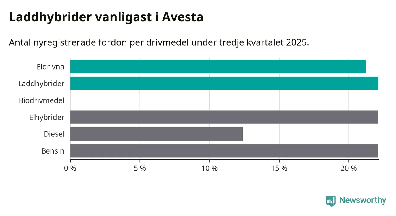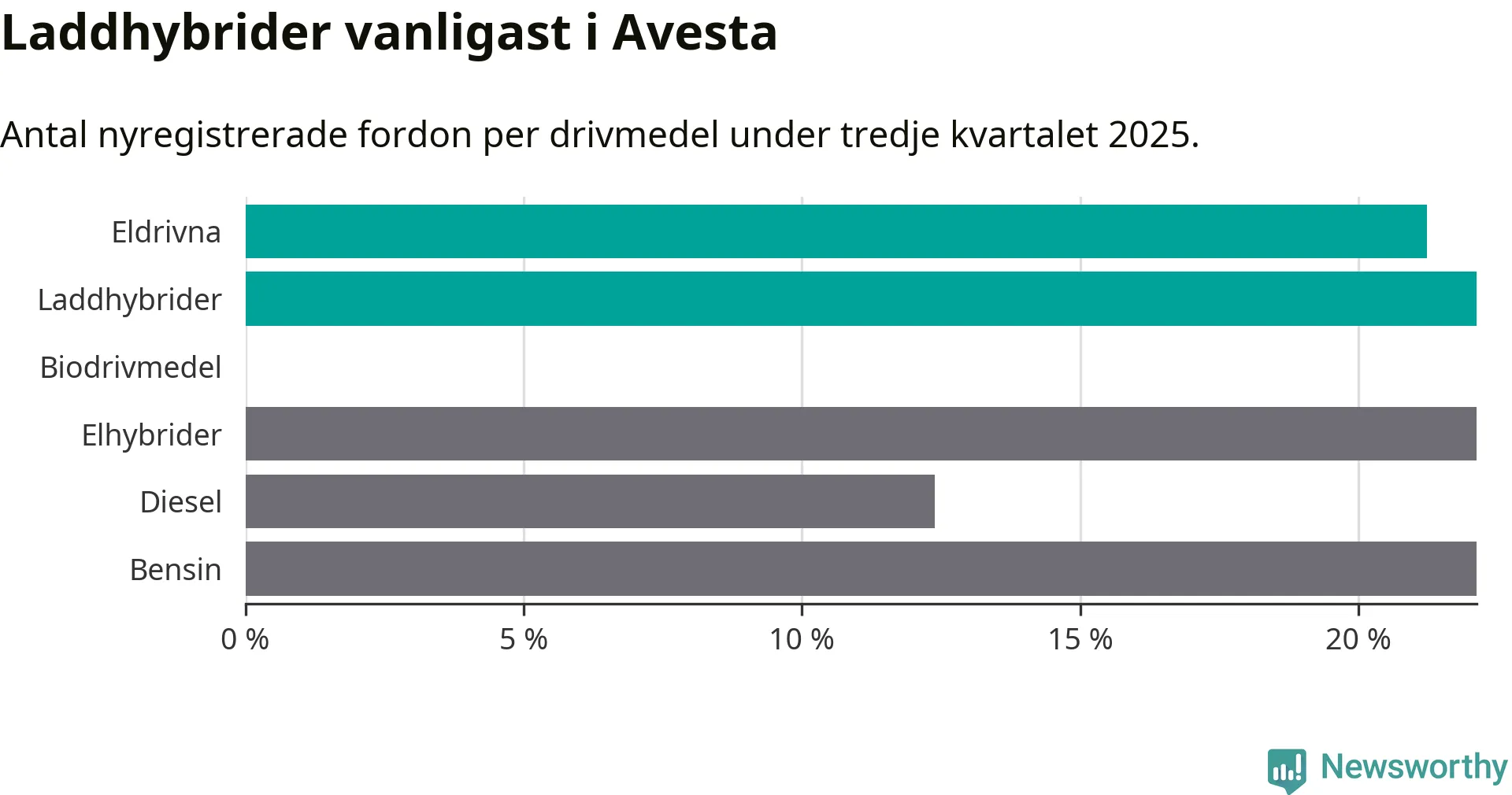 Under tredje kvartalet 2025 var 43 procent av alla nyregistrerade personbilar i Avesta laddbara (sammanlagt registrerades 113 nya bilar). Merparten av de laddbara bilarna var så kallade laddhybrider, det vill säga fordon som går att ladda och köra på el, men som även har en förbränningsmotor. 21 procent av alla nya bilar var rena elbilar.