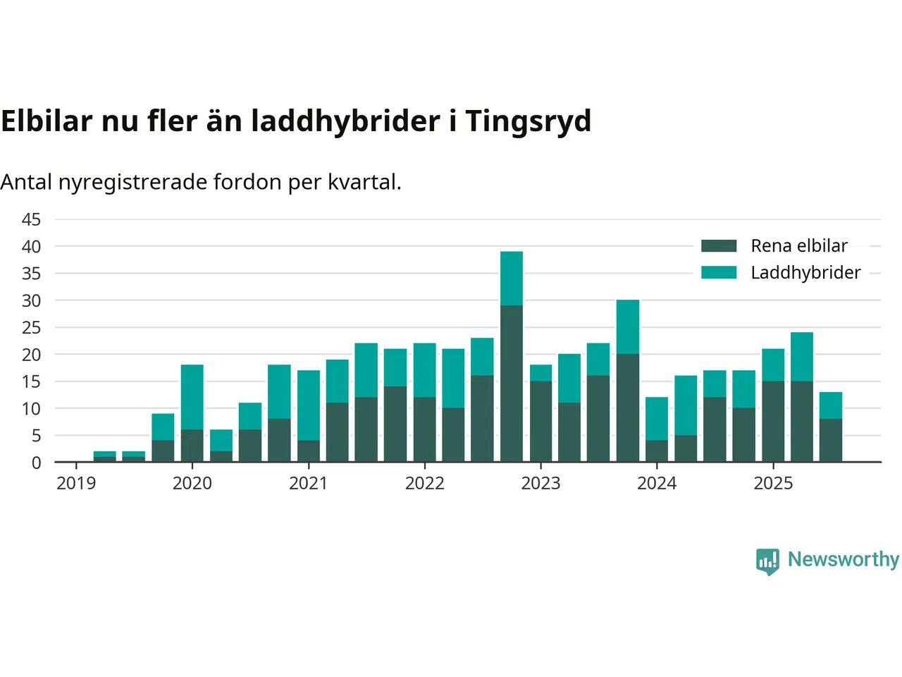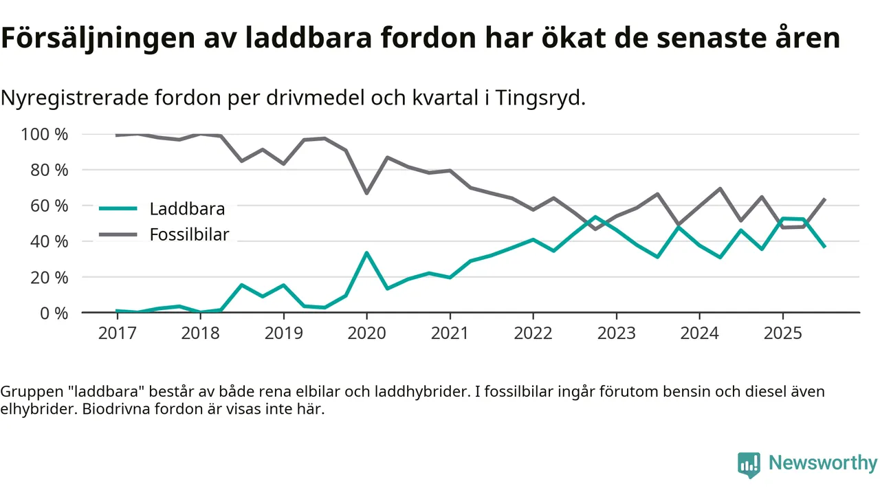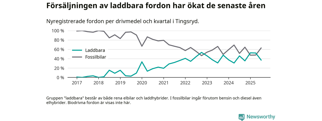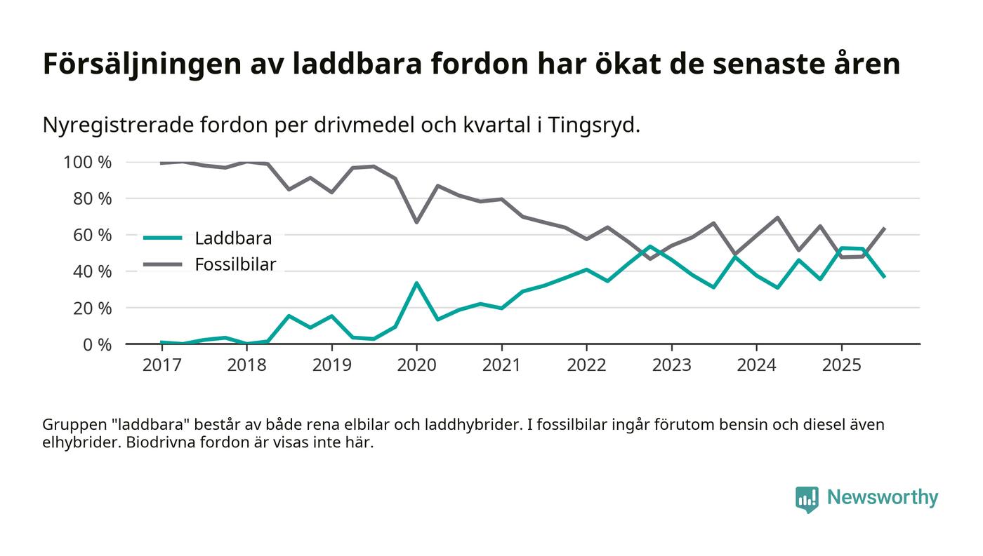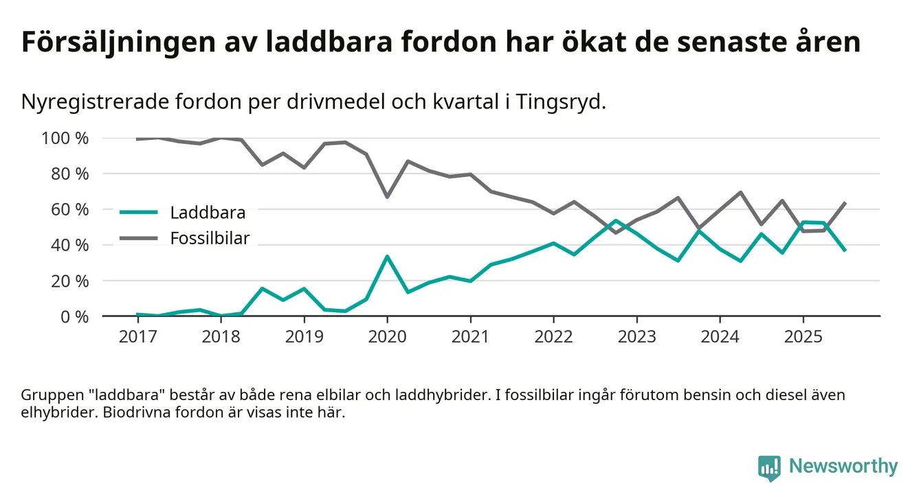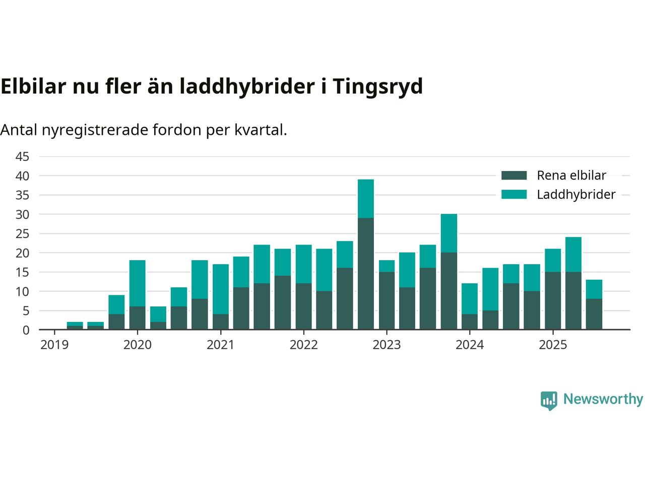 Under tredje kvartalet 2025 var 37 procent av alla nyregistrerade personbilar i Tingsryd laddbara (sammanlagt registrerades 35 nya bilar). Merparten av de laddbara bilarna var rena elbilar (23 procent av alla).