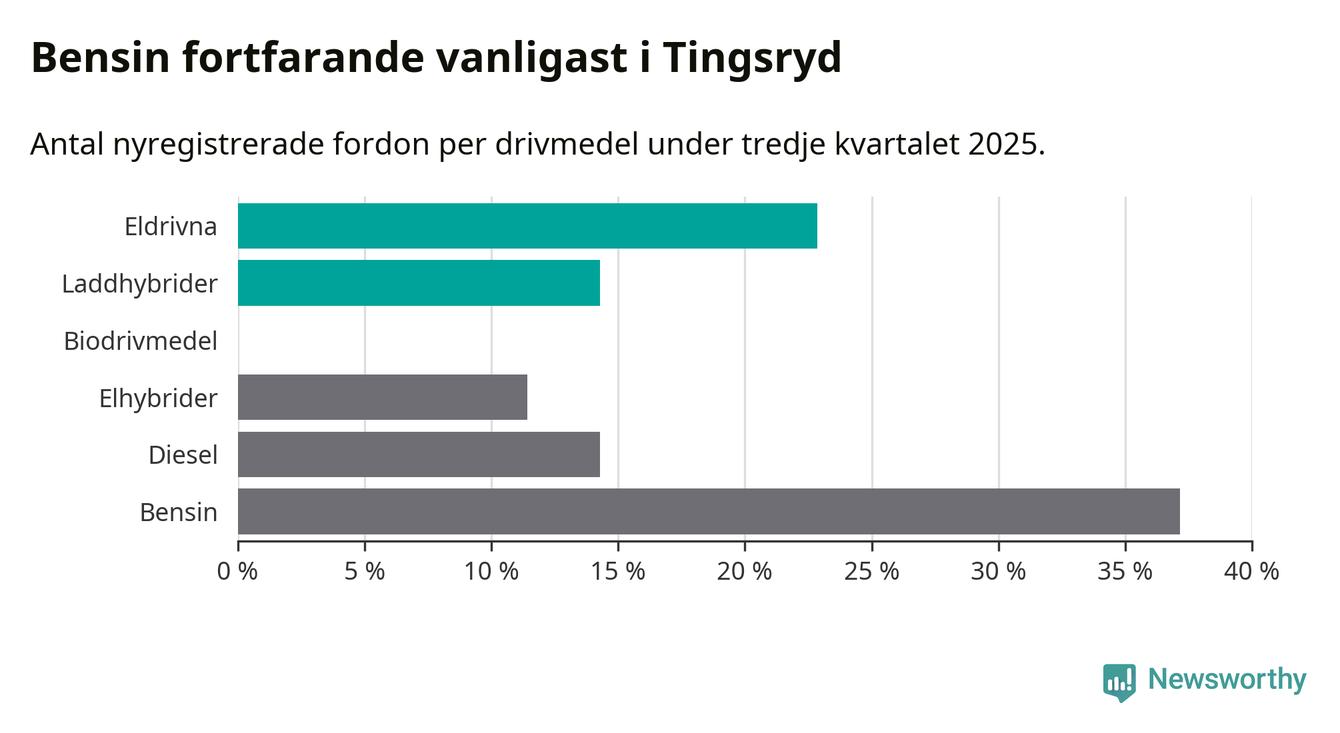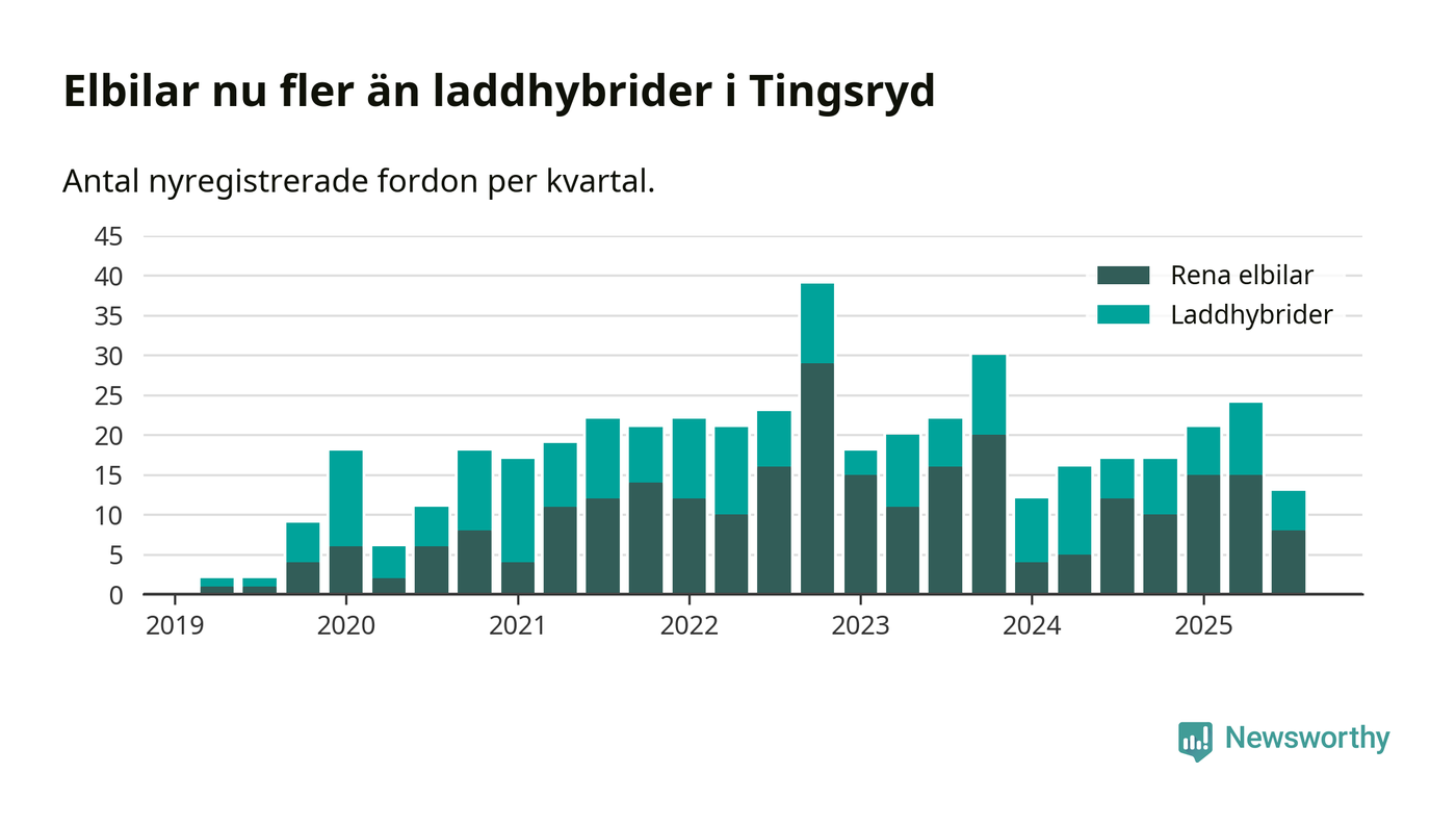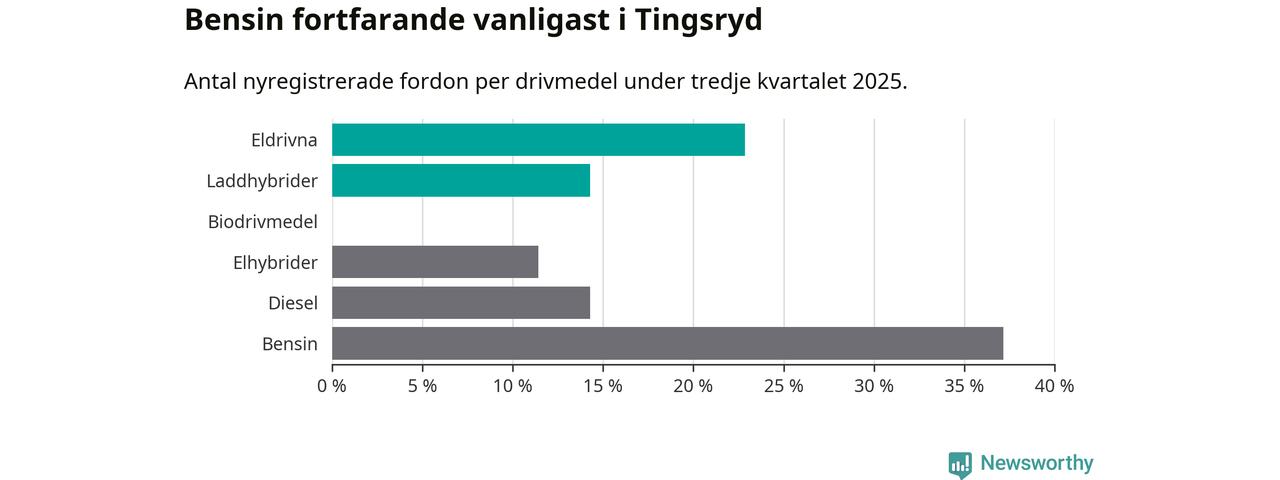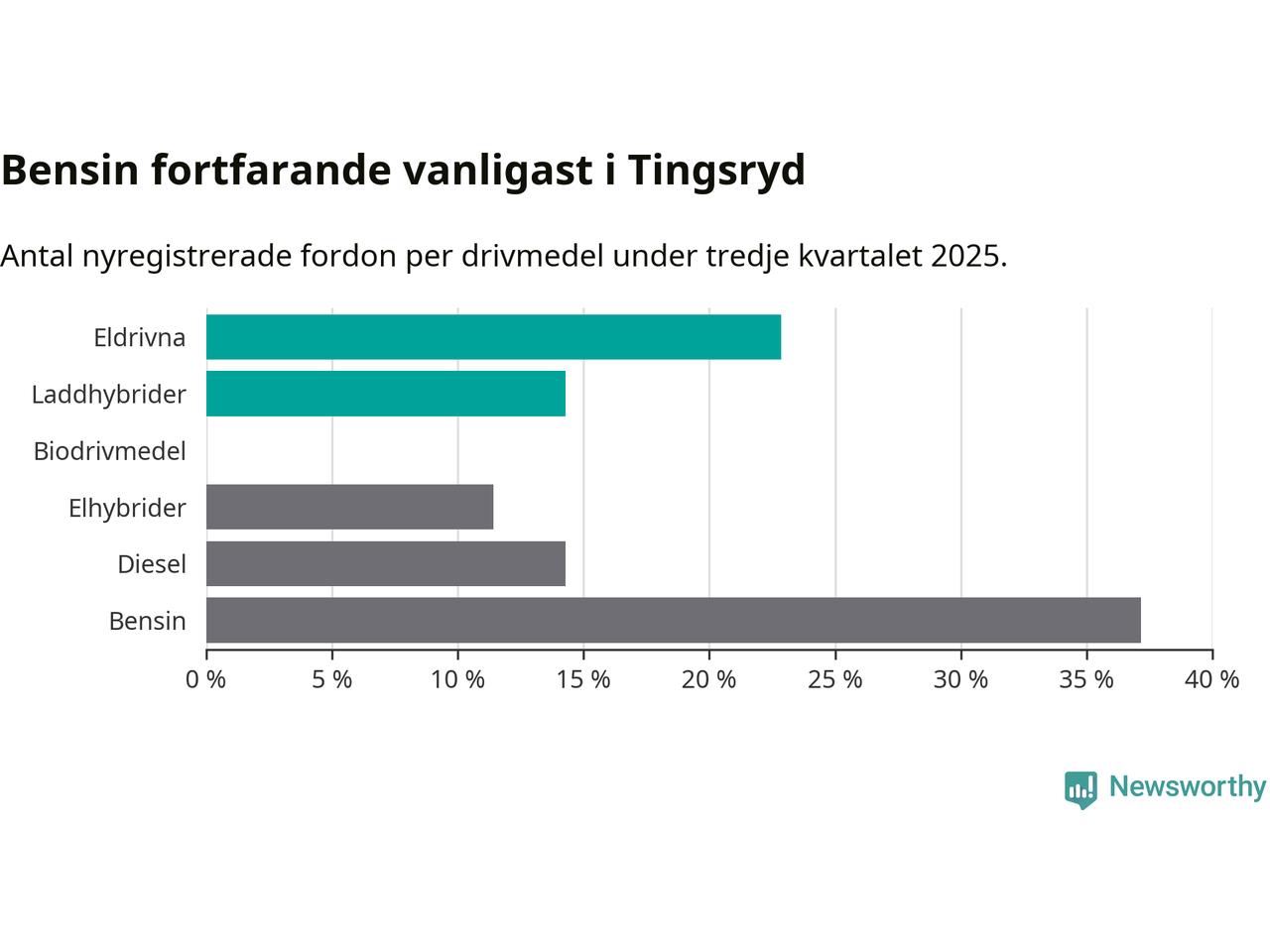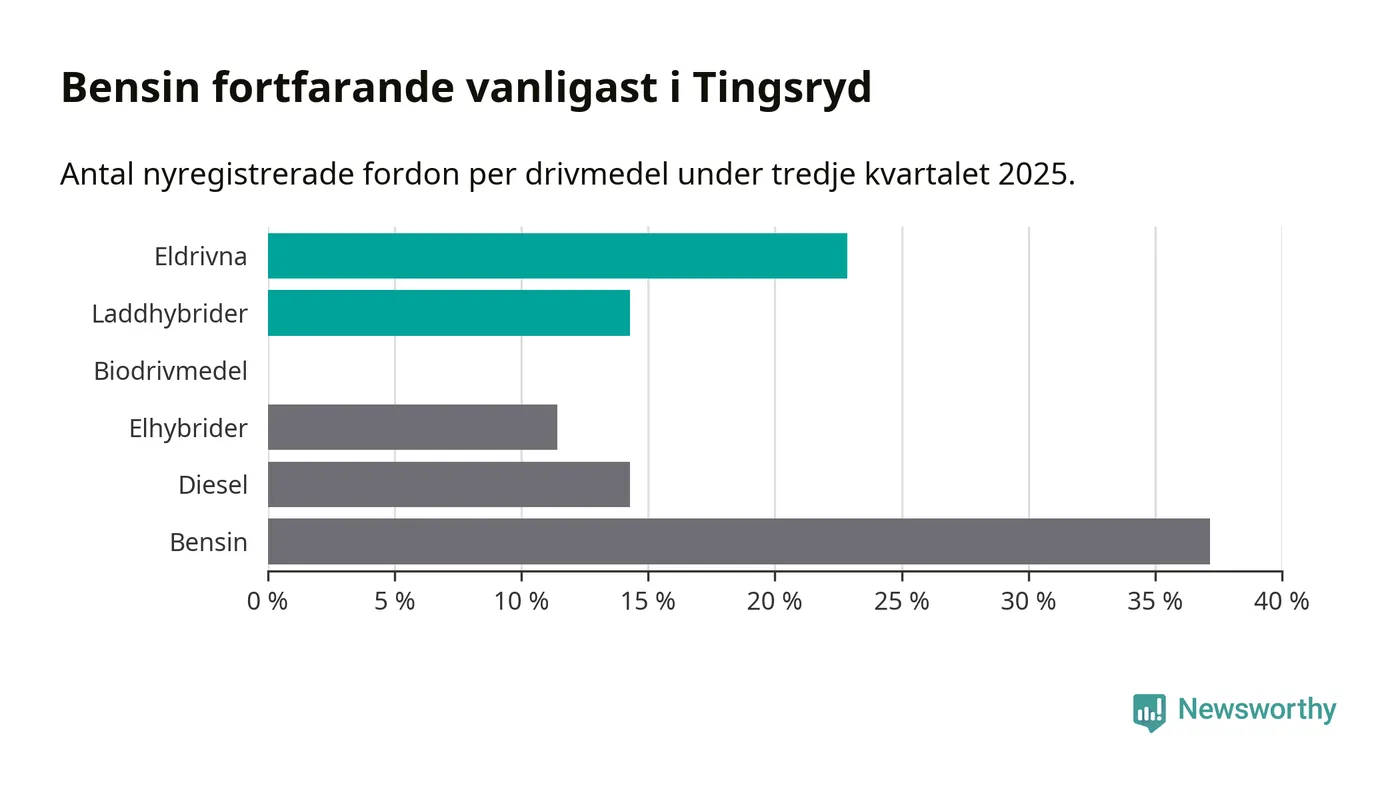 Under tredje kvartalet 2025 var 37 procent av alla nyregistrerade personbilar i Tingsryd laddbara (sammanlagt registrerades 35 nya bilar). Merparten av de laddbara bilarna var rena elbilar (23 procent av alla).