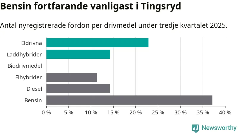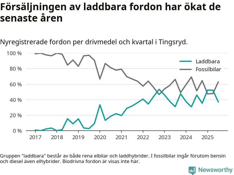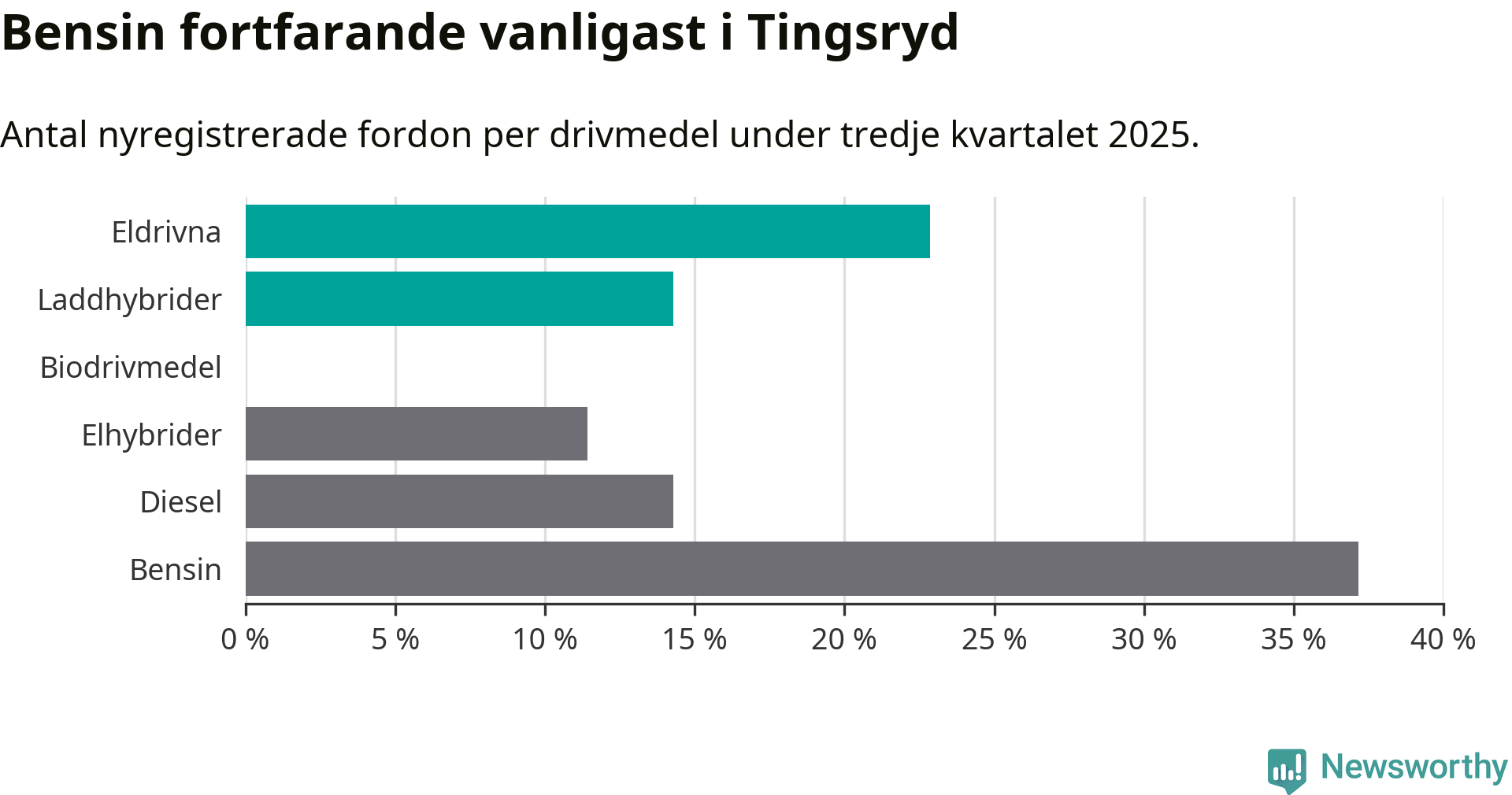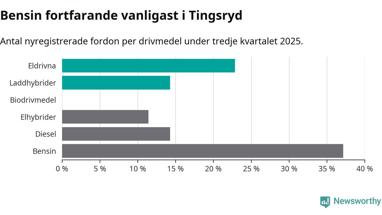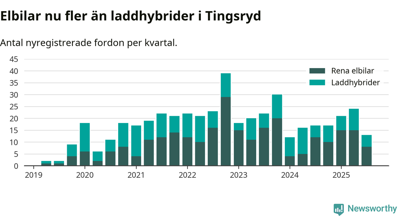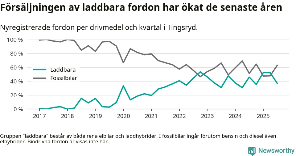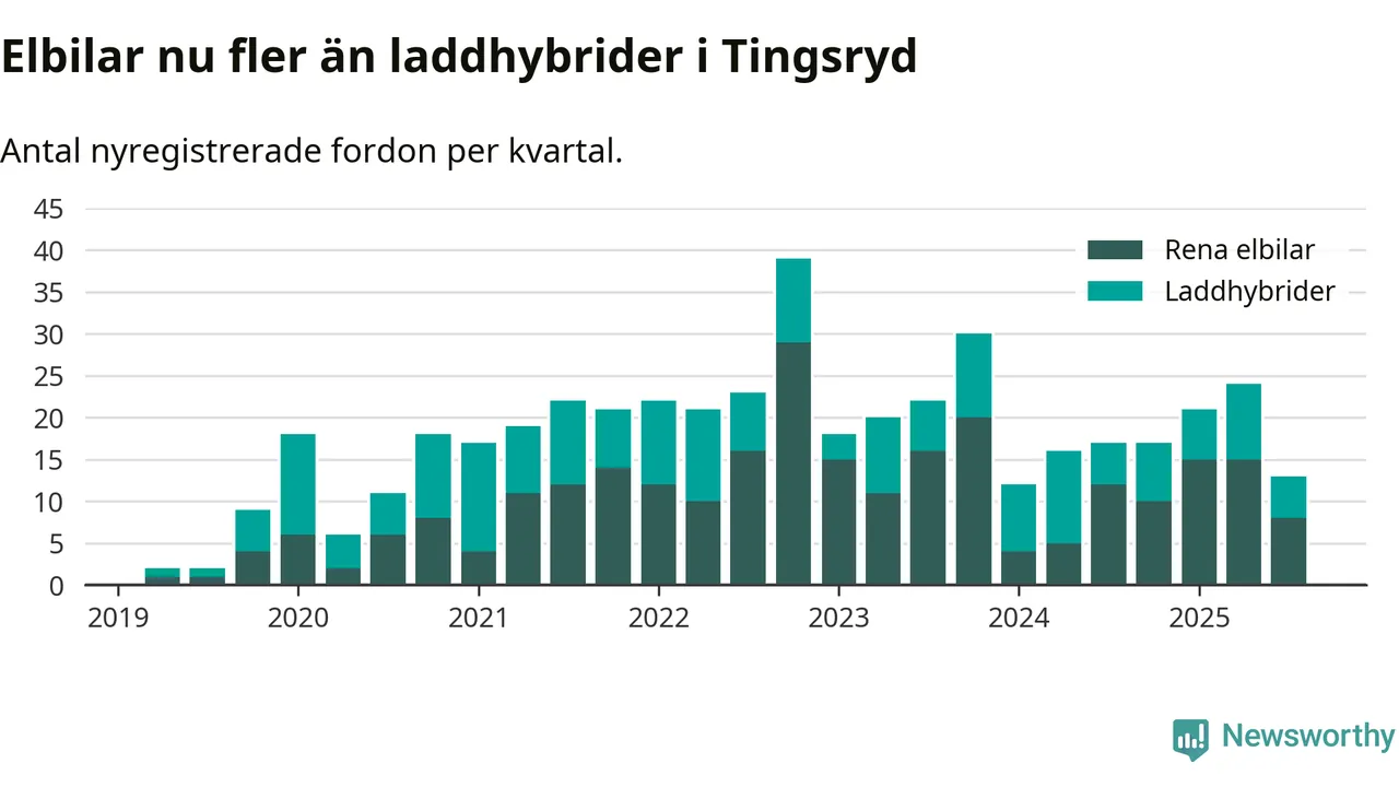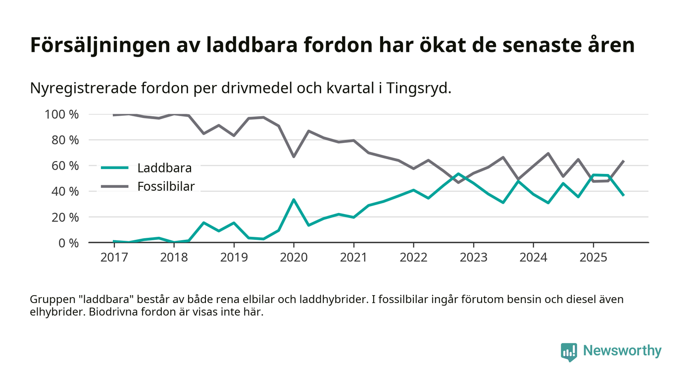 Under tredje kvartalet 2025 var 37 procent av alla nyregistrerade personbilar i Tingsryd laddbara (sammanlagt registrerades 35 nya bilar). Merparten av de laddbara bilarna var rena elbilar (23 procent av alla).
