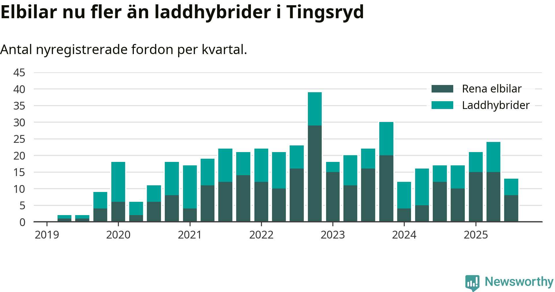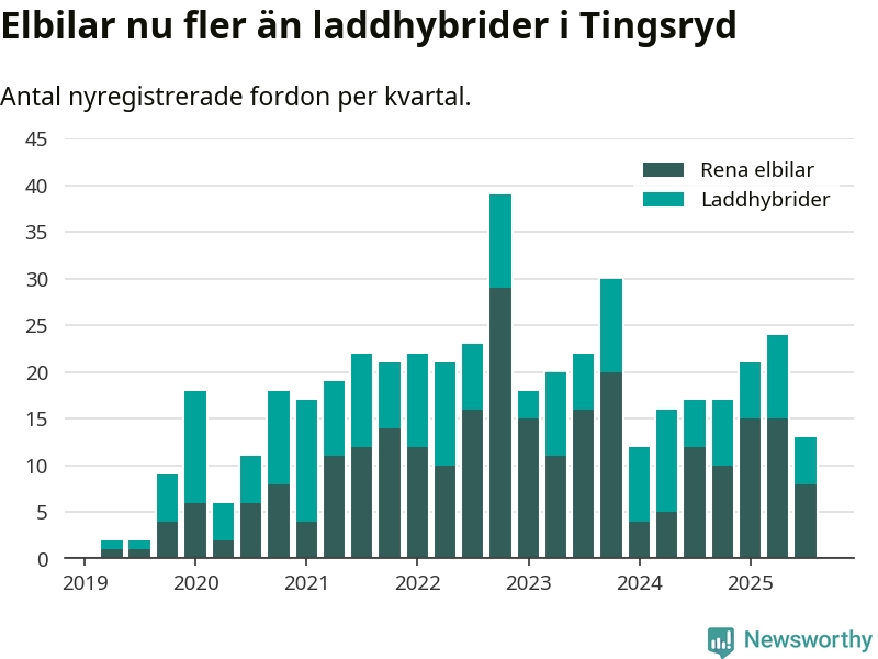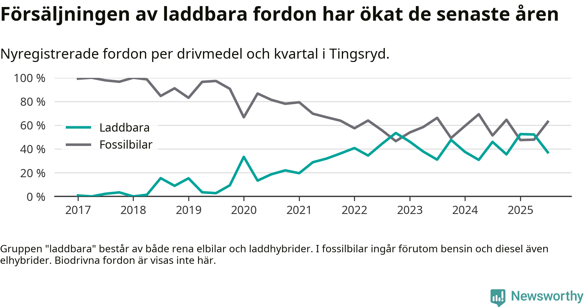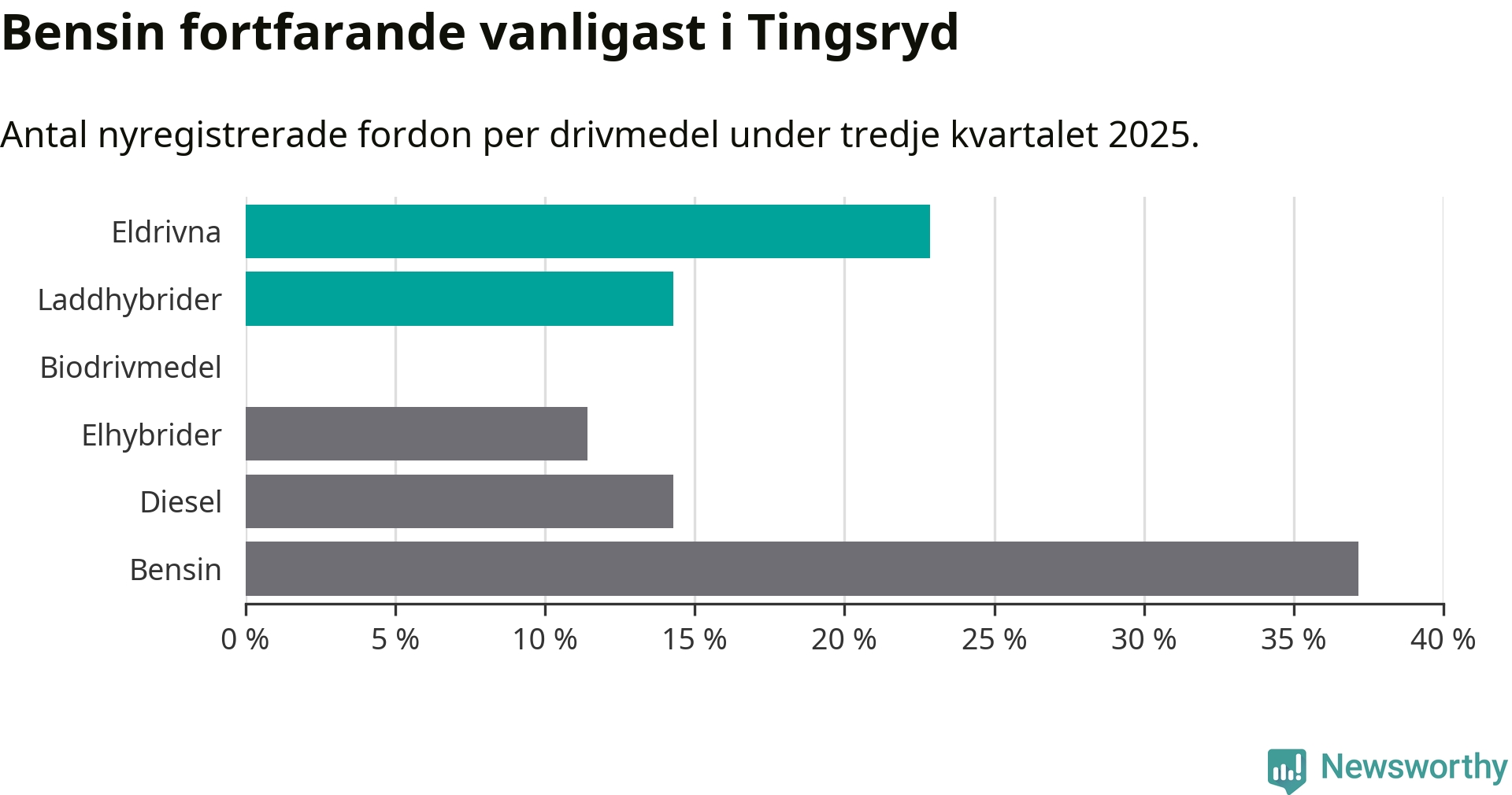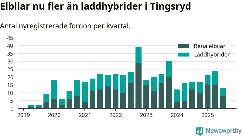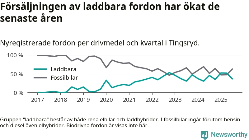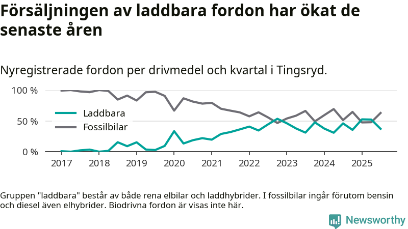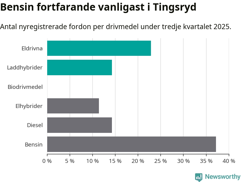 Under tredje kvartalet 2025 var 37 procent av alla nyregistrerade personbilar i Tingsryd laddbara (sammanlagt registrerades 35 nya bilar). Merparten av de laddbara bilarna var rena elbilar (23 procent av alla).
