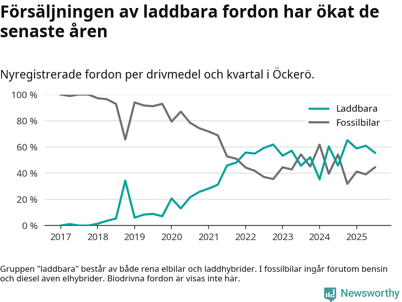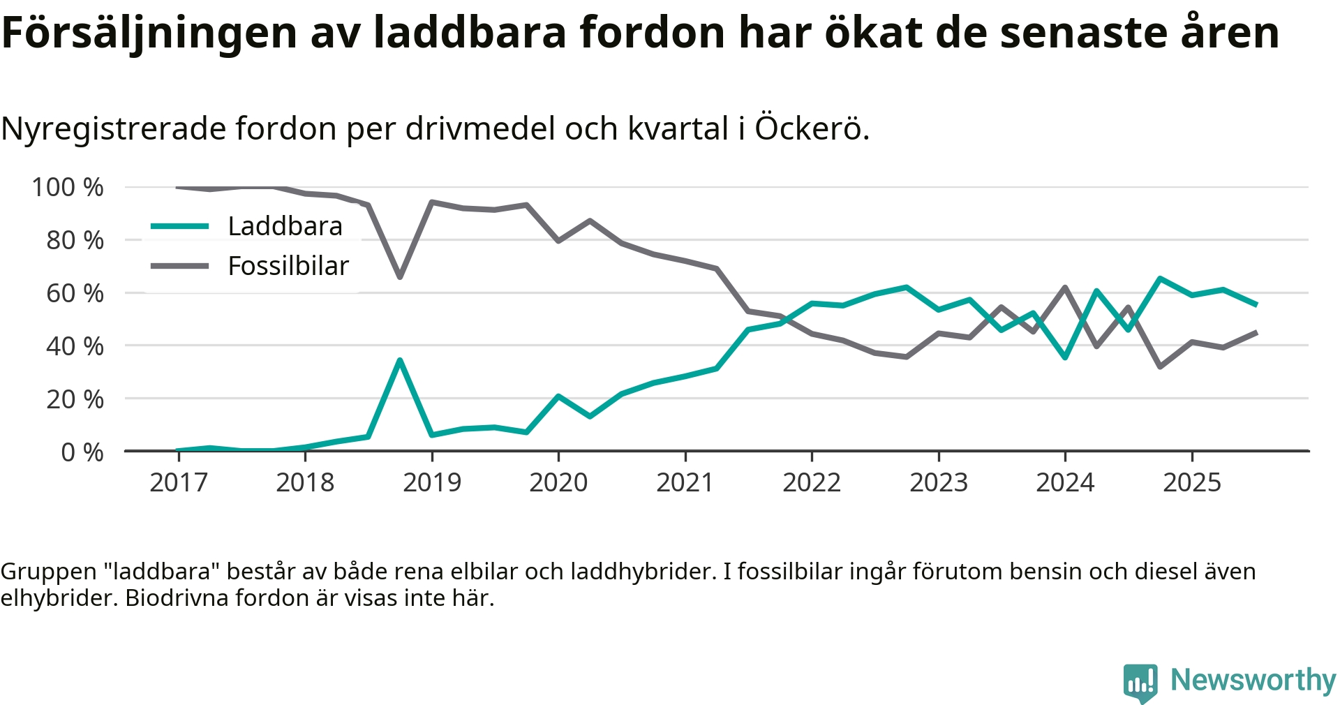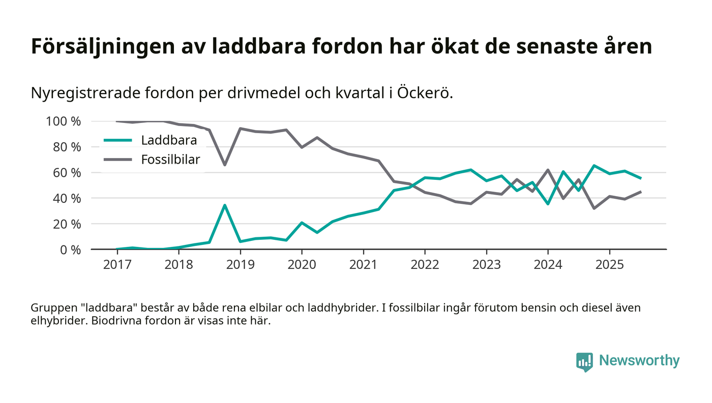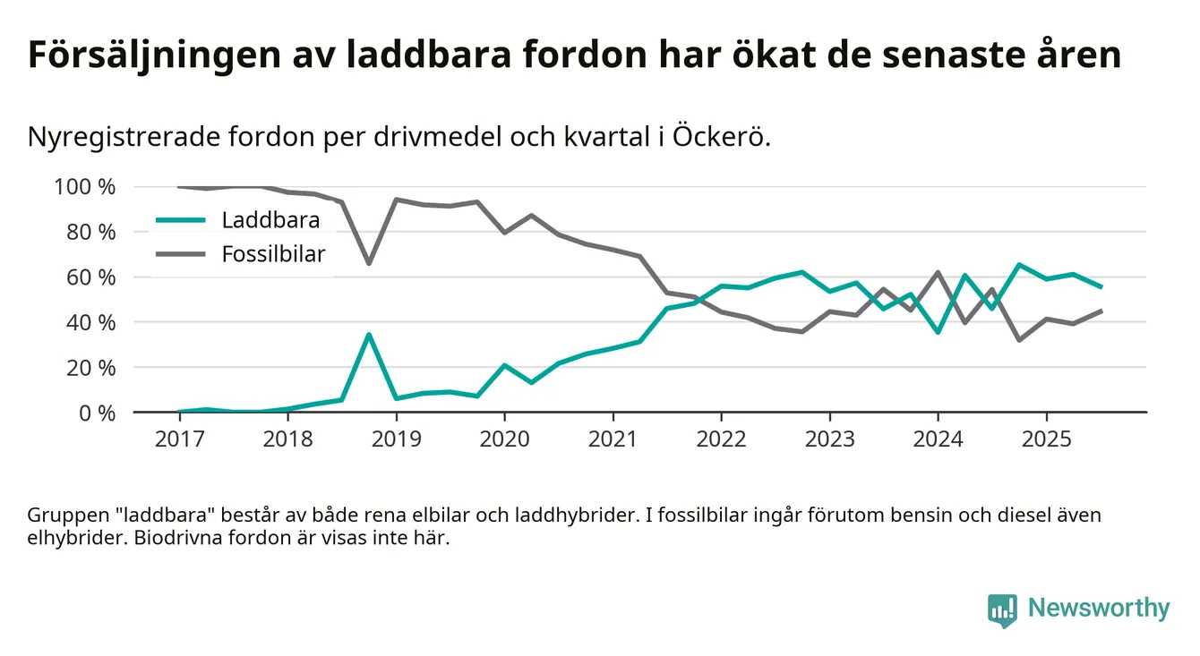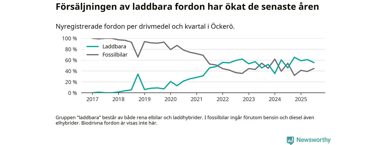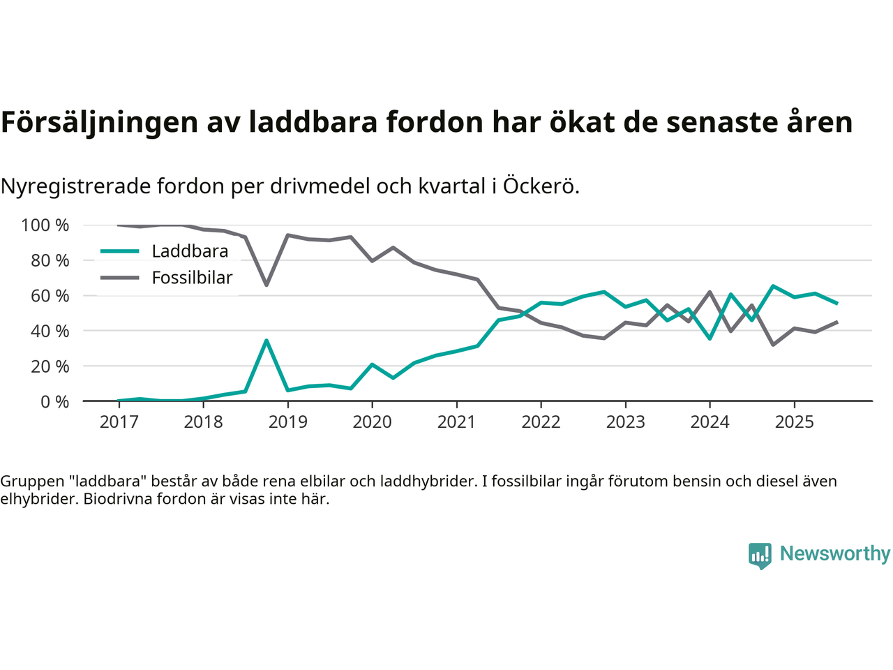Under tredje kvartalet 2025 var 56 procent av alla nyregistrerade personbilar på Öckerö laddbara (sammanlagt registrerades 45 nya bilar). Merparten av de laddbara bilarna var rena elbilar (38 procent av alla).