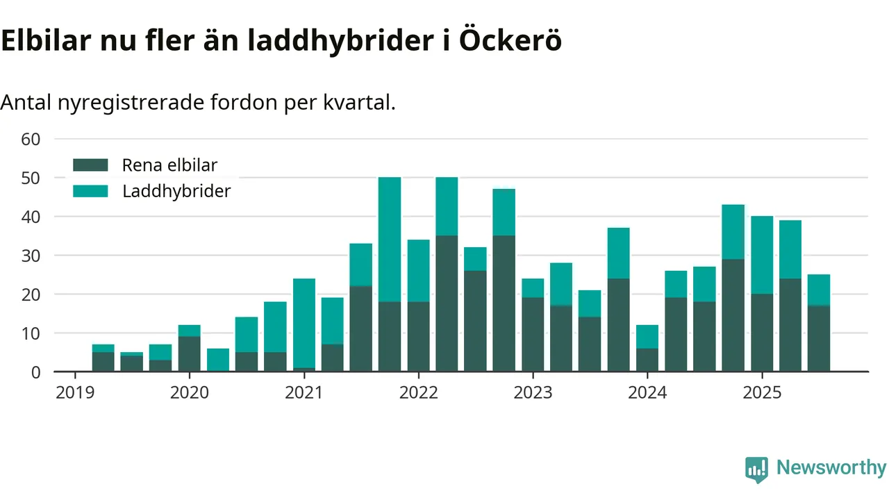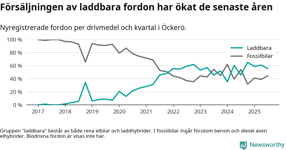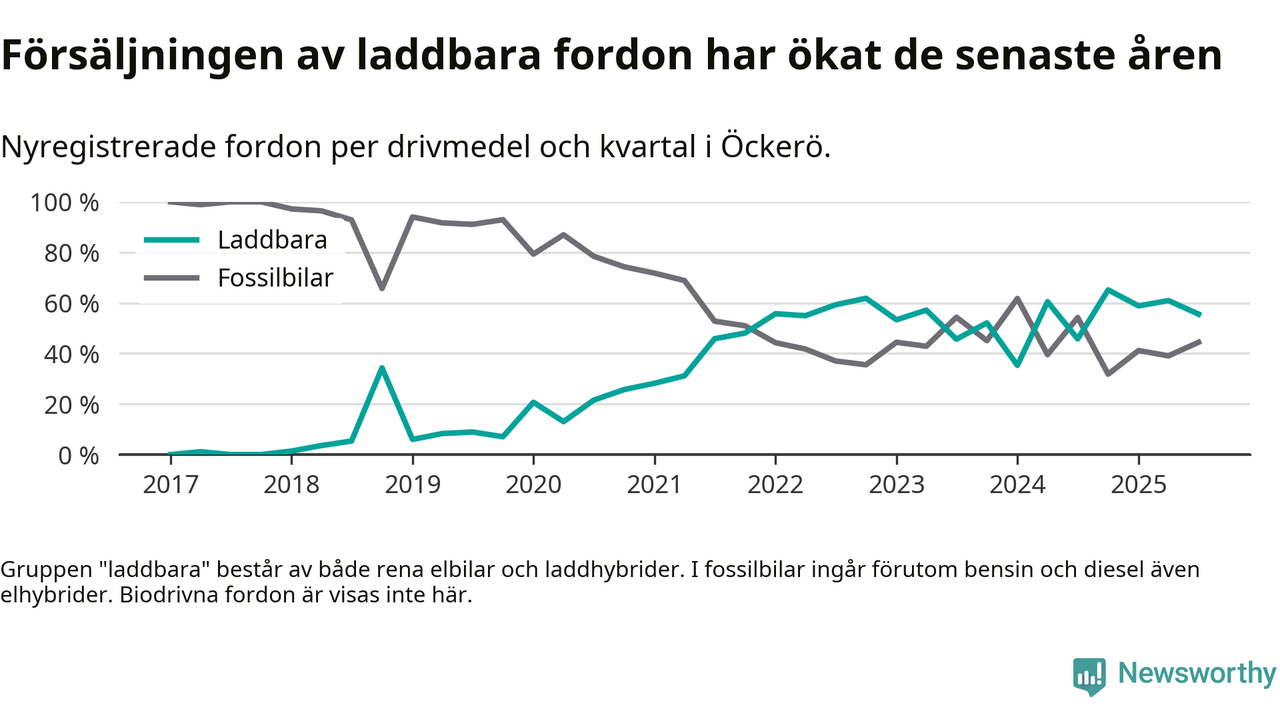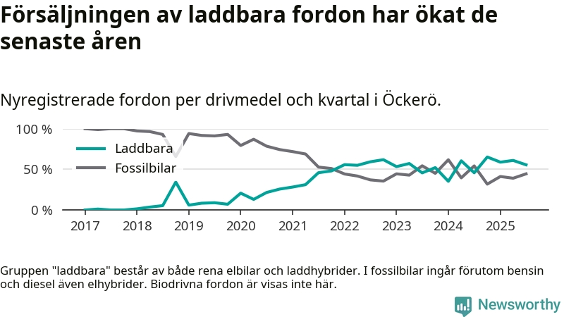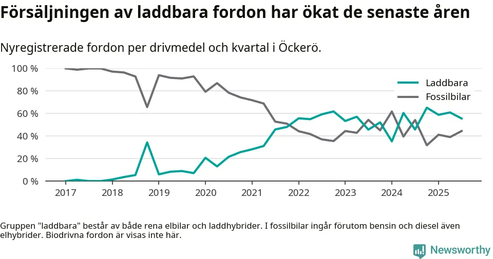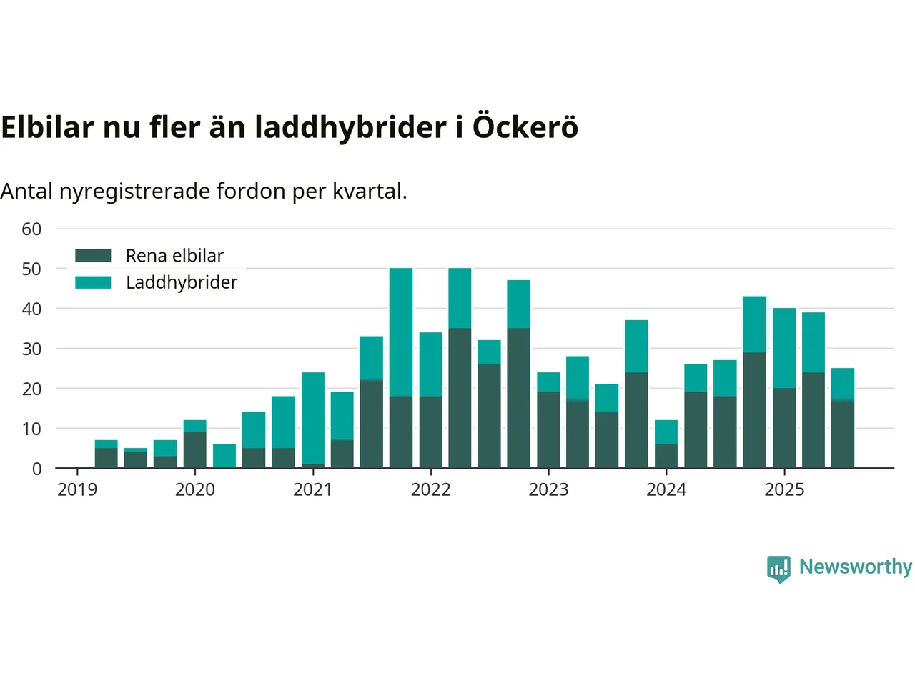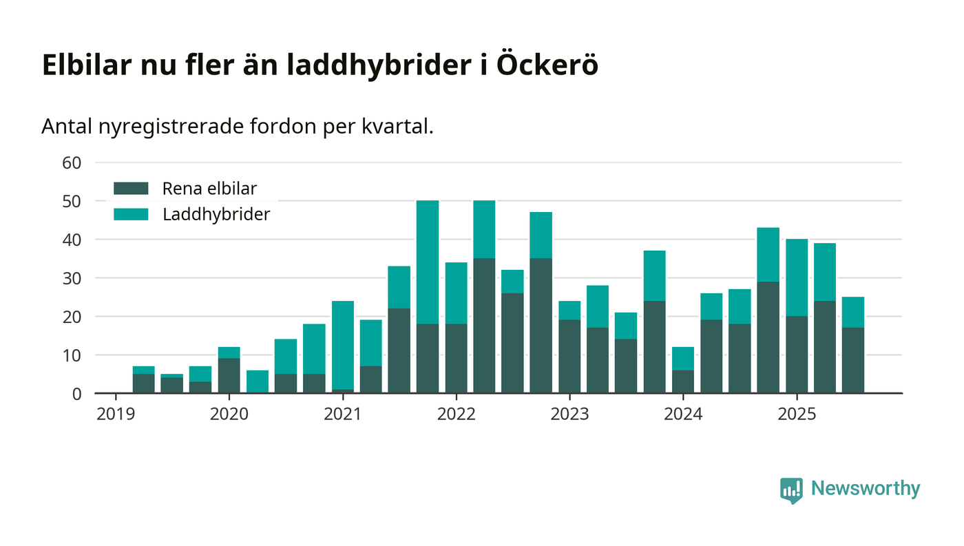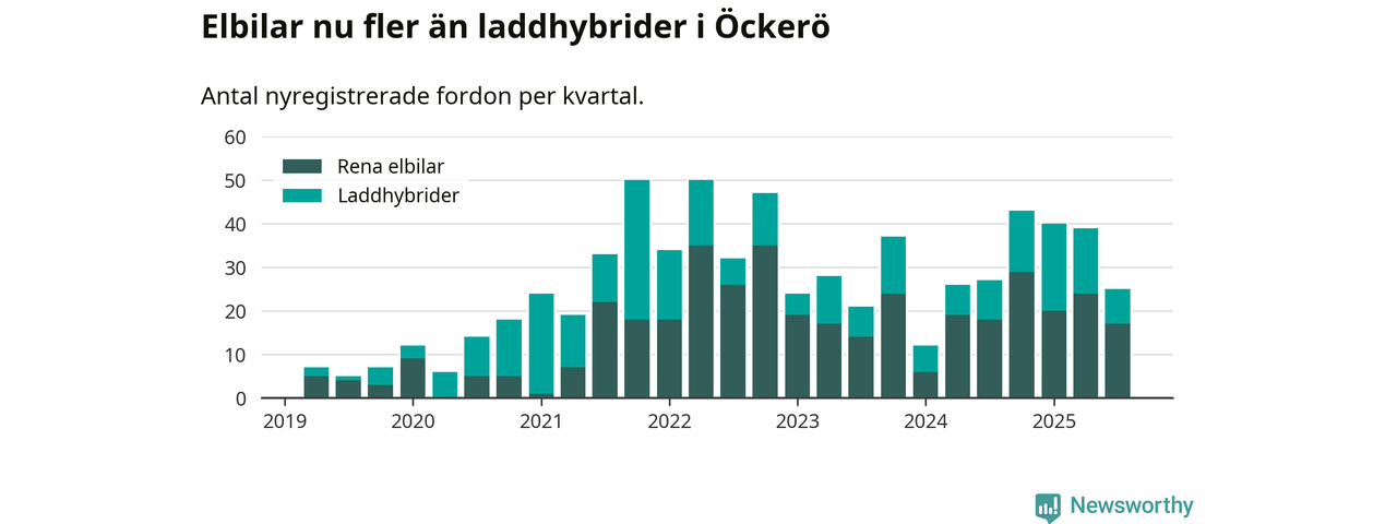 Under tredje kvartalet 2025 var 56 procent av alla nyregistrerade personbilar på Öckerö laddbara (sammanlagt registrerades 45 nya bilar). Merparten av de laddbara bilarna var rena elbilar (38 procent av alla).