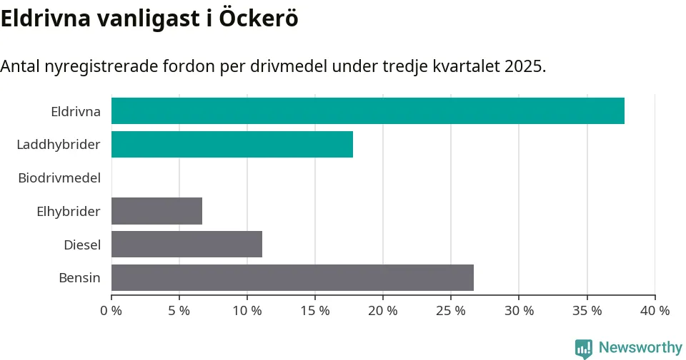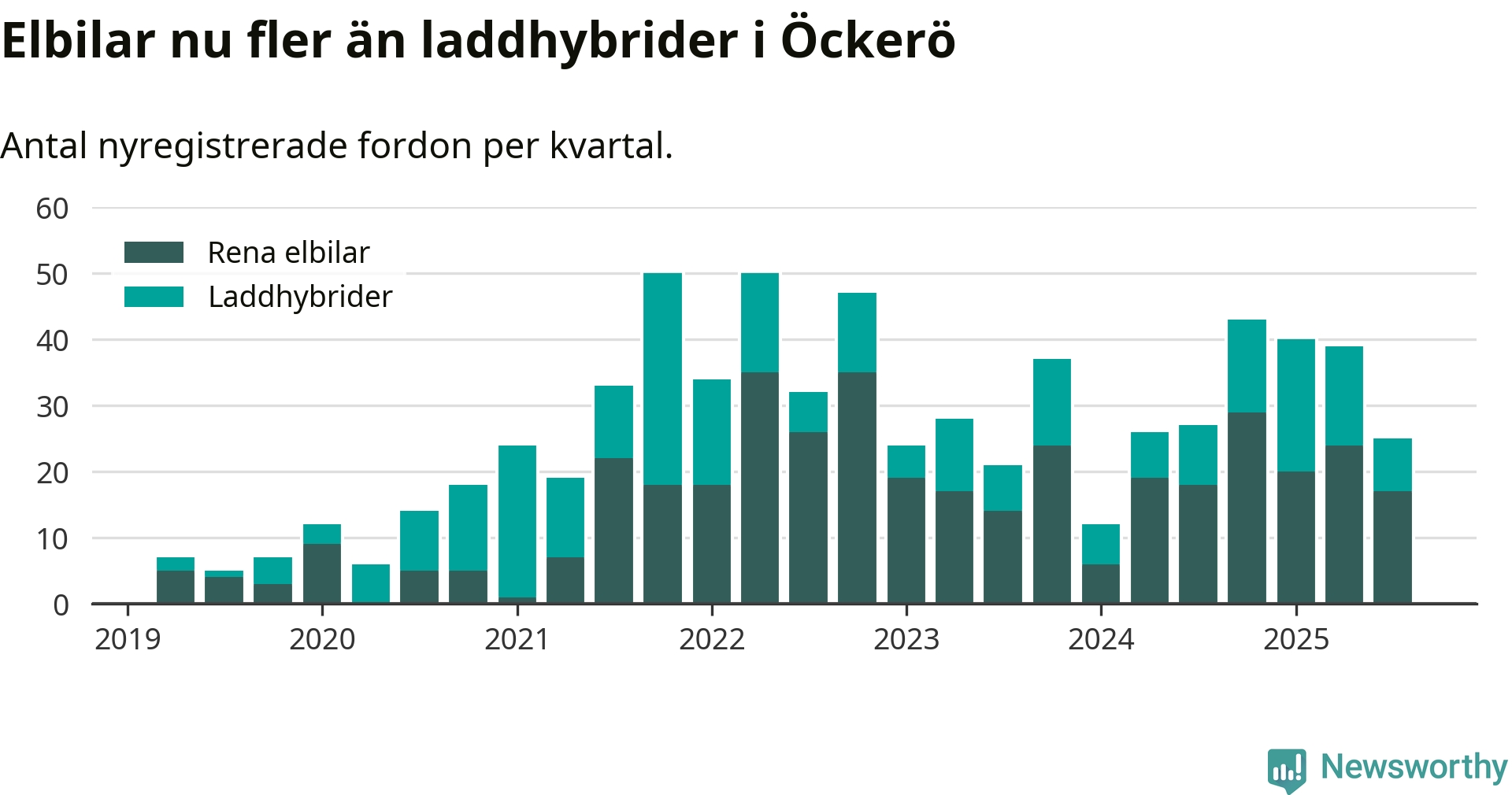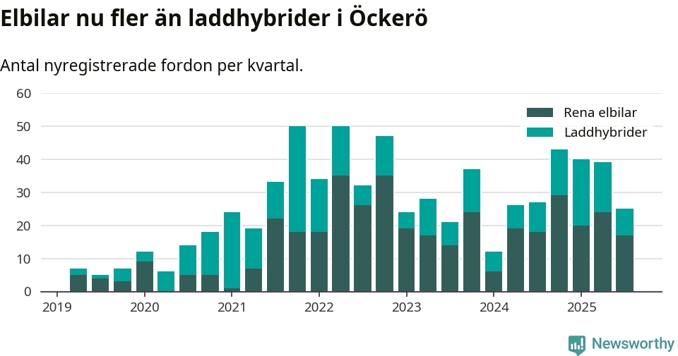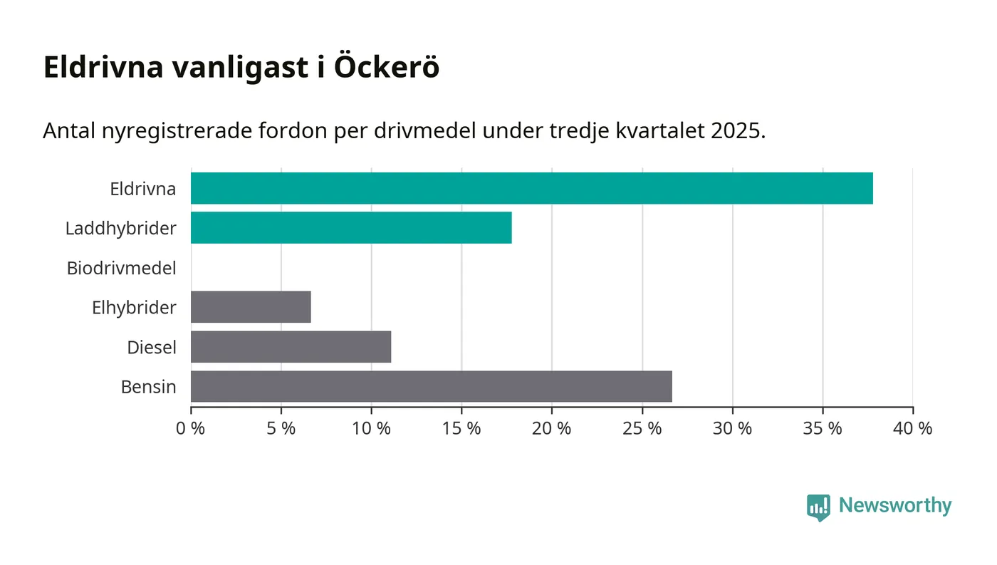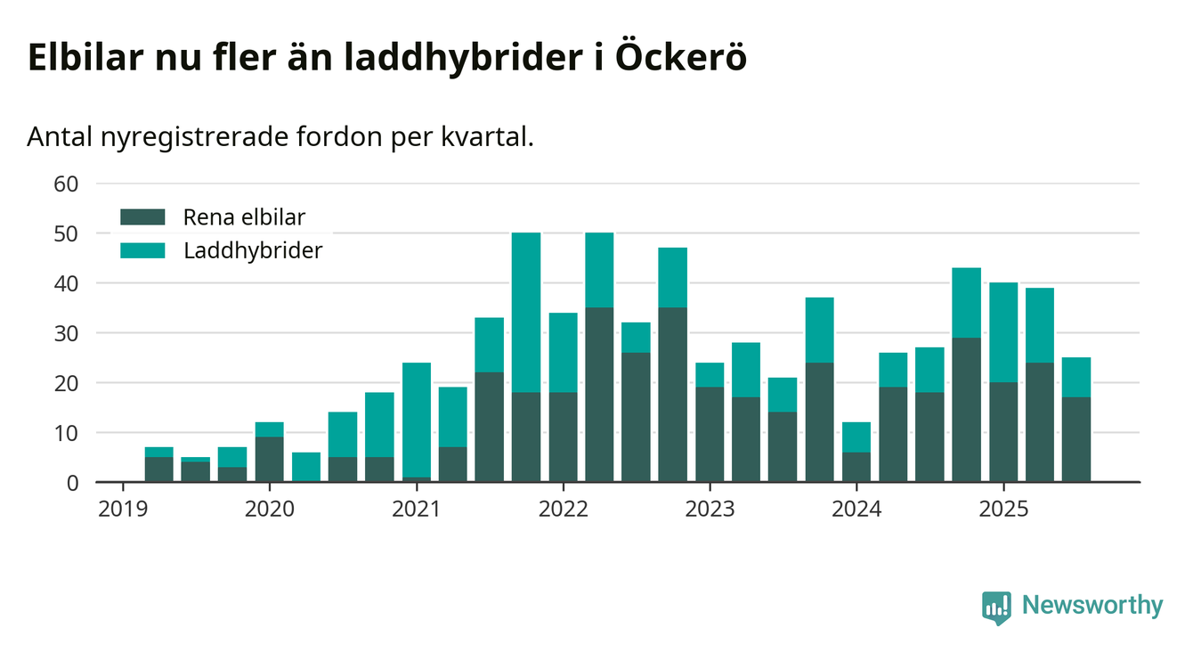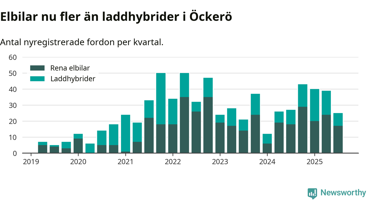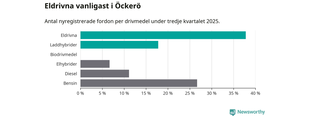 Under tredje kvartalet 2025 var 56 procent av alla nyregistrerade personbilar på Öckerö laddbara (sammanlagt registrerades 45 nya bilar). Merparten av de laddbara bilarna var rena elbilar (38 procent av alla).
